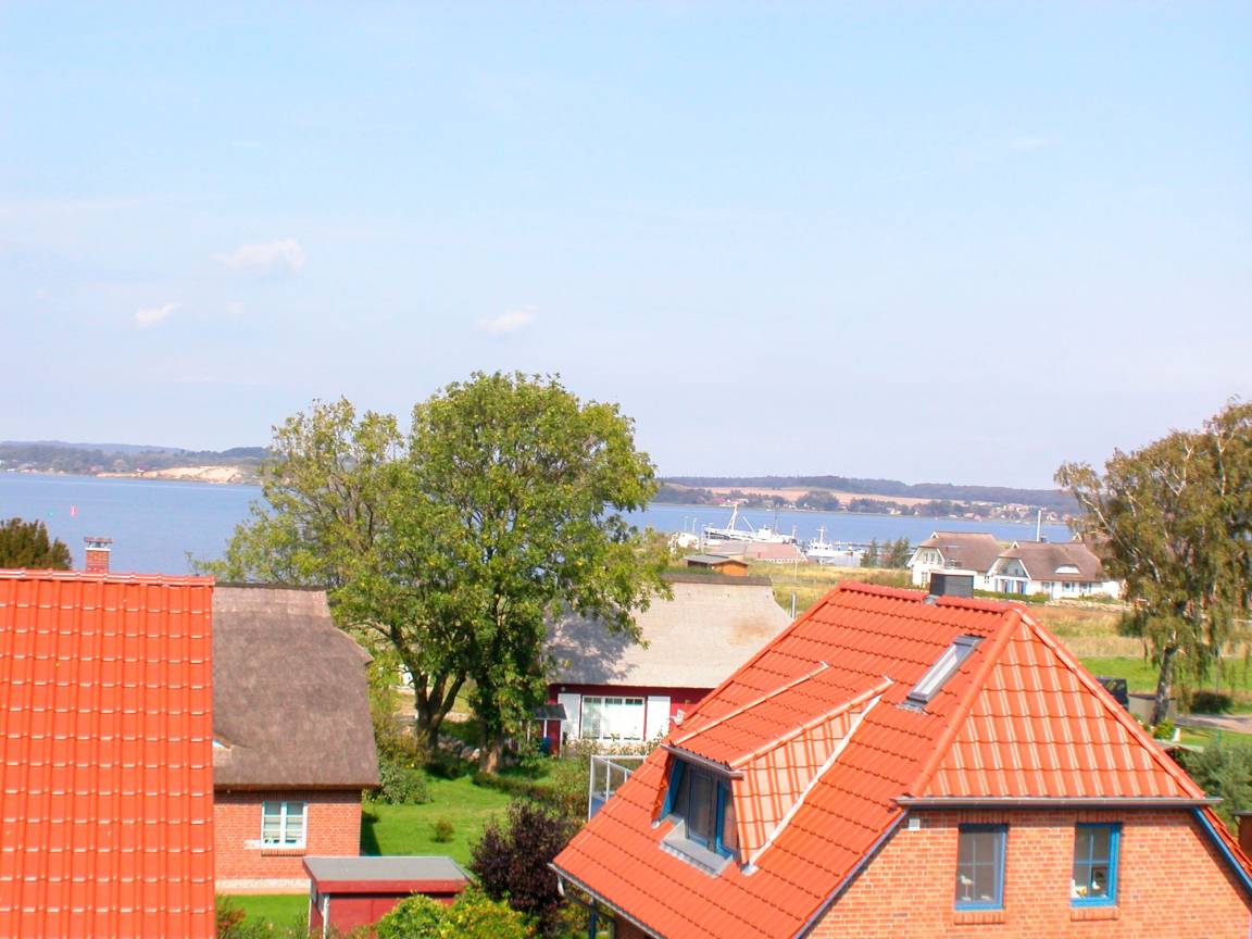 Durch großzügige Sprossen - Fenster kann man den Ausblick von drei der vier Schlafzimmer über den Ortsteil, die ca. 300m entfernte Küste ( Gagersche Wiek) und teils bis zum Yachthafen von Gager genießen.