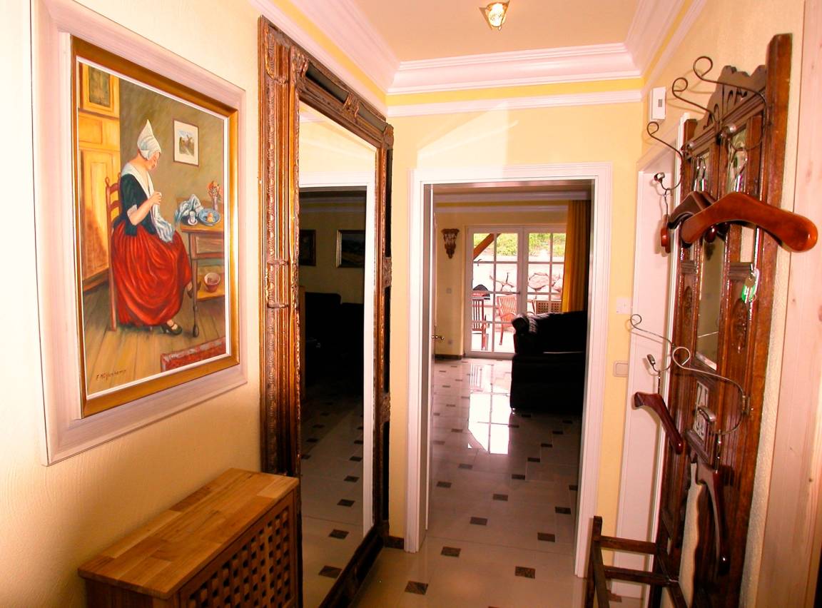 Solar - Fußbodenheizung, großzügiges Wohn- Esszimmer mit Ausgang zur großen Terrasse, schöne Leder-Couchgarnitur mit Opiumtisch, rustikale Speisetafel mit 8 Stühlen, großer Hark-Kaminofen, Holz ist kostenlos und am Haus gestapelt. Antiker Geschirrschrank, SAT-Plasma-Flach-TV mit 50 Zoll = 127cm Großbild, Video - Recorder, Stereoanlage, CD - Player, Kinderhochstuhl, Wände dekoriert mit Bildern, sehr dekorative Beleuchtung.
