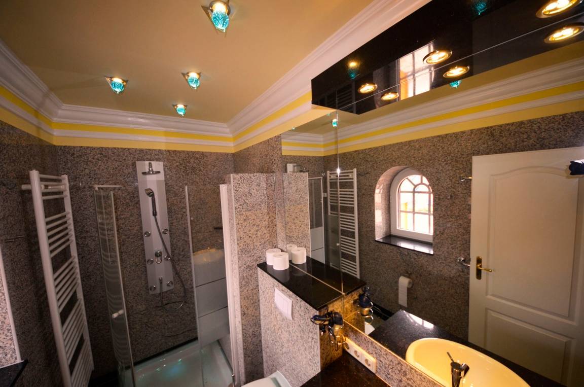 Alle Bäder mit Außenfenstern, beheizbaren Handtuchhaltern, Föhn, Schminkspiegel , schöne Sanitärausstattung in Pergamon. Teilweise Massage-Duschbatterie. Teilweise Sitzgelegenheiten in den großen Duschen, 1x Wanne mit Duschabtrennung. 1 Bad hat ein Doppel-Einbau-Waschbecken mit Granitabdeckung. Die Ausleuchtung der Bäder erfolgt auch über den Waschbecken in moderner LED - Technik.