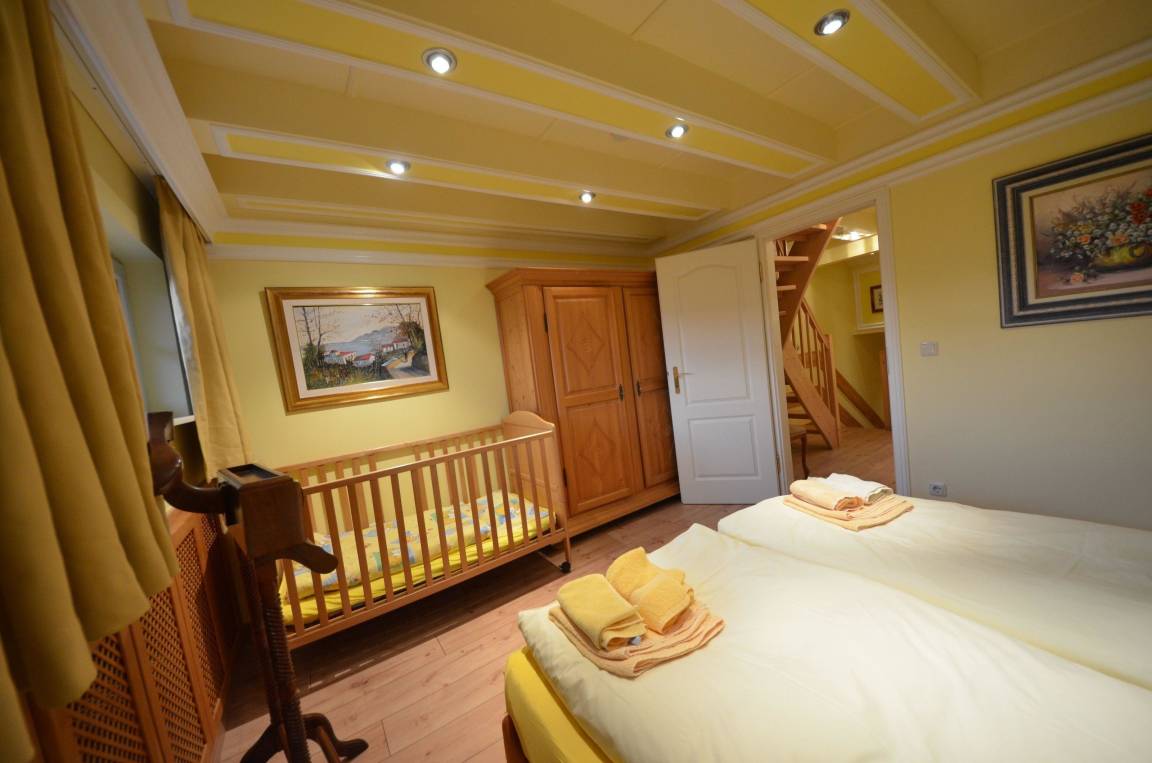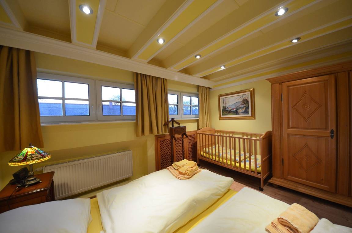 Schlafzimmer ein Babybett 70 x 140 (kostenlos) mit aufgezogener Bettwäsche.