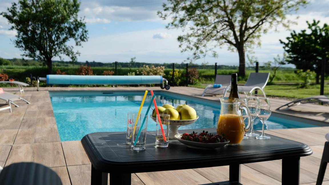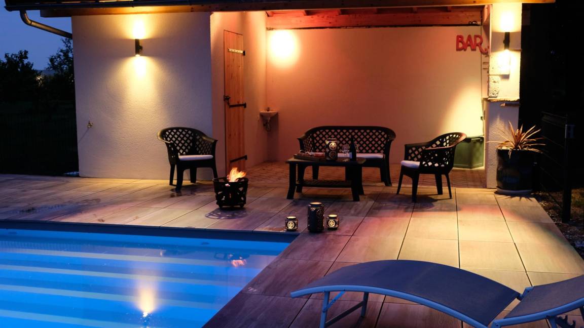 „Le gîte est très bien conçu, fait avec goût et respect des matériaux. Il est très lumineux et très confortable. Aude et Eric sont très sympathiques et nous avons été super bien accueillis. piscine à 28°C toute la semaine un régal. Nous reviendrons !“