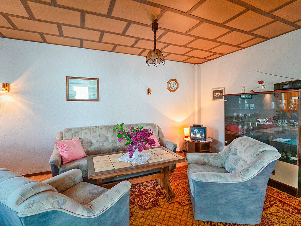 Haus: Zwei großzügige Bungalowhaushälften mit gepflegter, gemütlicher Einrichtung. Zwei Schlafzimmer pro Haushälfte. Heizung über E-Radiatoren. Einladende überdachte Terrasse mit Sitz- und Liegemöbeln. Spiel- und Rasenfläche am Haus. Nichtraucherhaus. 1 Pkw-Stellplatz/Haushälfte. Hinweis: Es handelt sich um Urlaubsunterkünfte, deshalb keine Vermietung an Handwerker bzw. Monteure, Jugendgruppen oder Junggesellenverabschiedungen.