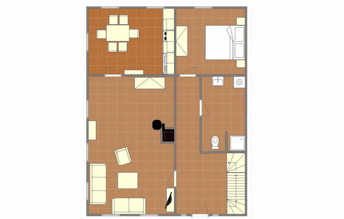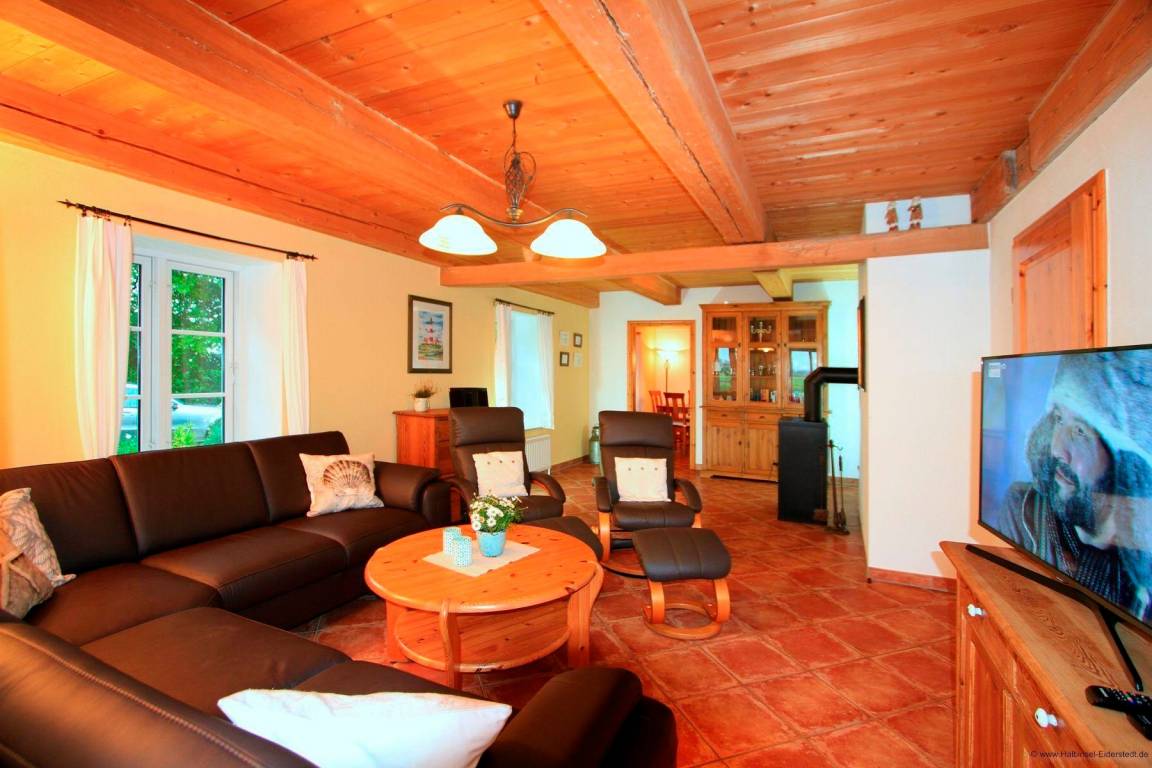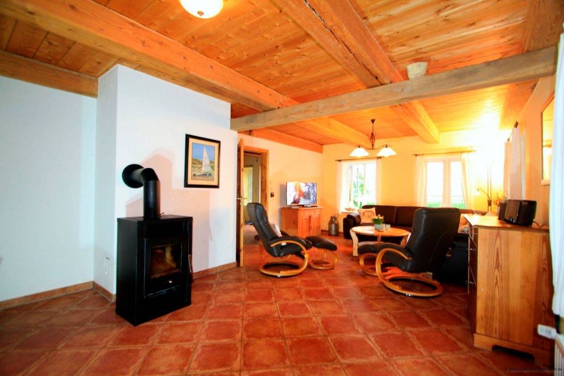 Im hellen Wohnzimmer erwartet Sie eine äußerst bequeme Sitzgarnitur sowie ein Fernseher. Der Kaminofen unterstreicht den wohligen Charakter des Wohnzimmers. Vom Wohnzimmer aus gelangen Sie in die geräumige Küche mit Vollausstattung und großem Esstisch.