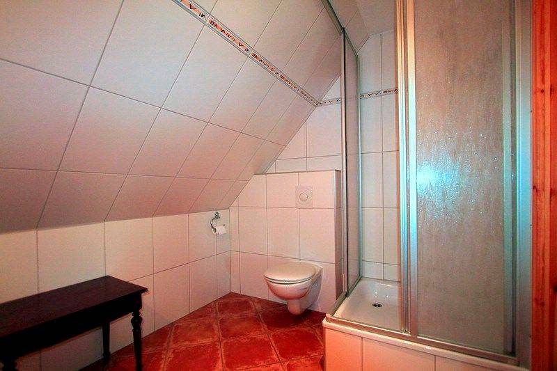 Im Badezimmer mit Dusche, WC und Waschbecken können Sie sich in aller Ruhe erfrischen!