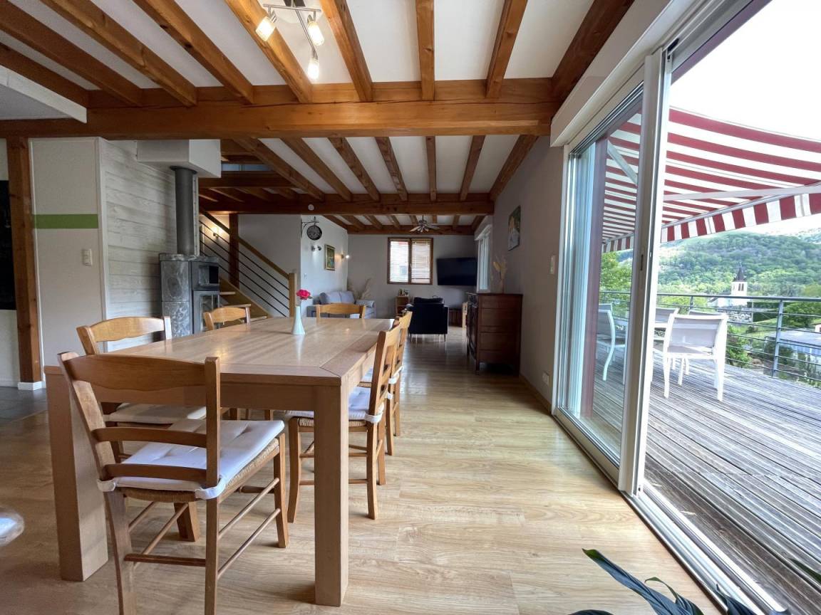 Die große Holzterrasse bietet Ihnen einen schönen Blick auf das Dorf. Es ist mit Gartenmöbeln und Liegestühlen ausgestattet. Parkplatz.