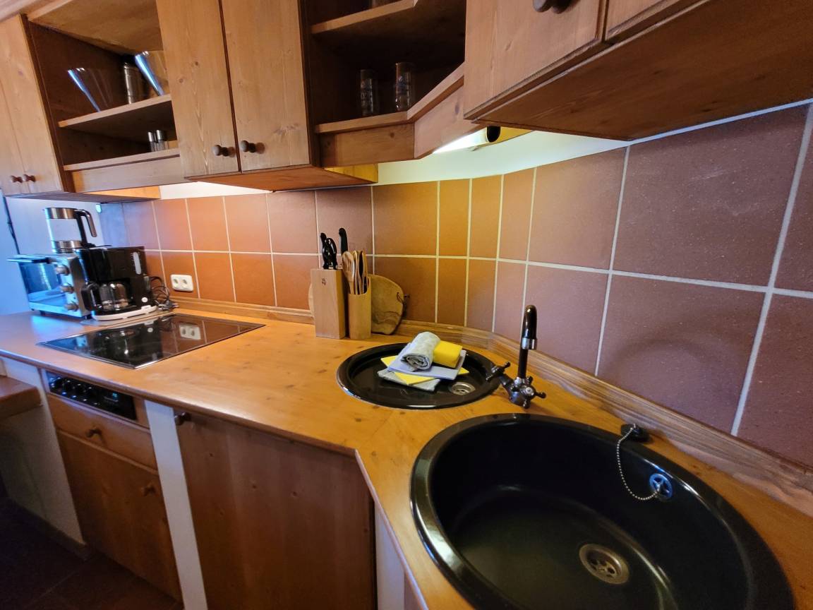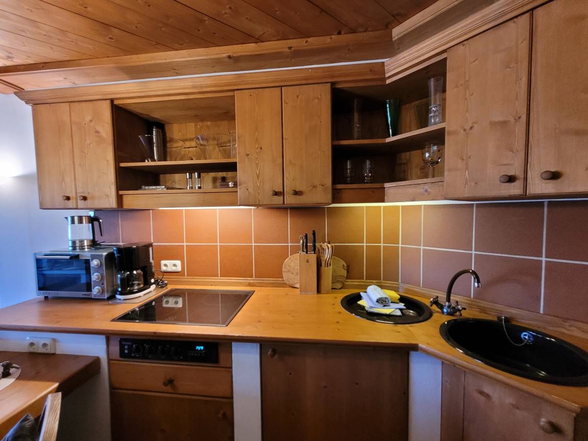 Zum Appartement gehört eine gut ausgestattete Küche mit einem Kühlschrank, einem Kochfeld und einer Mikrowelle.