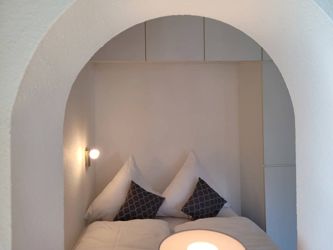 Das kuschelige Bett ist romantisch in einer Nische separiert, durch einen Rundbogen blickt man auf das Wohnzimmer.
