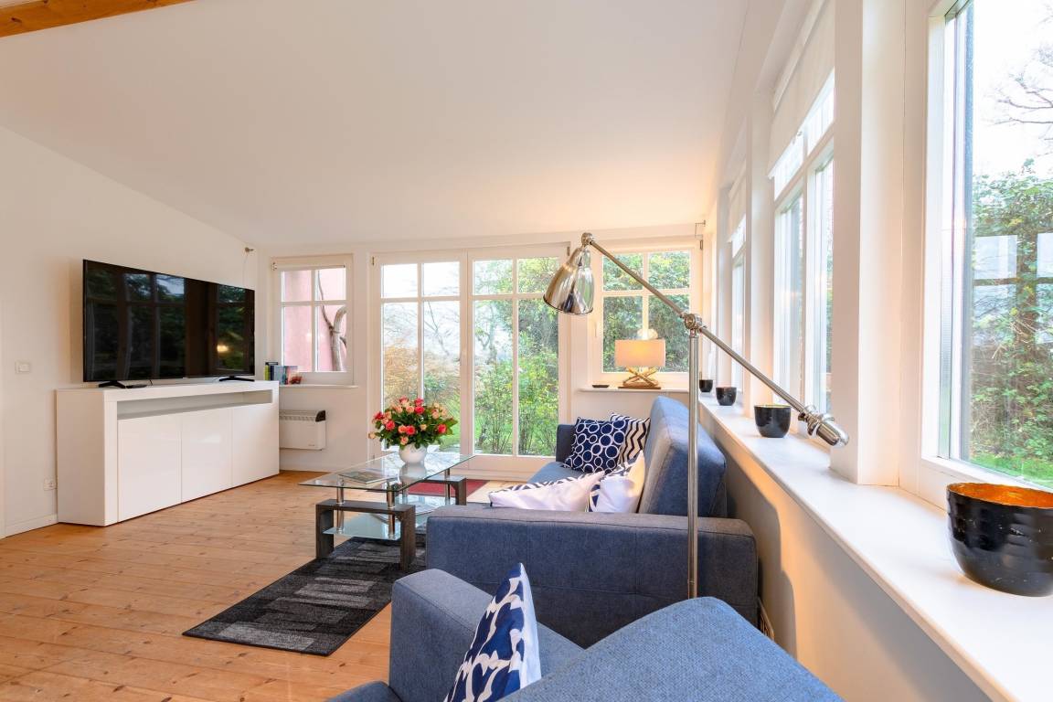 Im Erdgeschoß befindet sich die Ferienwohnung Rosengarten. Das großzügige Appartement besticht durch seinen Wintergarten. Hier haben wir für Sie ein gemütliches Wohnzimmer eingerichtet, von dem Sie einen tollen Blick in den großen Garten haben - oder auf den großen TV-Bildschirm. Die Couch ist ausziehbar, so dass hier eine weitere Person bequem schlafen kann.
