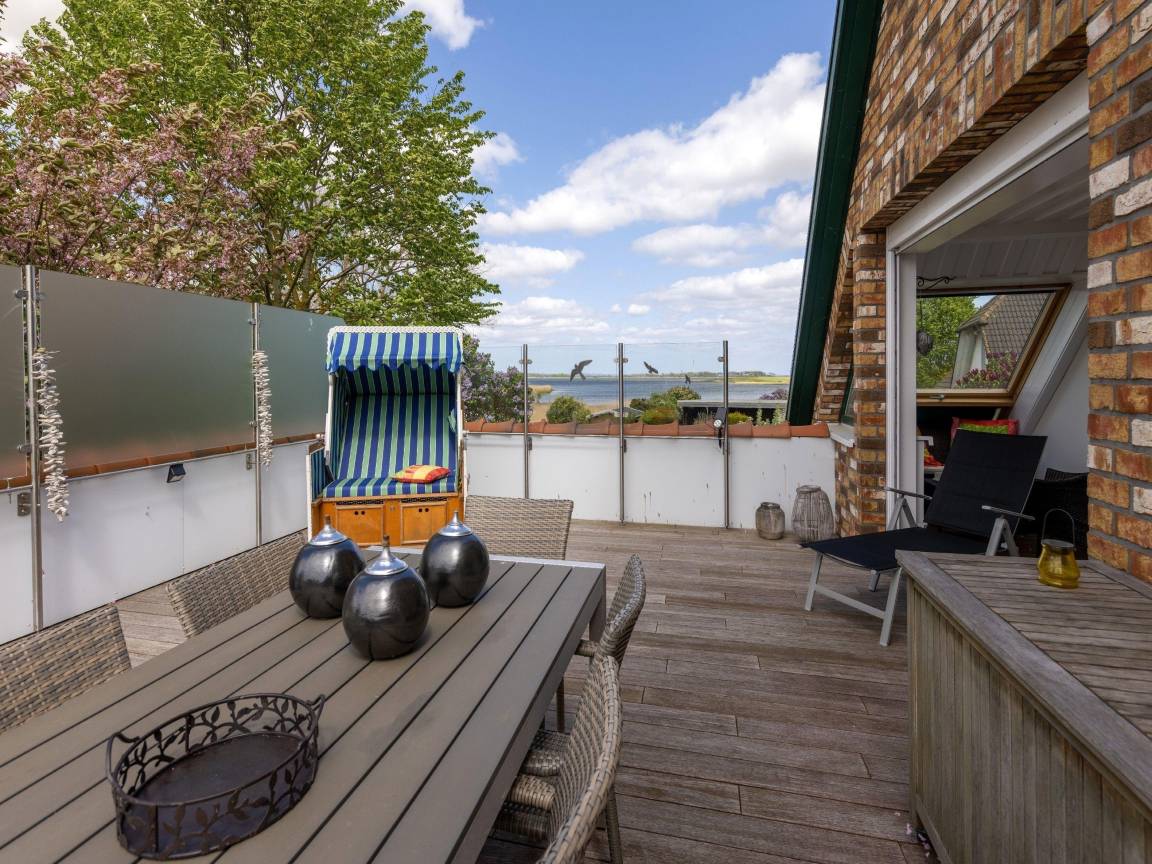 Die große Panorama-Dachterrasse lädt zum Sonnenbaden, Lesen oder Frühstücken mit Wasserblick ein.