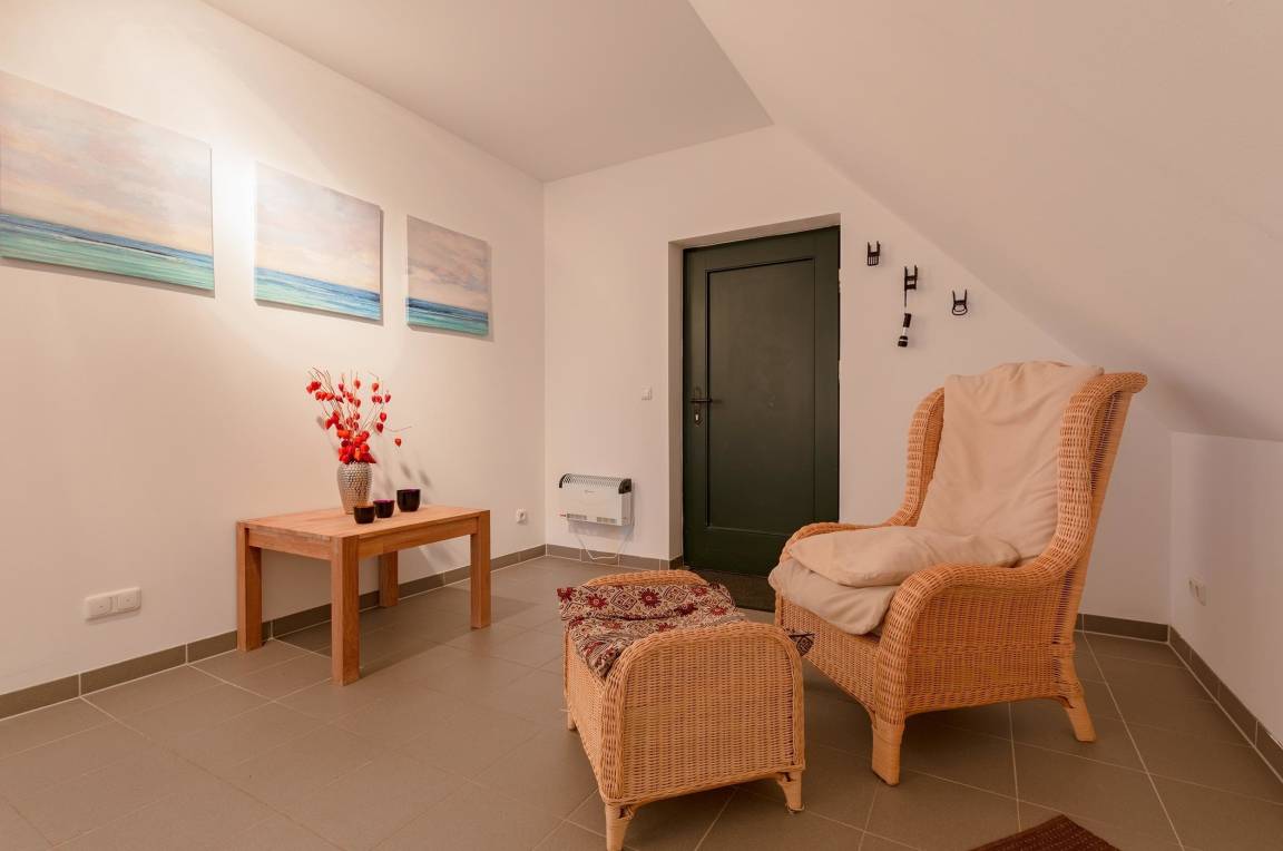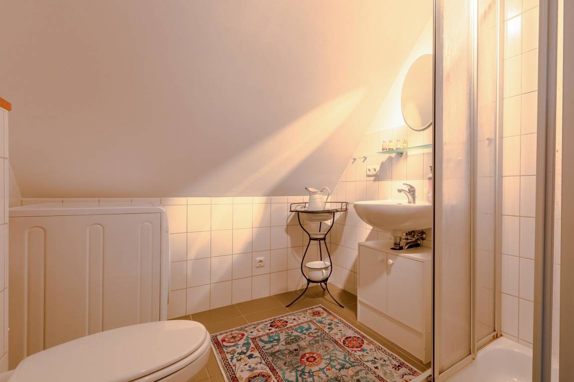 Natürlich können Sie von dieser Wohnung ebenfalls den schönen, großen Garten ausgiebig nutzen. Direkt vor Ihrer Treppe stehen Gartenmöbel und Liegestühle nur für Sie bereit. Außerdem gibt es überall im Garten verteilt Sitz- und Ruheoasen, die Sie ebenfalls gerne nutzen können.