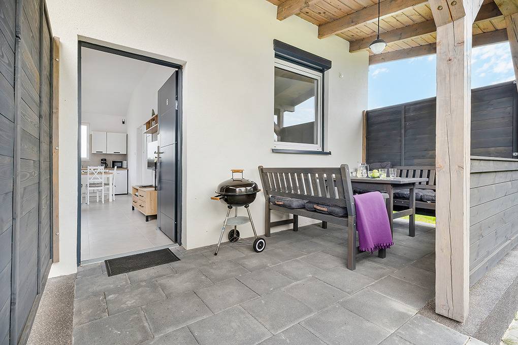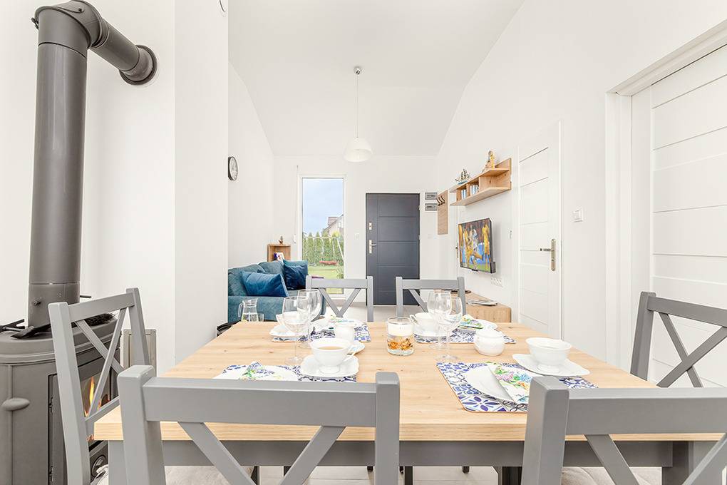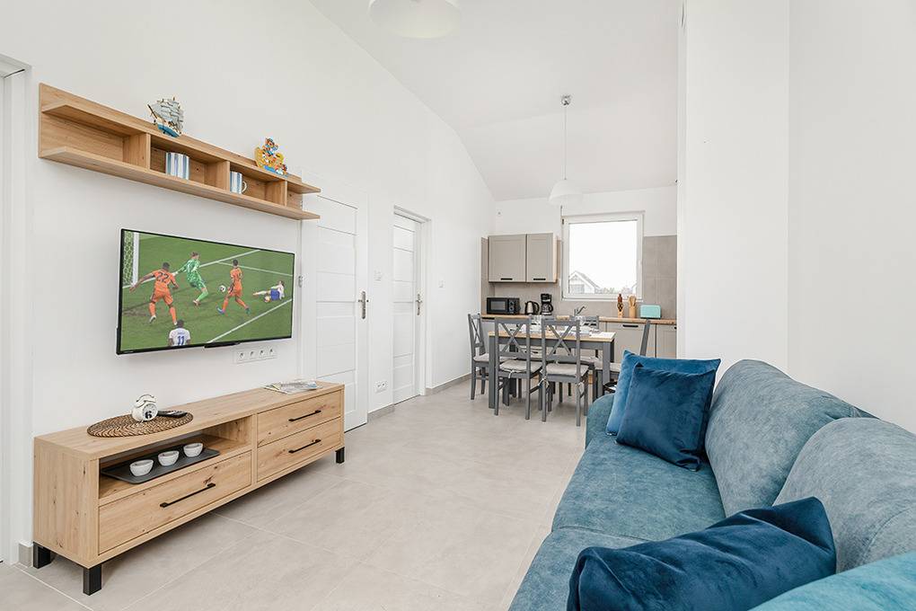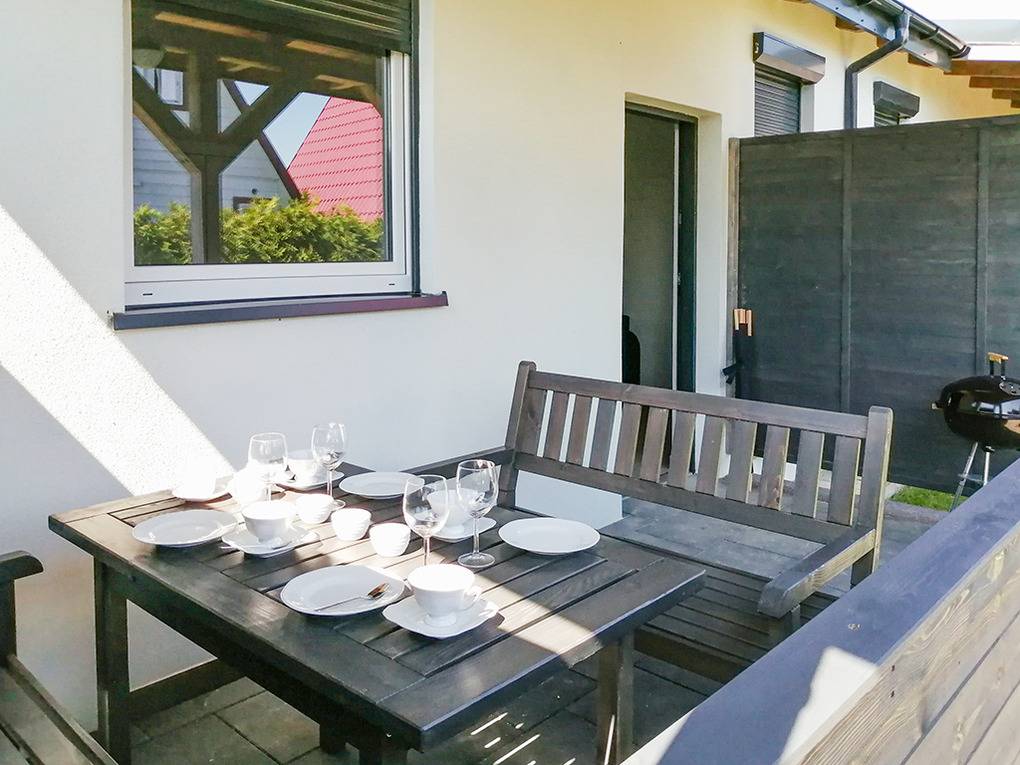 PL 57.14 Ferienhaus 2-4 Pers.: Freundliches 3-Zimmerhaus mit ca. 40 qm Wohnfläche. Wohn-/Essraum, Sitzgarnitur, Sat-TV (deutsche Programme), Esstisch, Küchenzeile (2 Induktionsplatten, Mikrowelle). Doppelzimmer. 2-Bettzimmer. Bad/WC. Terrasse mit Sitzmöbeln.