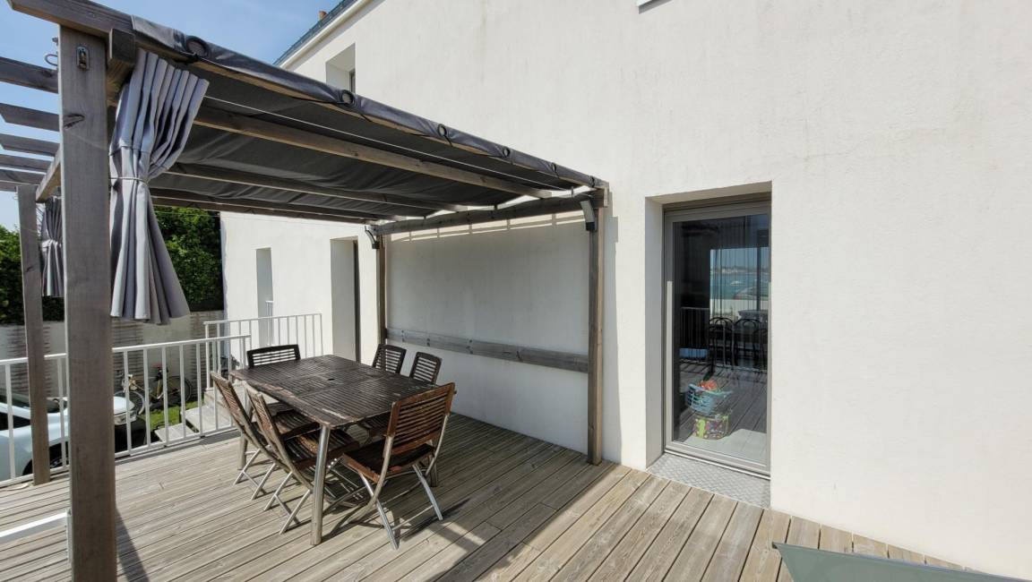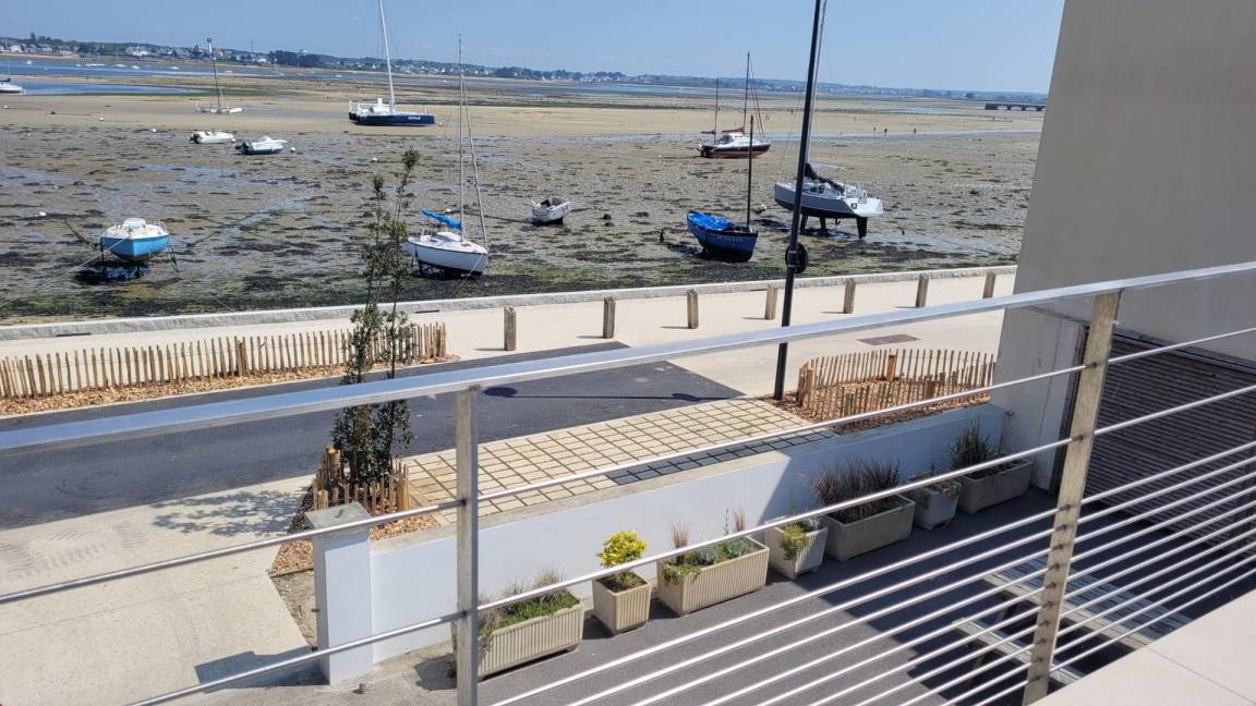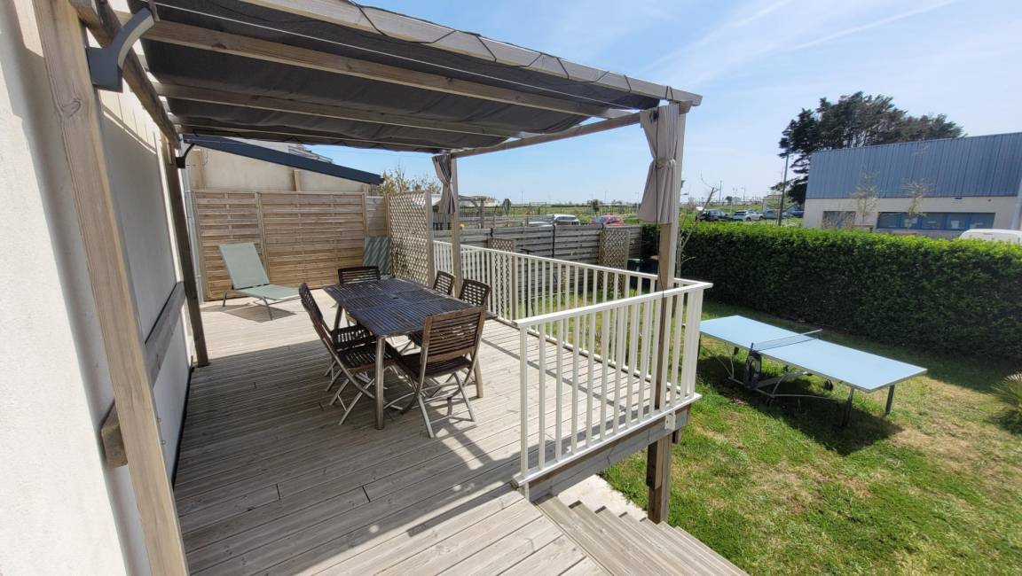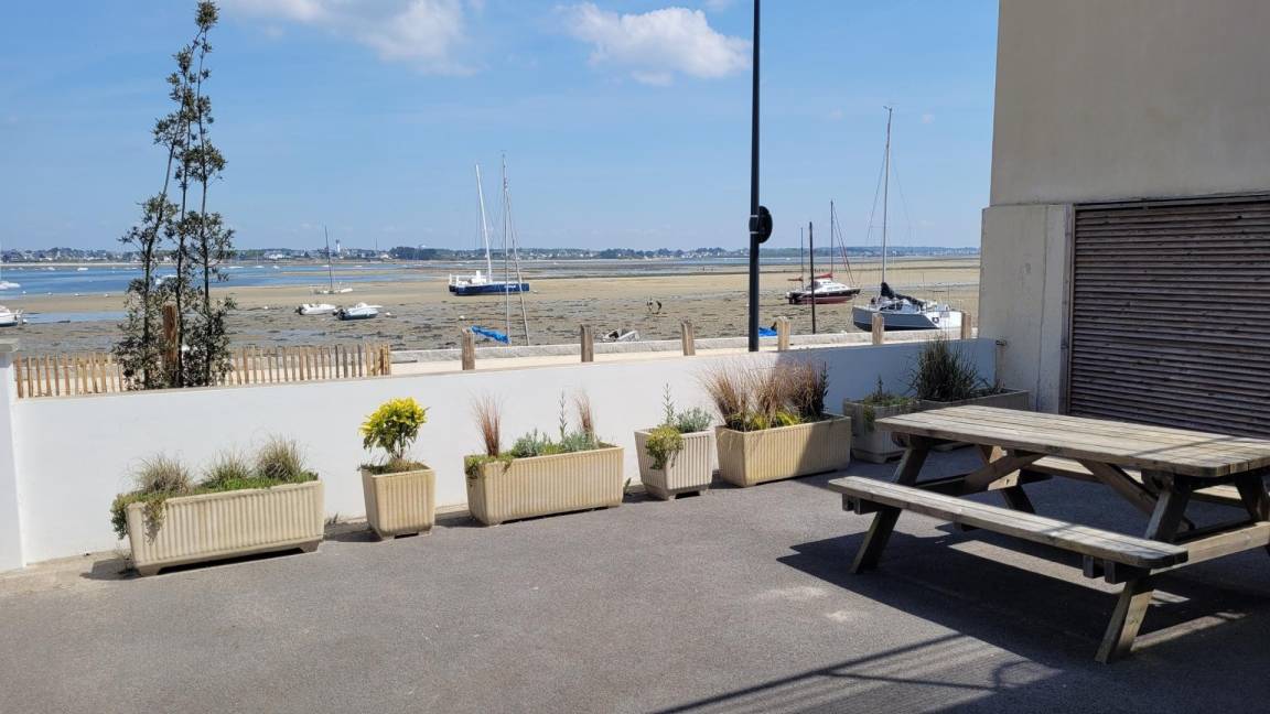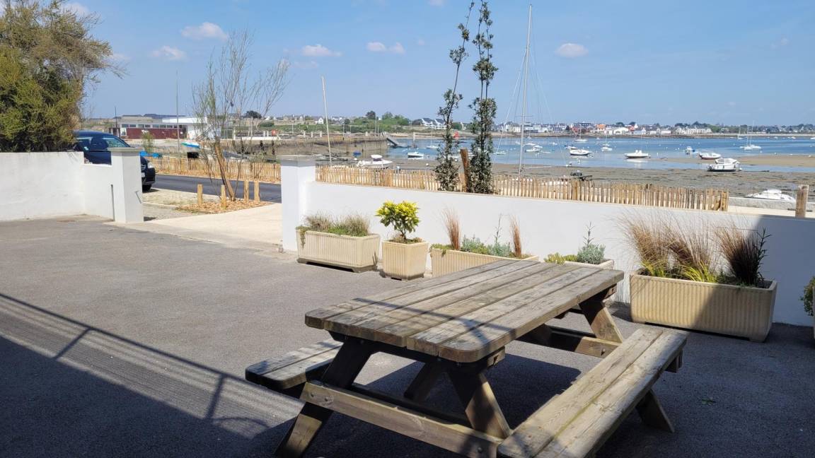 Terrasse an der Vorderseite des Hauses mit Gartentisch mit Blick auf die Promenade und das kleine Meer von Gâvres