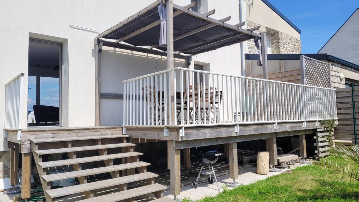Erhöhte Terrasse mit Blick auf den umzäunten Garten auf der Rückseite des Hauses mit Tisch und Stühlen, Grill, Sonnenliegen und Tischtennisplatte