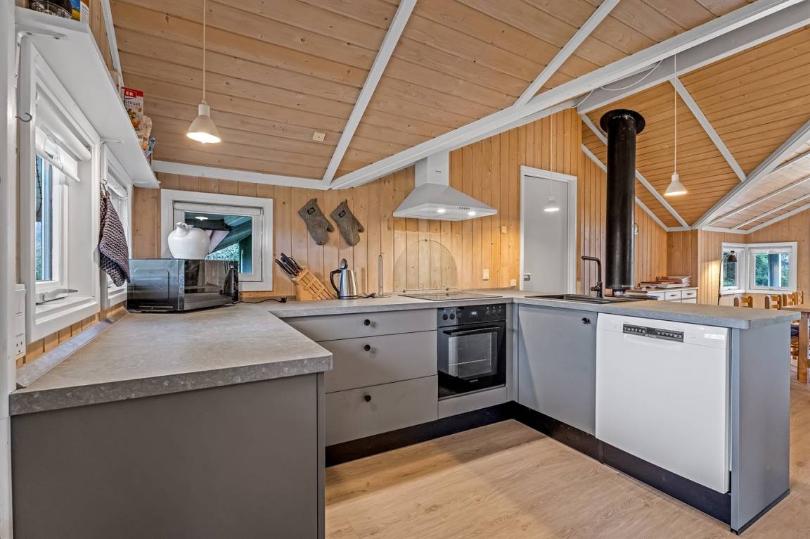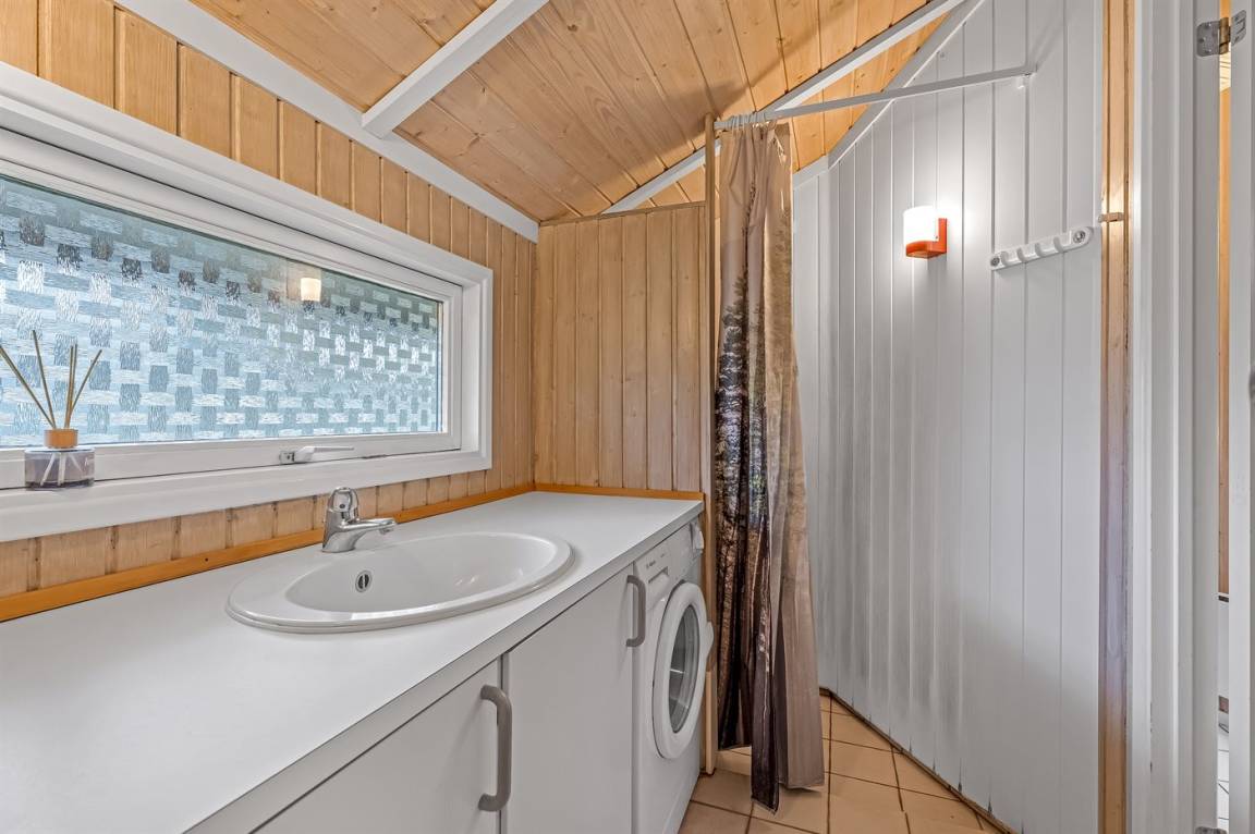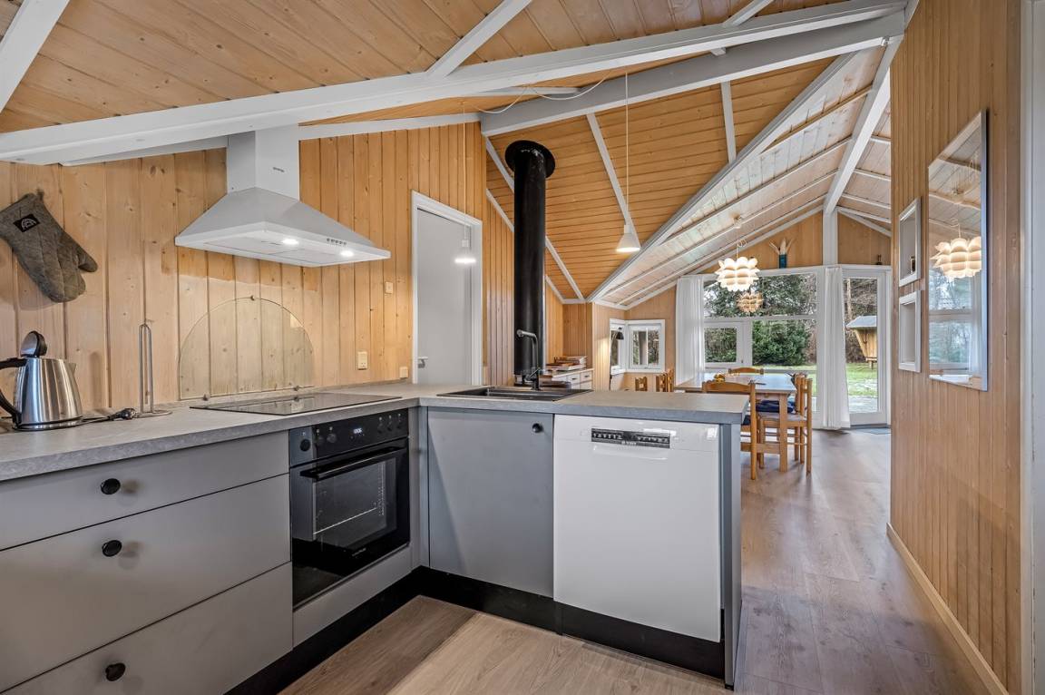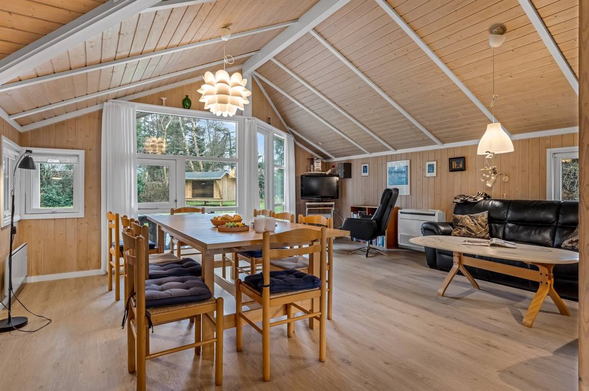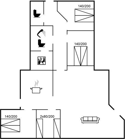 Inneneinrichtung mit Decken und Wänden aus Holz. Teppichboden im Wohnzimmer und in den Zimmern. In der Küche, im Badezimmer und Flur gibt es weißen Fliesenböden. Separate Toilette. Separater Raum mit Duschnische, Waschmaschine und Fußbodenheizung. Von diesem Raum haben Sie Zutritt zur Sauna des Hauses. Gut funktionierende Küche, die mit u. a. Mikrowelle, Tiefkühlgerät, Warmluftofen und Herd mit Ceran-Feld und Geschirrspüler ausgestattet ist. Das Wohnzimmer ist mit Kaminofen, TV und Stereoanlage mit CD-Spieler eingerichtet. Kostenlose kabellose Internetverbindung vorh. (Computer ist mitzubringen). Die Schlafplätze verteilen sich auf 3 Zimmer mit Doppelbett und 1 Zimmer mit 2 Einzelbetten.