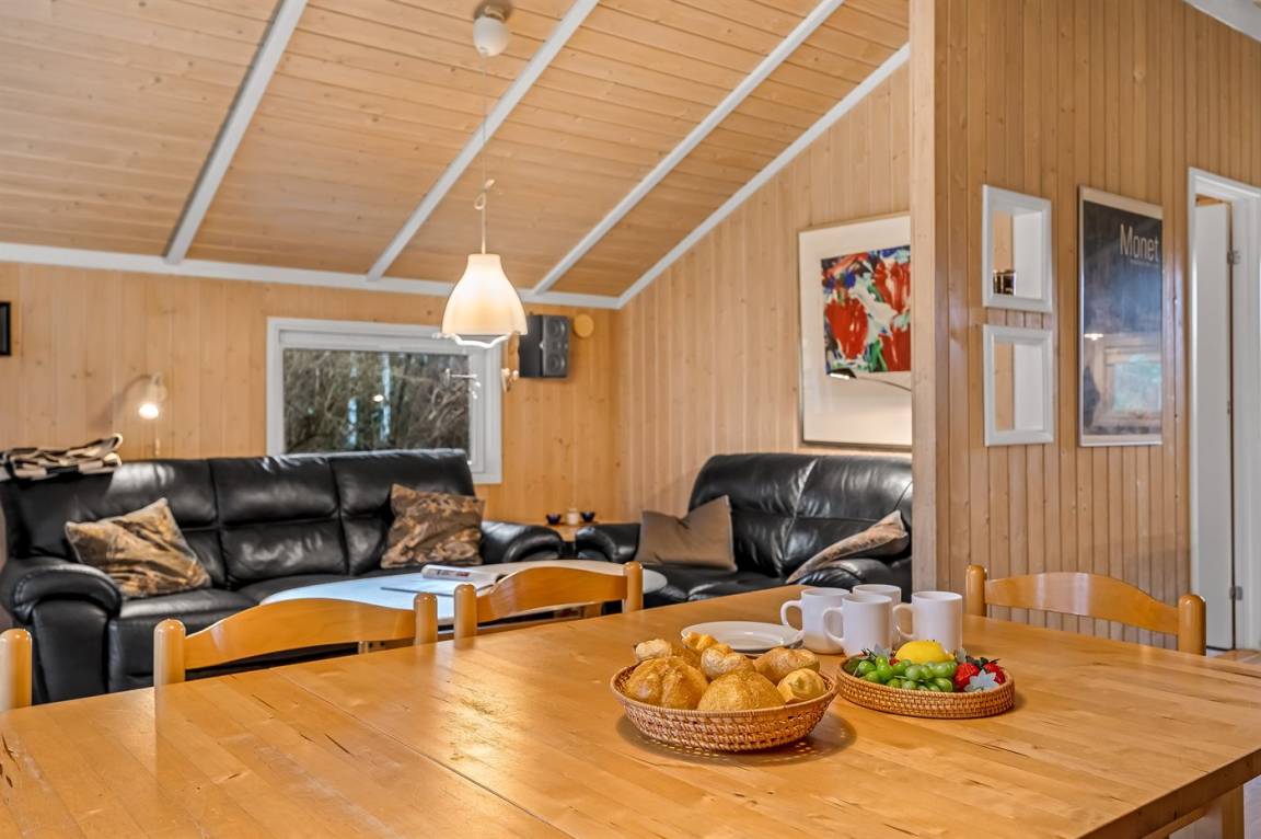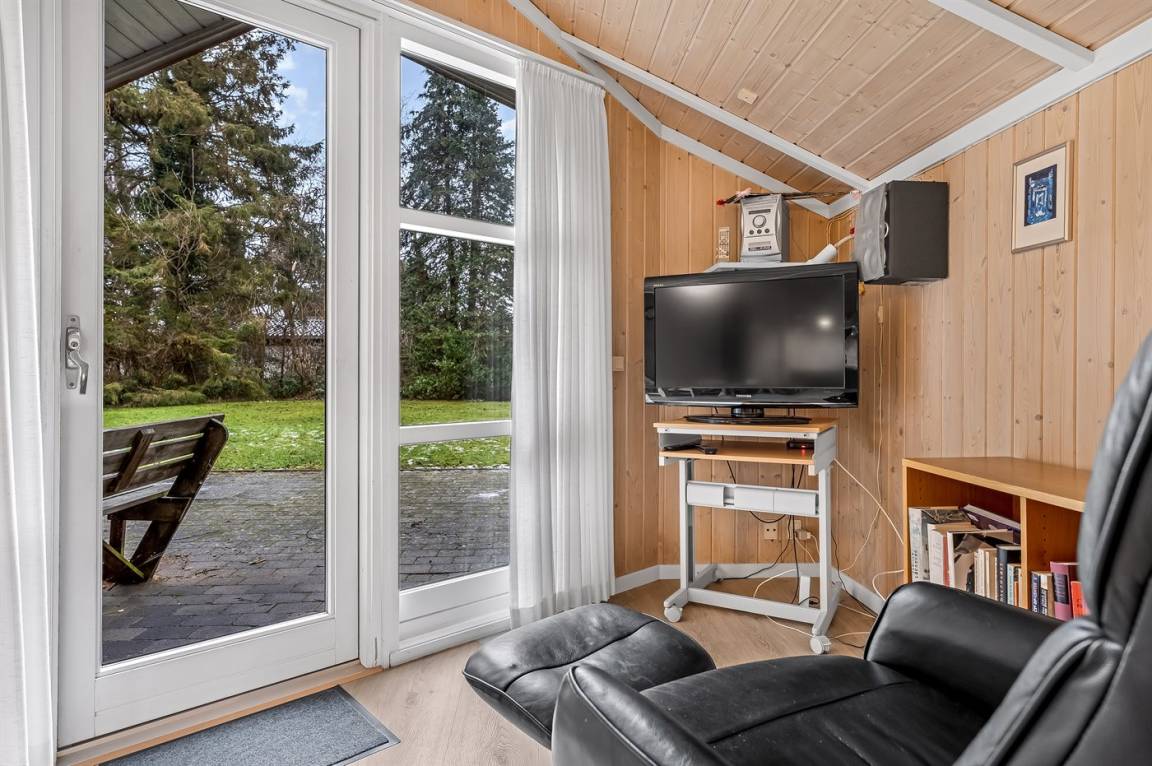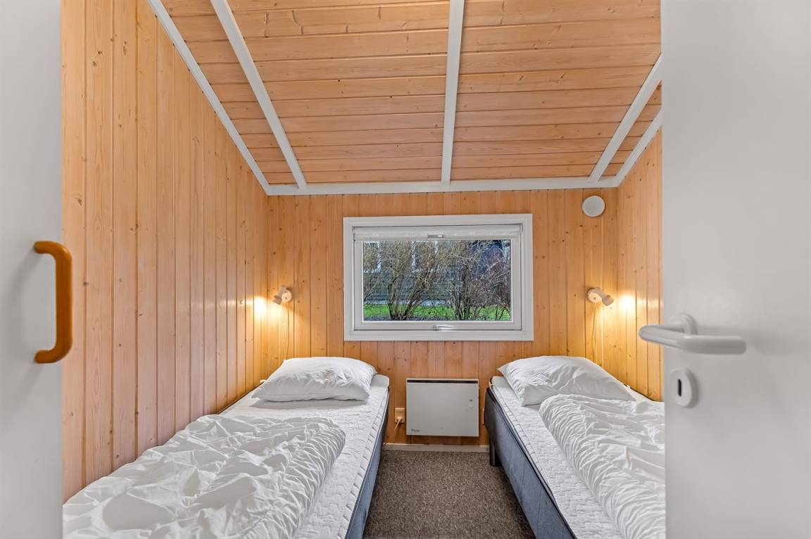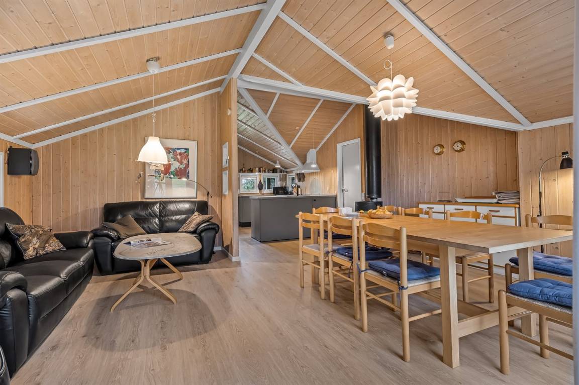 Inneneinrichtung mit Decken und Wänden aus Holz. Teppichboden im Wohnzimmer und in den Zimmern. In der Küche, im Badezimmer und Flur gibt es weißen Fliesenböden. Separate Toilette. Separater Raum mit Duschnische, Waschmaschine und Fußbodenheizung. Von diesem Raum haben Sie Zutritt zur Sauna des Hauses. Gut funktionierende Küche, die mit u. a. Mikrowelle, Tiefkühlgerät, Warmluftofen und Herd mit Ceran-Feld und Geschirrspüler ausgestattet ist. Das Wohnzimmer ist mit Kaminofen, TV und Stereoanlage mit CD-Spieler eingerichtet. Kostenlose kabellose Internetverbindung vorh. (Computer ist mitzubringen). Die Schlafplätze verteilen sich auf 3 Zimmer mit Doppelbett und 1 Zimmer mit 2 Einzelbetten.