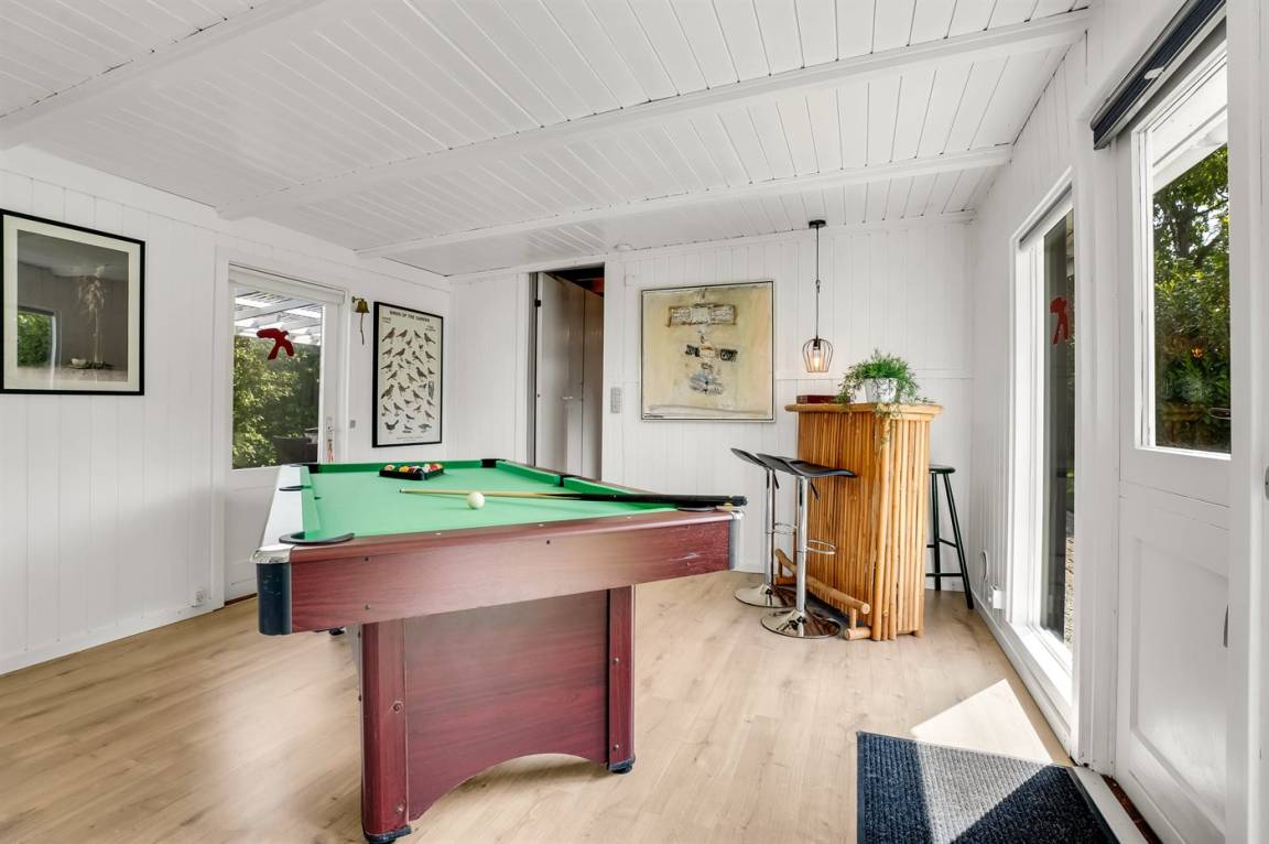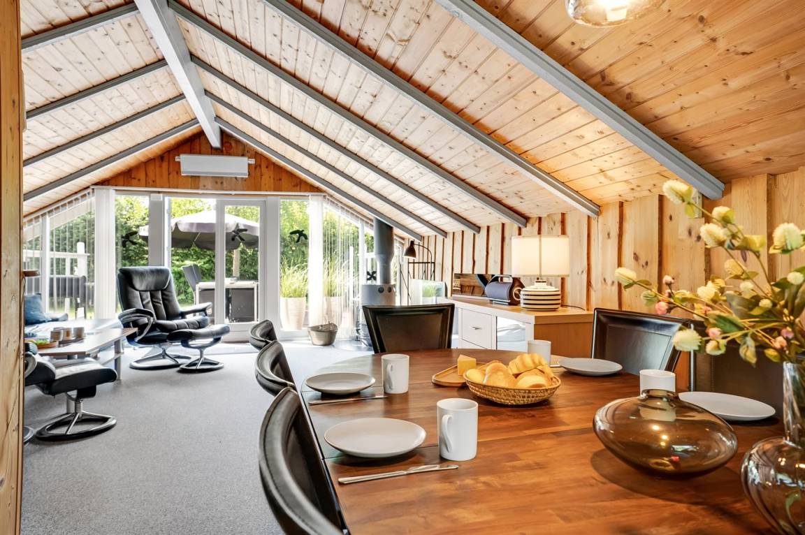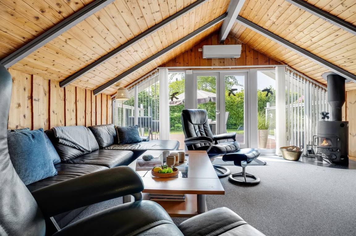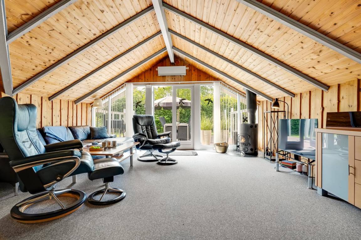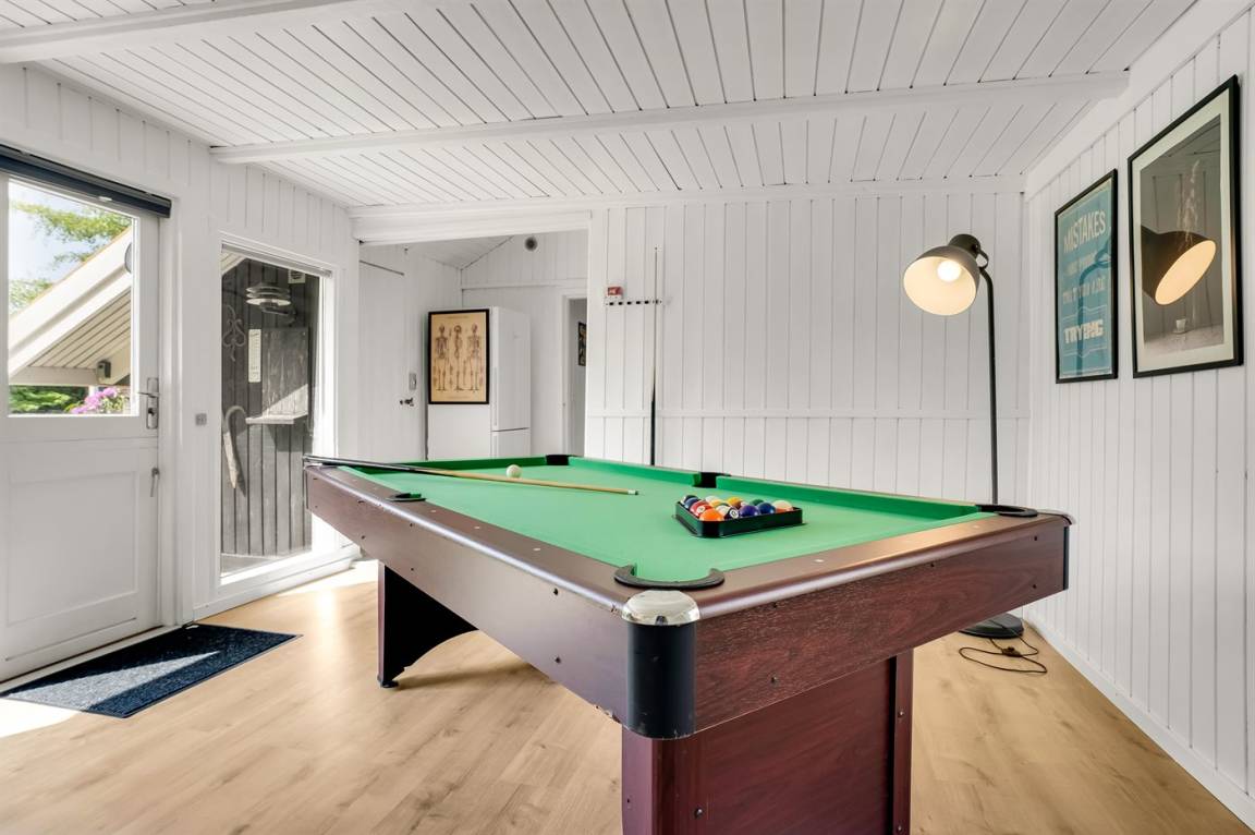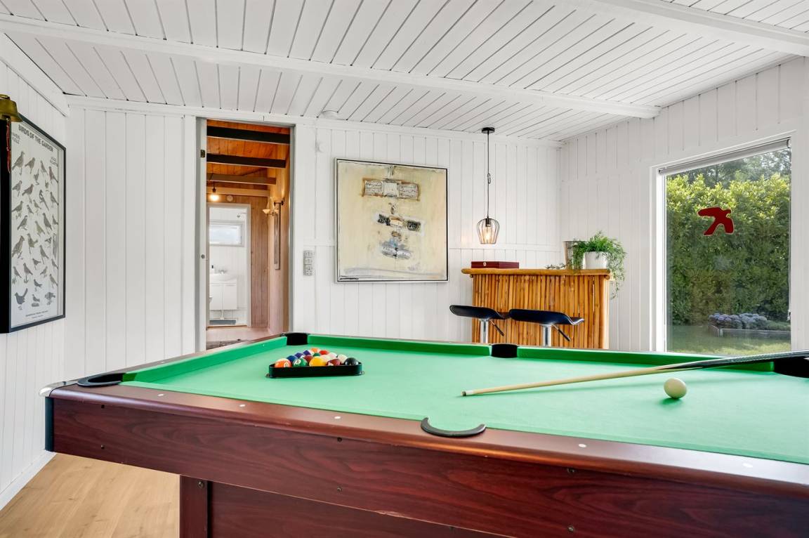 Ein sehr gemütliches Ferienhaus mit leicht versetztem Grundriss. Das Haus ist so eingerichtet, dass sich in der Mitte ein Raum/Wintergarten befindet, der als Aktivitätsraum dient – mit Dartscheibe, Billardtisch und einer kleinen Bar. Im Haus gibt es einen schönen Kaminofen, der eine angenehme und gemütliche Wärmequelle ist, sowie zwei Luft-Luft-Wärmepumpen.