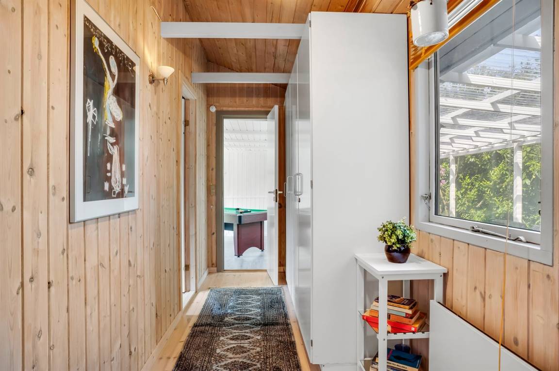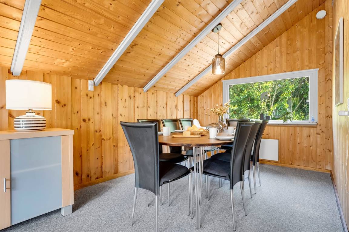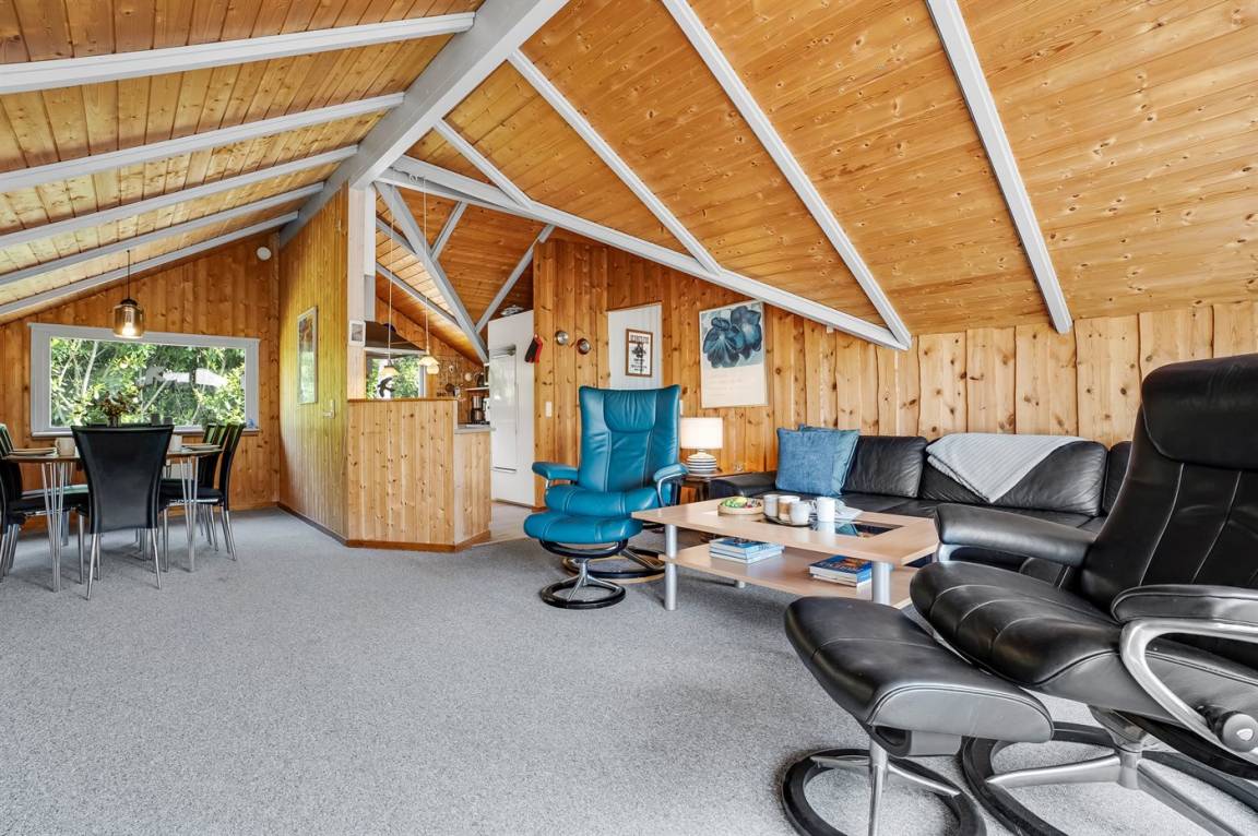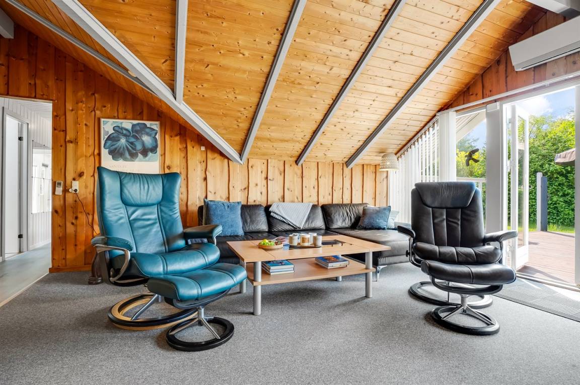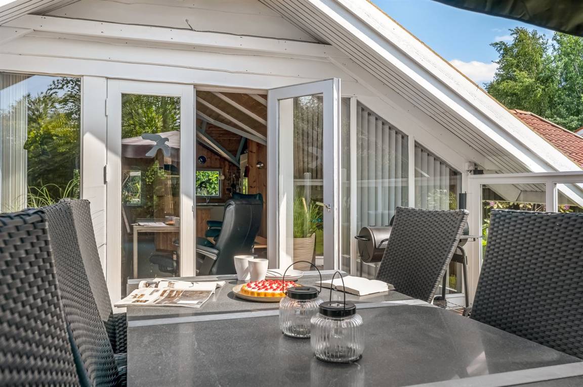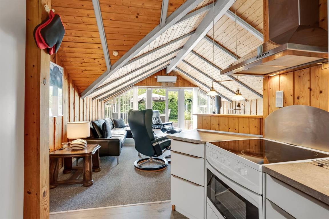 Ein sehr gemütliches Ferienhaus mit leicht versetztem Grundriss. Das Haus ist so eingerichtet, dass sich in der Mitte ein Raum/Wintergarten befindet, der als Aktivitätsraum dient – mit Dartscheibe, Billardtisch und einer kleinen Bar. Im Haus gibt es einen schönen Kaminofen, der eine angenehme und gemütliche Wärmequelle ist, sowie zwei Luft-Luft-Wärmepumpen.