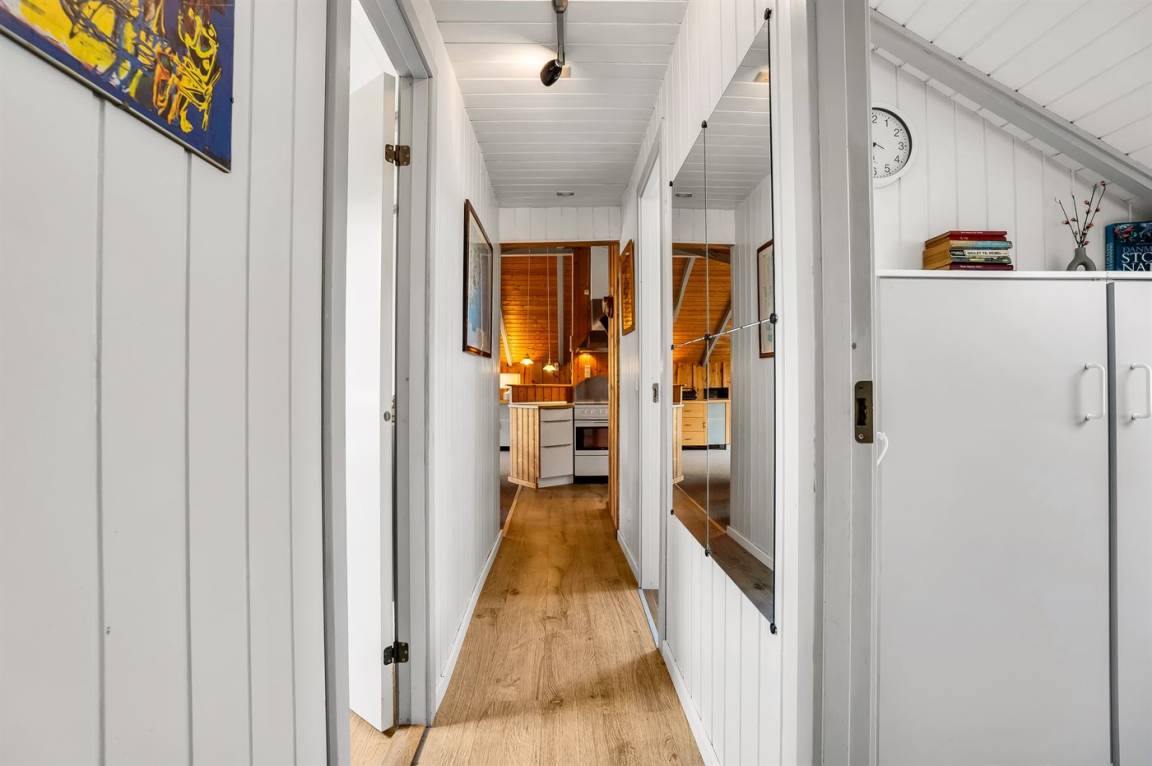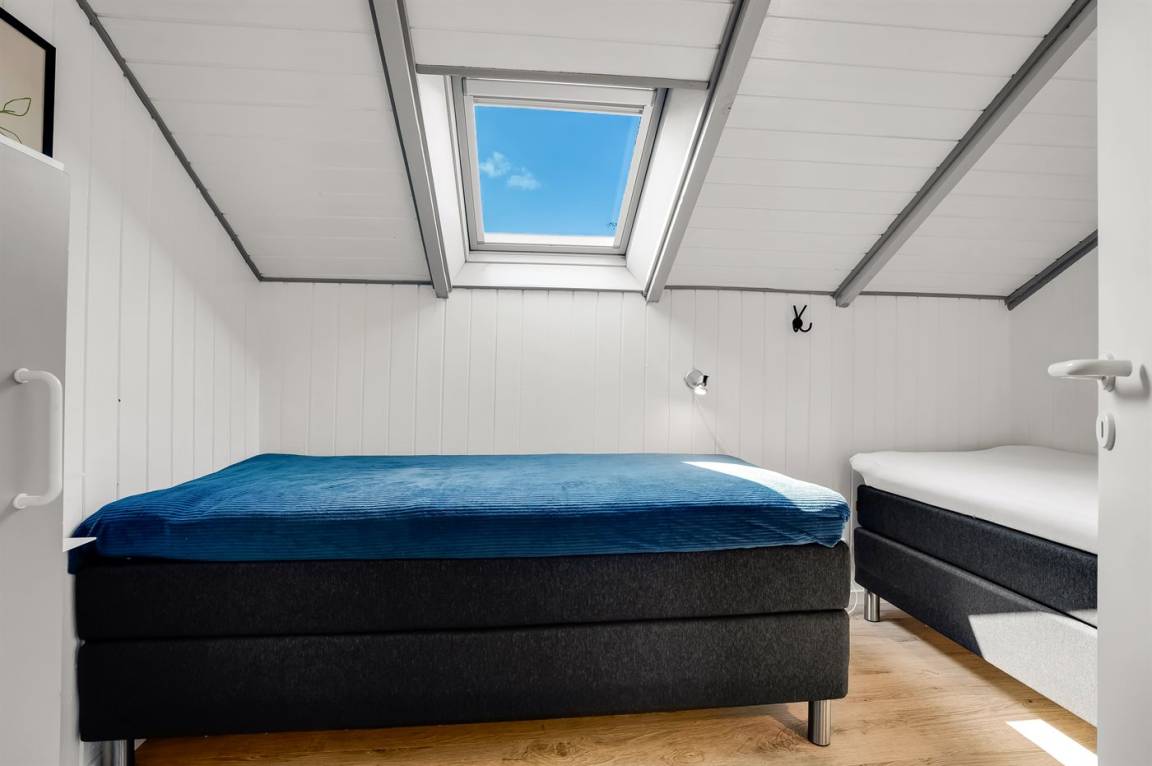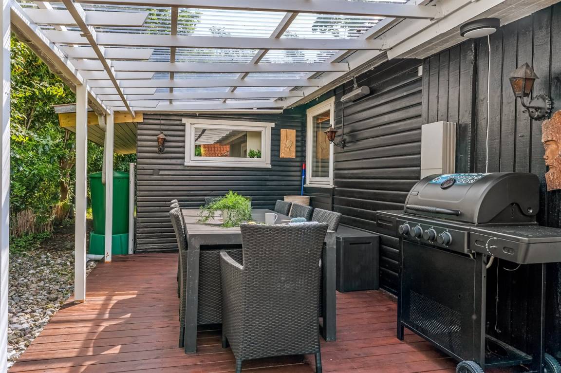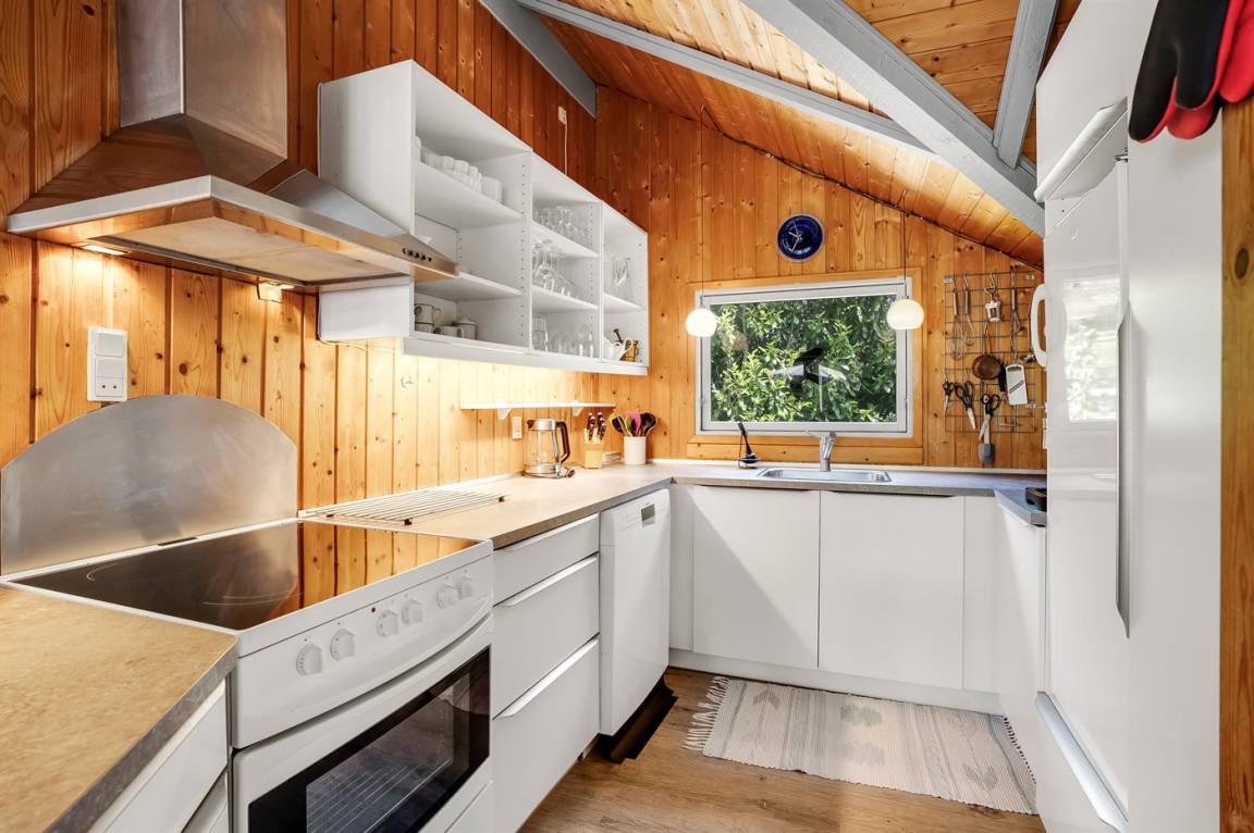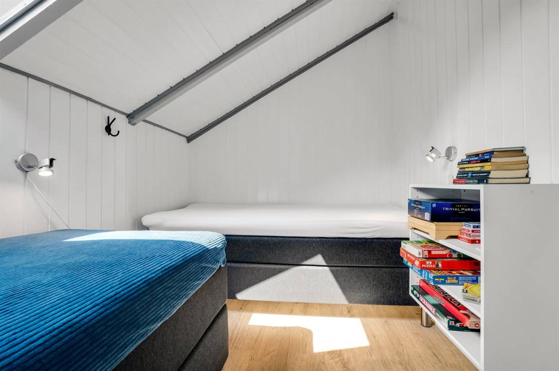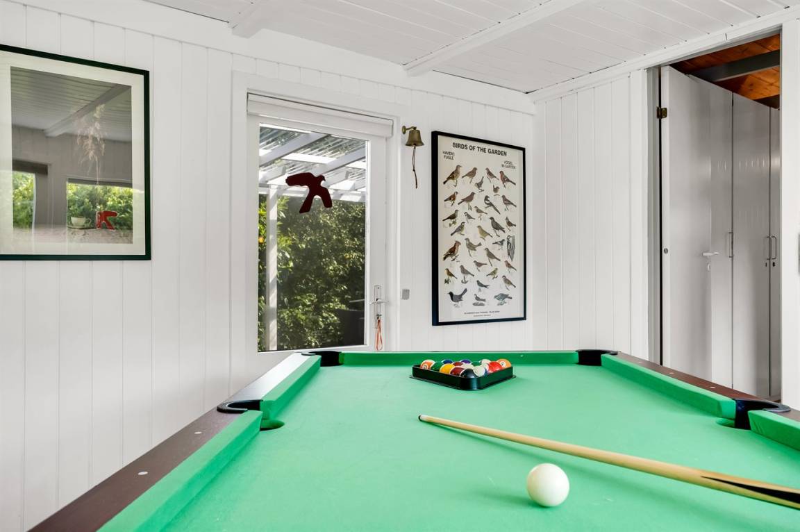 Ein sehr gemütliches Ferienhaus mit leicht versetztem Grundriss. Das Haus ist so eingerichtet, dass sich in der Mitte ein Raum/Wintergarten befindet, der als Aktivitätsraum dient – mit Dartscheibe, Billardtisch und einer kleinen Bar. Im Haus gibt es einen schönen Kaminofen, der eine angenehme und gemütliche Wärmequelle ist, sowie zwei Luft-Luft-Wärmepumpen.