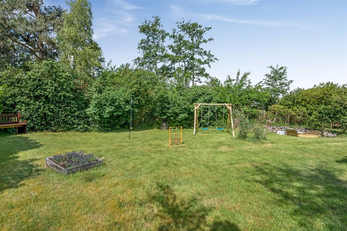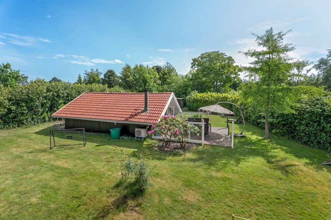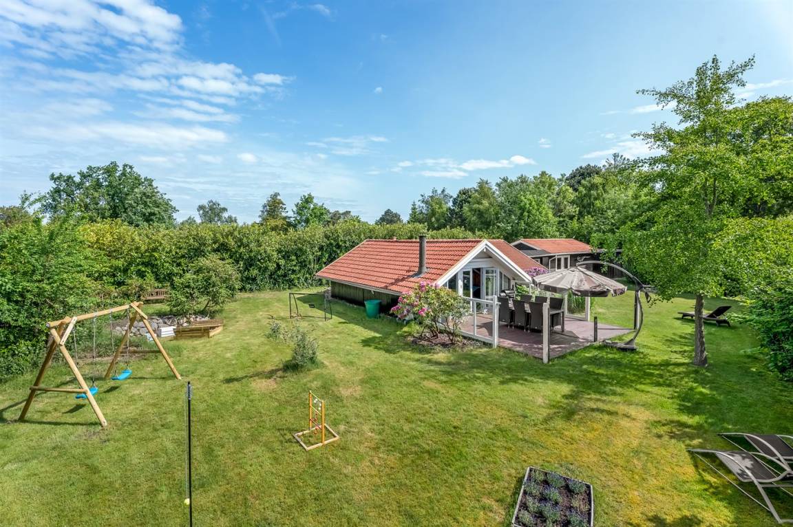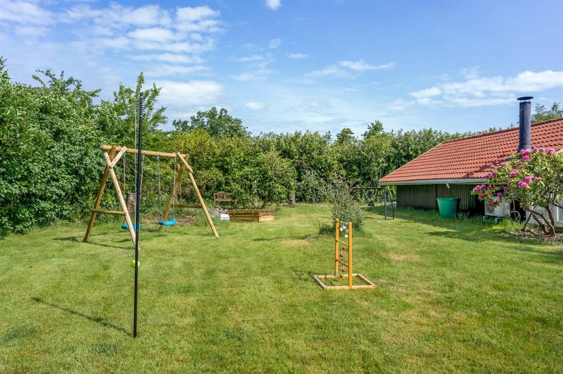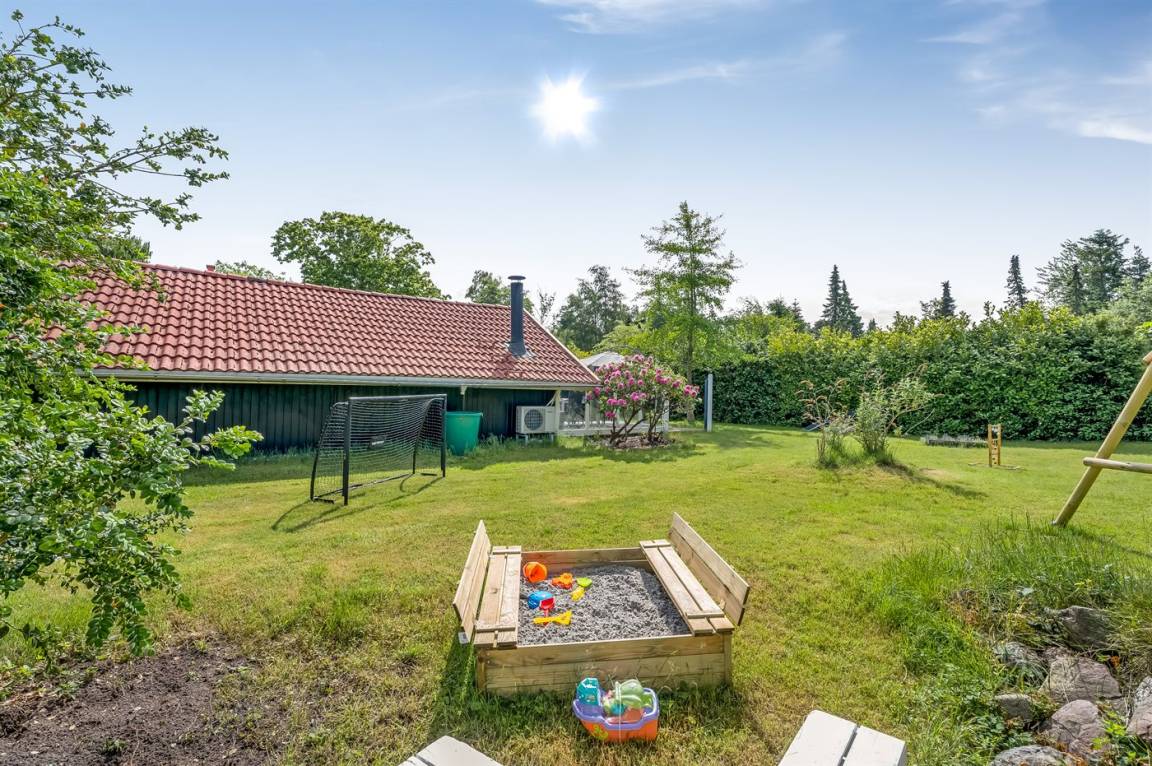 Das Ferienhaus verfügt über zwei schöne Terrassen – eine überdachte und eine offene. Es gibt viele windgeschützte Ecken, und das Grundstück liegt ungestört. Im Garten findest du Sandkasten, Schaukel, Fußballtor, Trampolin und Lagerfeuerstelle.
