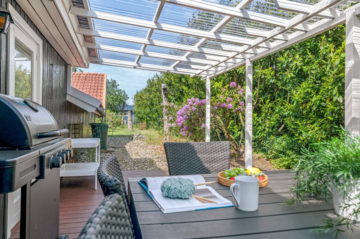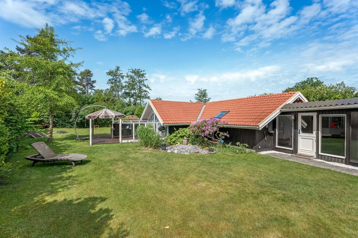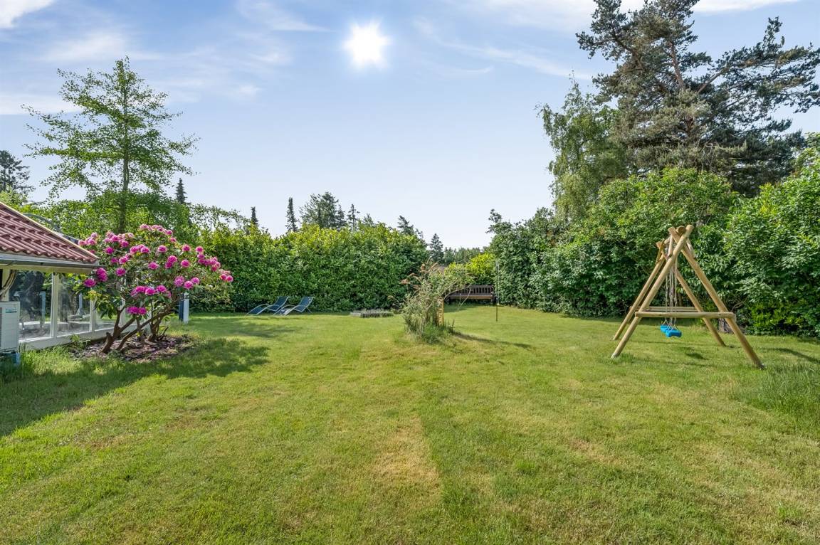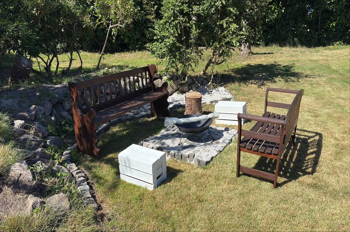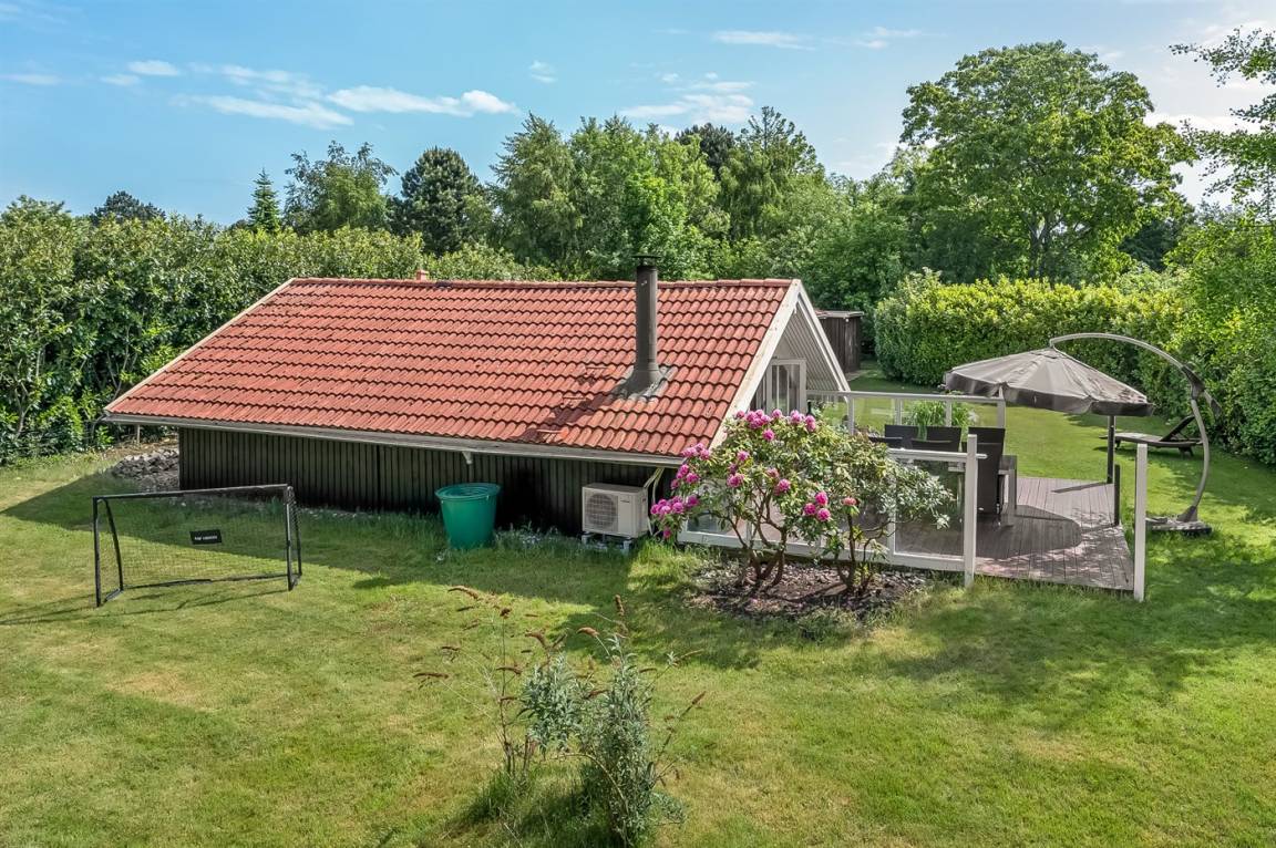 Das Ferienhaus verfügt über zwei schöne Terrassen – eine überdachte und eine offene. Es gibt viele windgeschützte Ecken, und das Grundstück liegt ungestört. Im Garten findest du Sandkasten, Schaukel, Fußballtor, Trampolin und Lagerfeuerstelle.