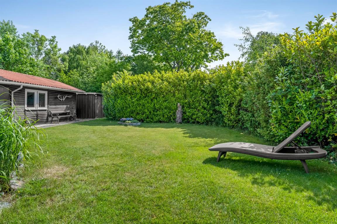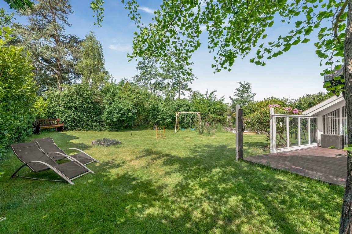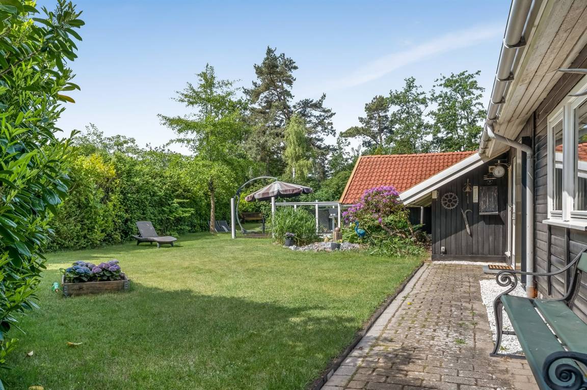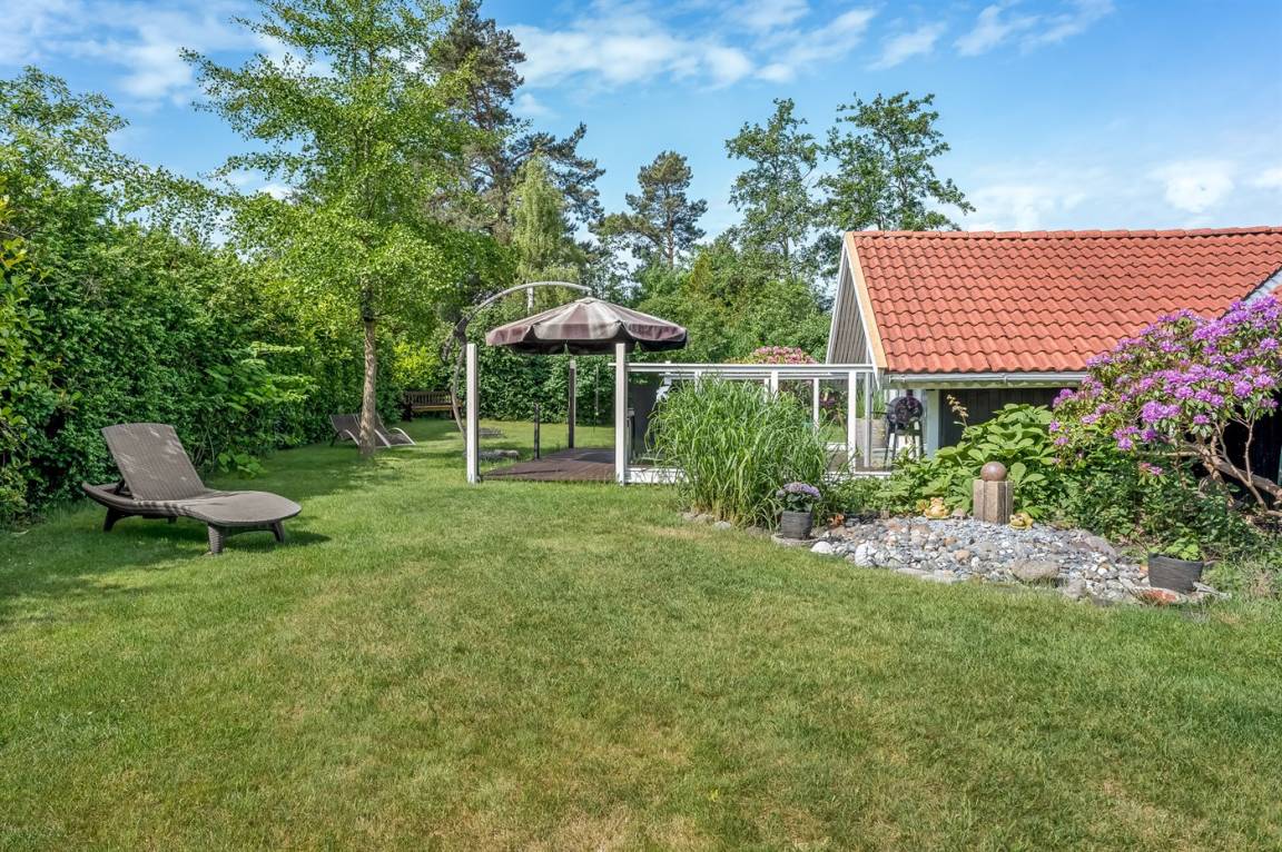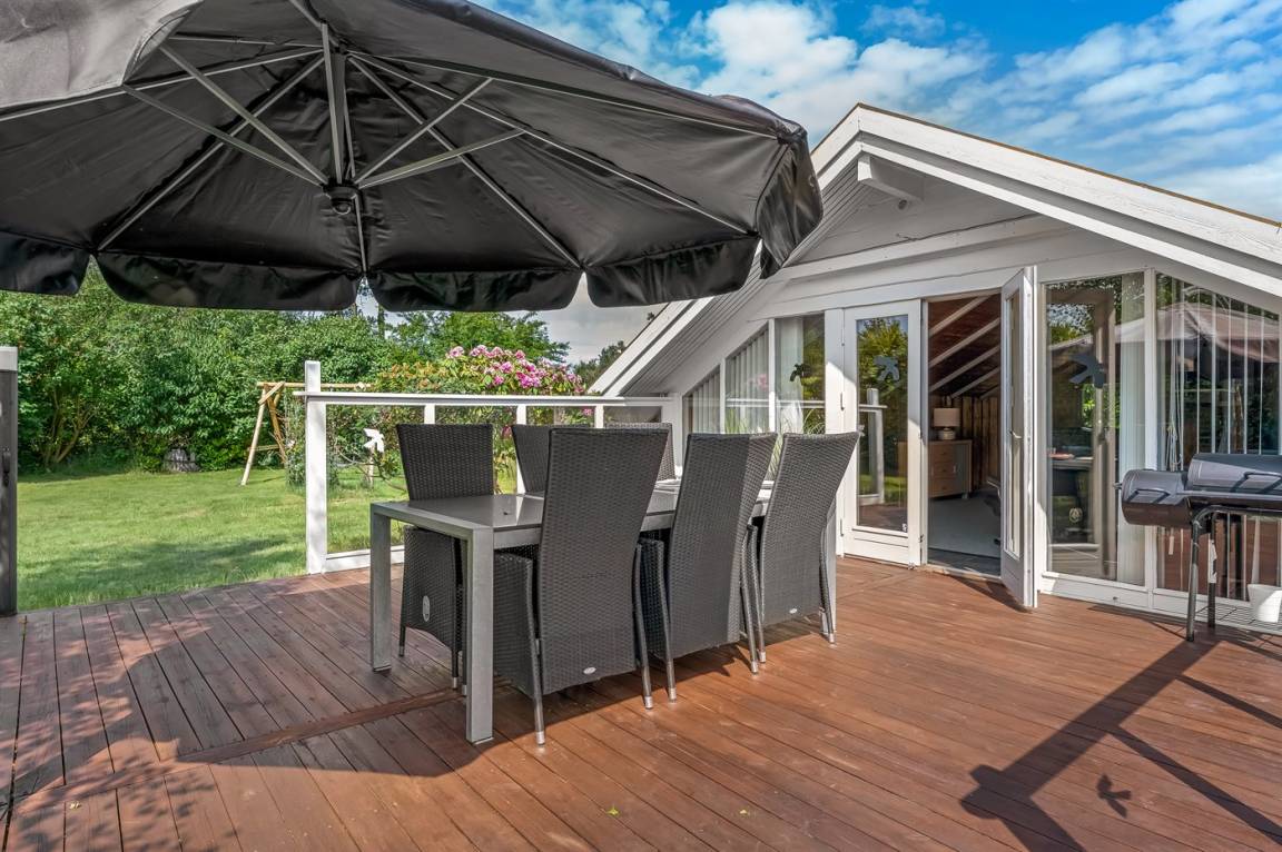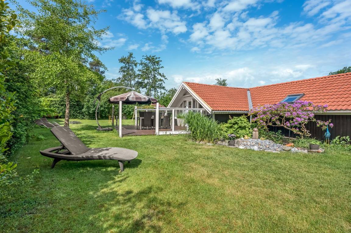 Das Ferienhaus verfügt über zwei schöne Terrassen – eine überdachte und eine offene. Es gibt viele windgeschützte Ecken, und das Grundstück liegt ungestört. Im Garten findest du Sandkasten, Schaukel, Fußballtor, Trampolin und Lagerfeuerstelle.