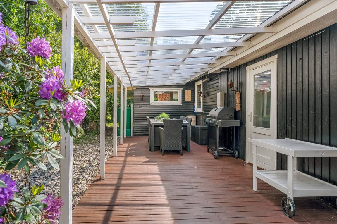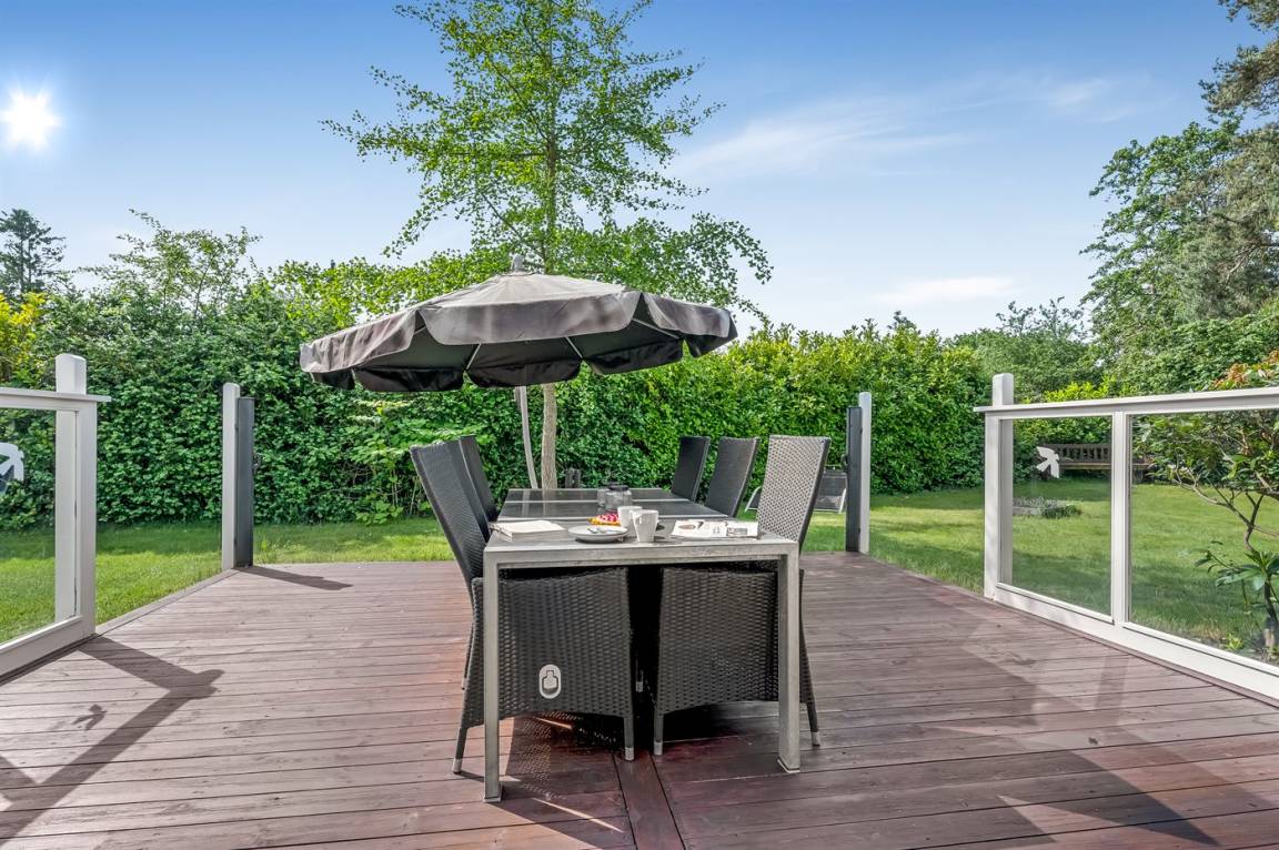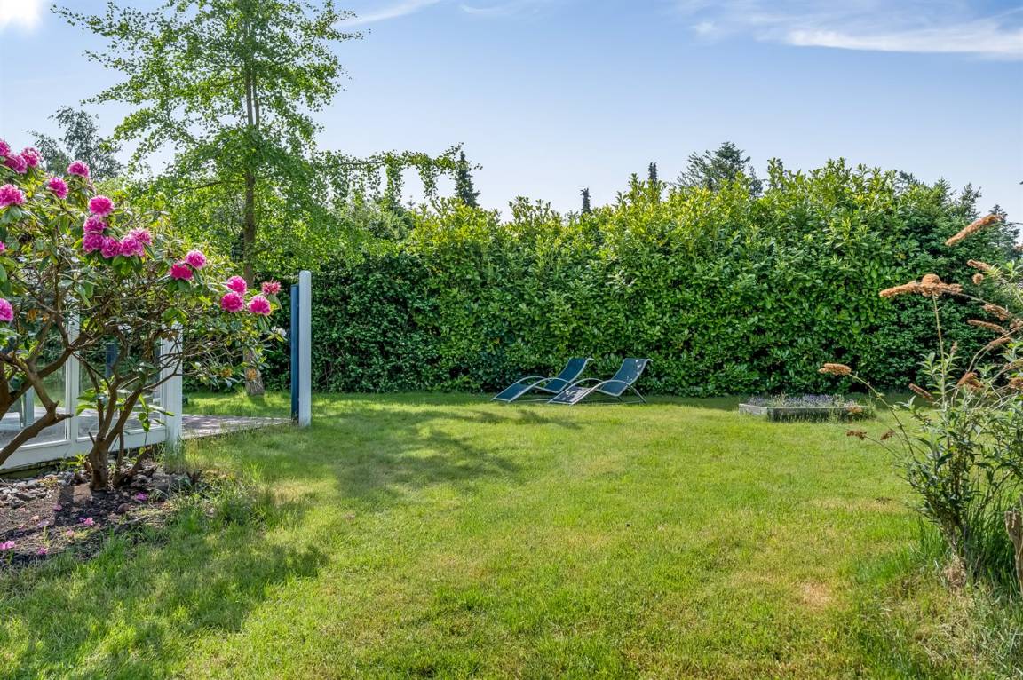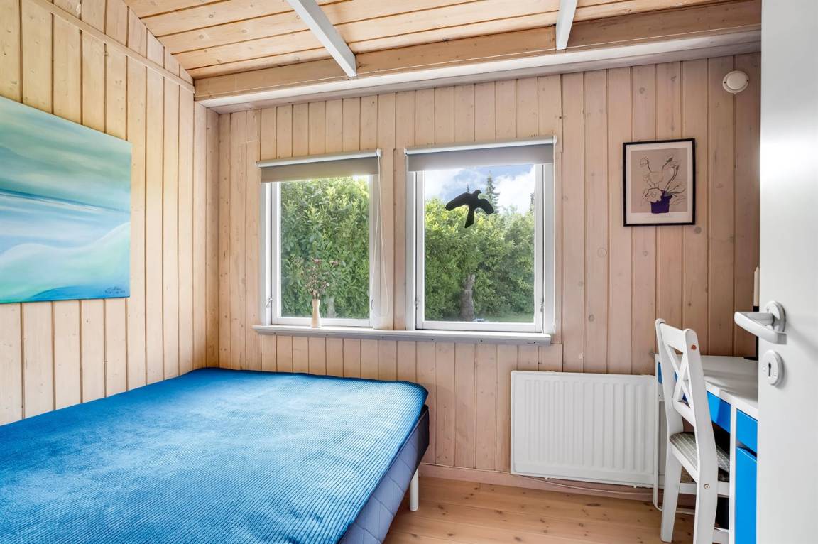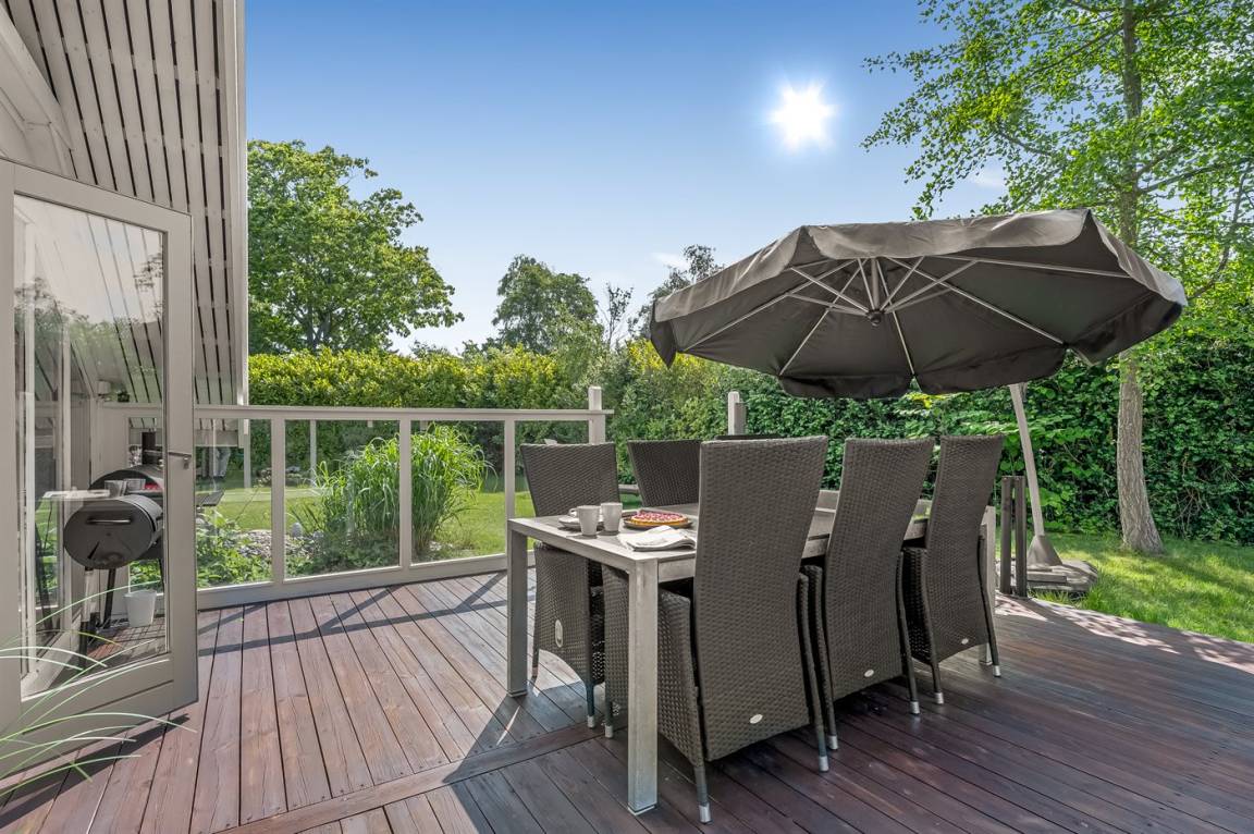 Das Ferienhaus verfügt über zwei schöne Terrassen – eine überdachte und eine offene. Es gibt viele windgeschützte Ecken, und das Grundstück liegt ungestört. Im Garten findest du Sandkasten, Schaukel, Fußballtor, Trampolin und Lagerfeuerstelle.