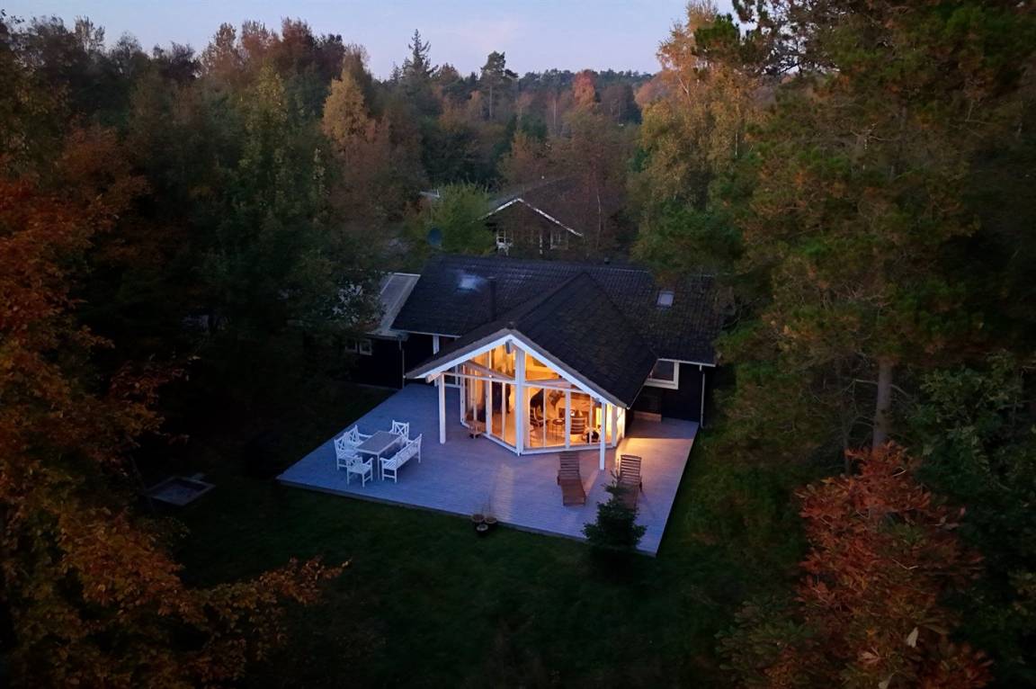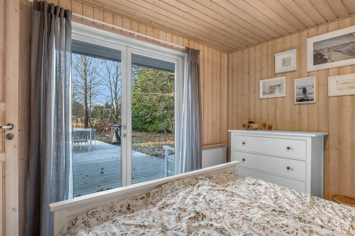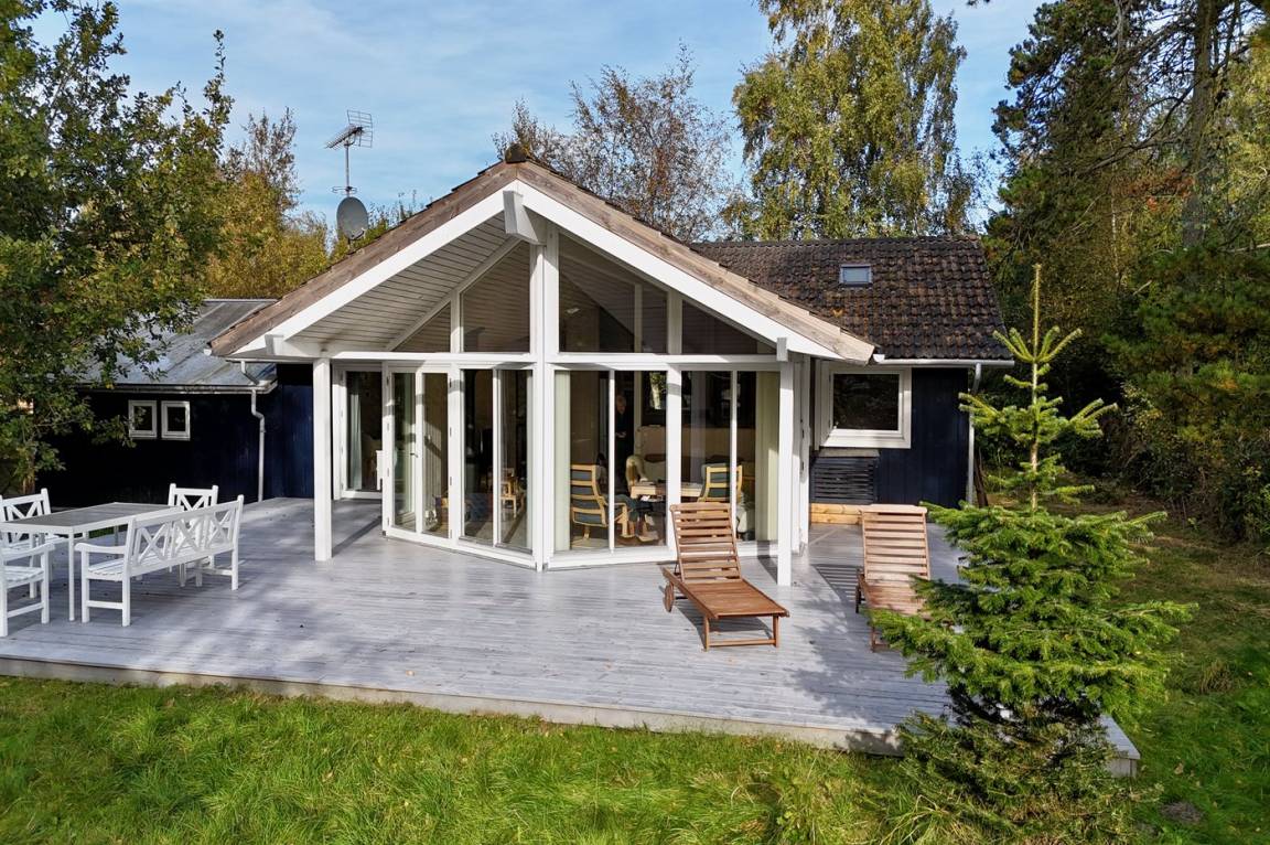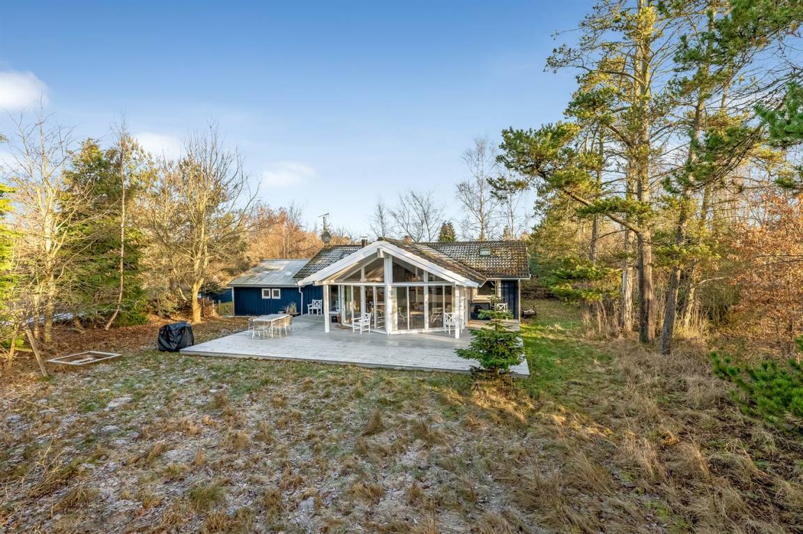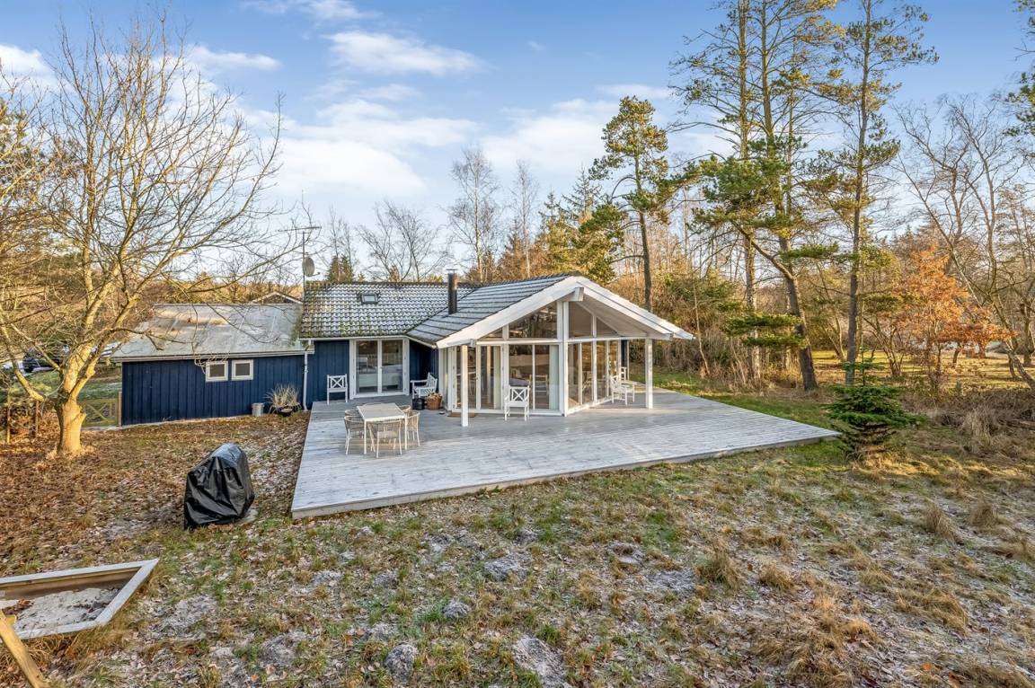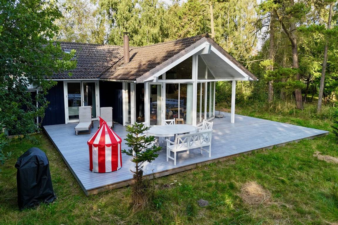Zum Haus gehört eine große, teilweise überdachte Holzterrasse, auf der du schöne Stunden im Freien verbringen kannst, sei es beim Lesen eines guten Buches, beim Sonnenbaden oder beim Zubereiten einer leckeren Mahlzeit auf dem Grill. Das Grundstück ist ein Naturgrundstück und „wild mit Absicht" – es gibt jedoch einige kleine Pfade, auf denen man sich auf dem Grundstück umher bewegen kann.
