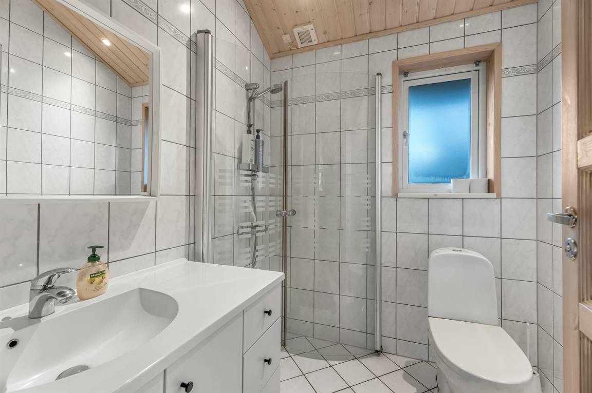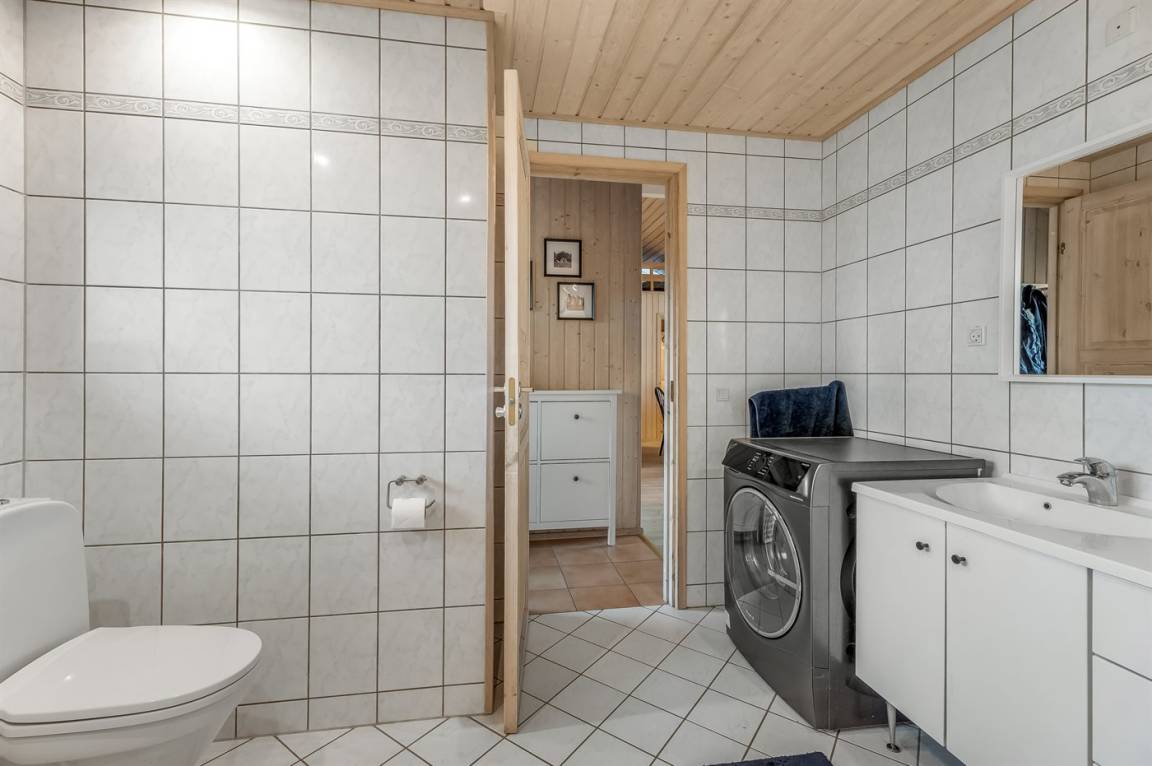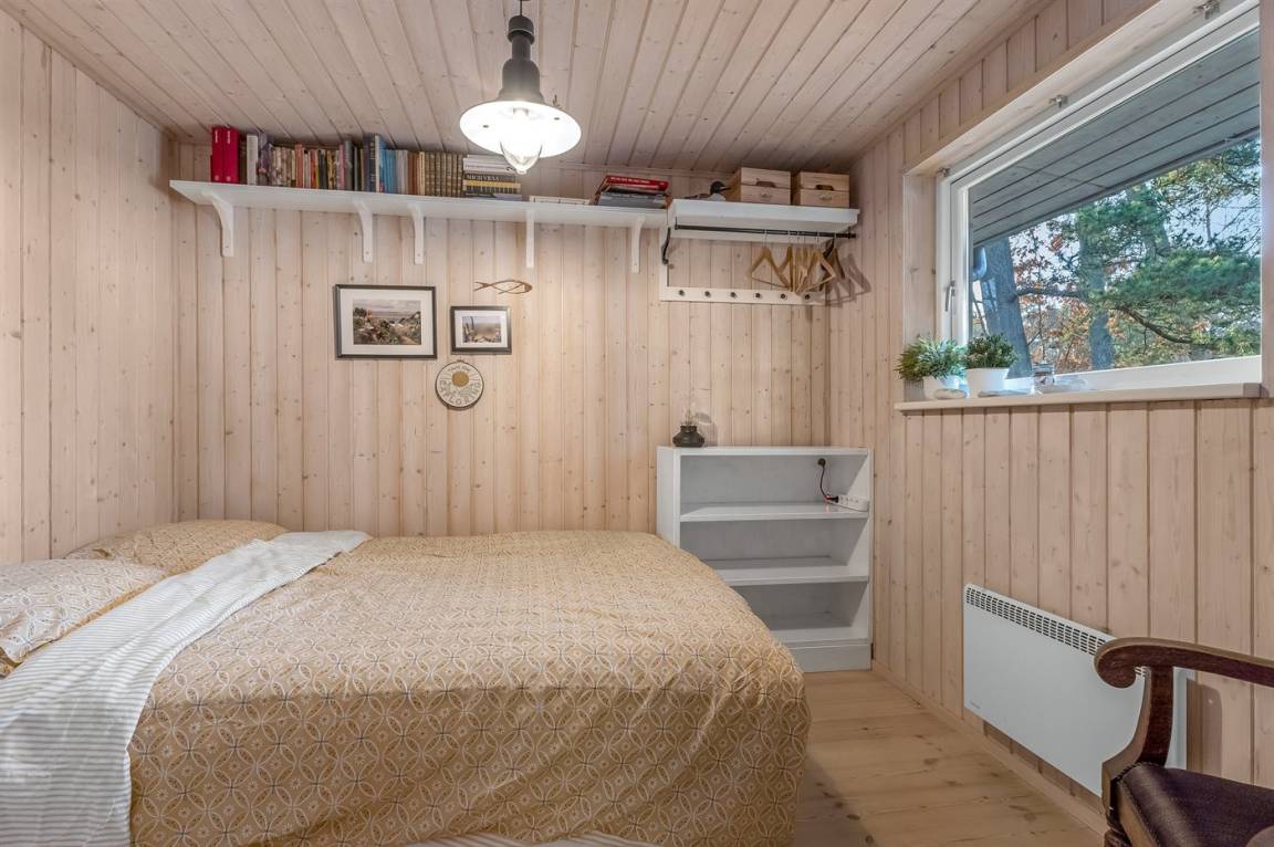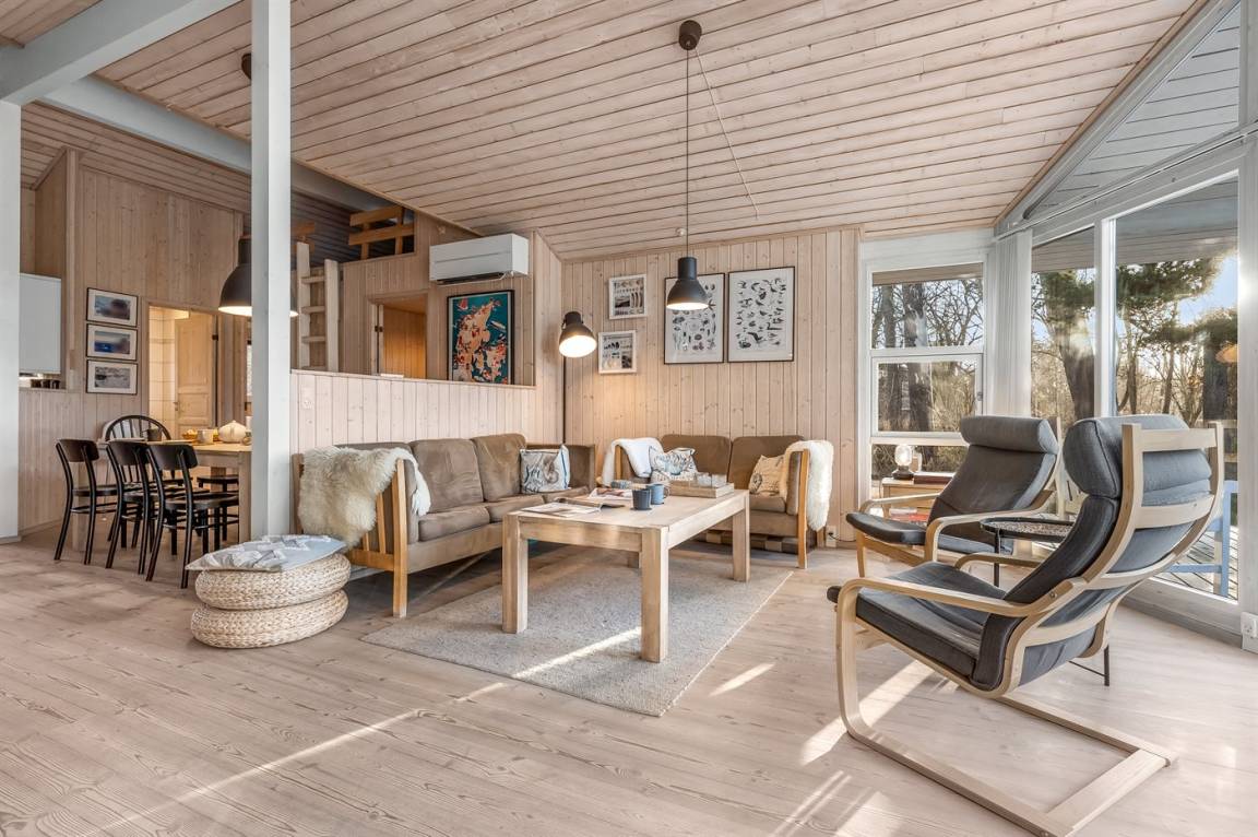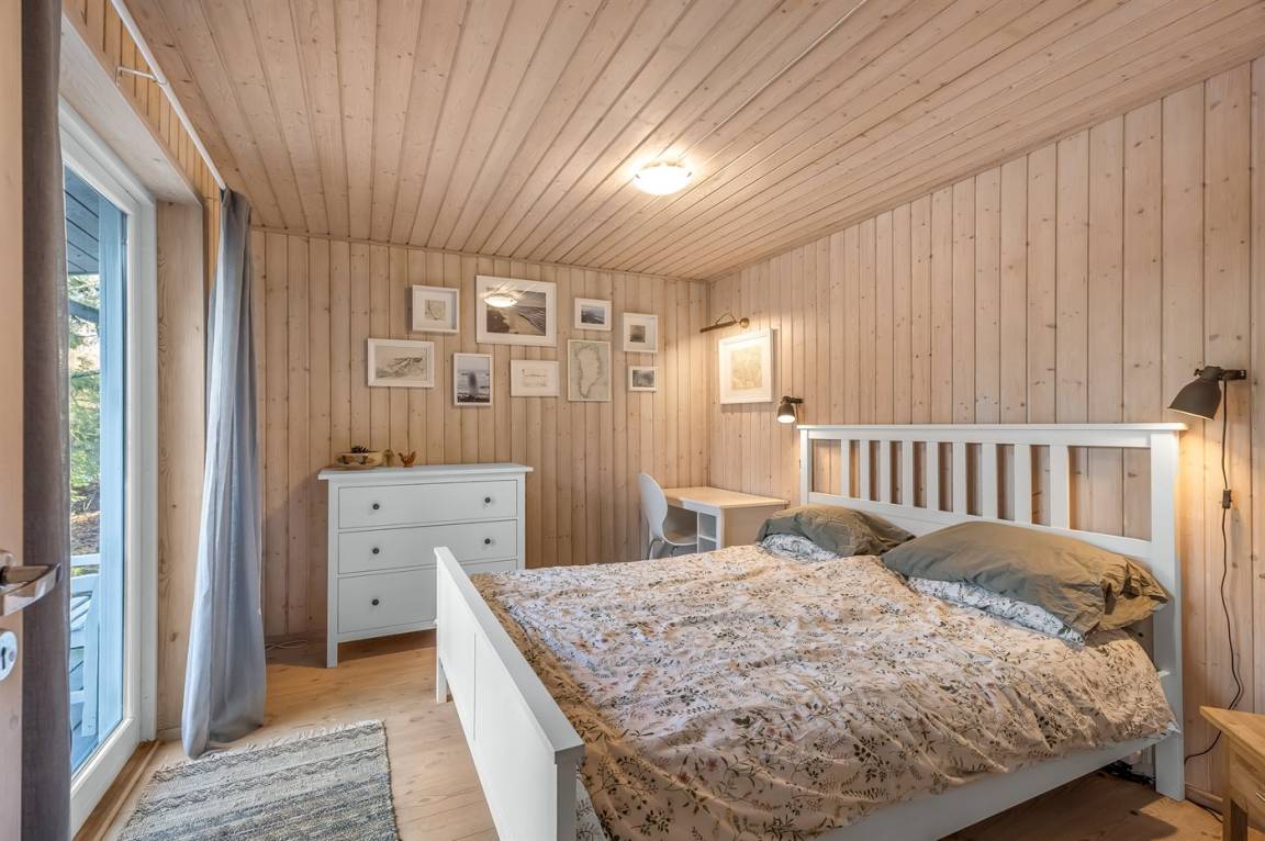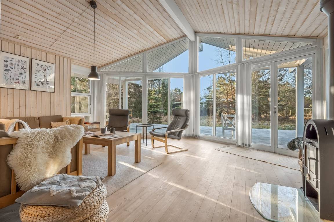 Zum Haus gehört eine große, teilweise überdachte Holzterrasse, auf der du schöne Stunden im Freien verbringen kannst, sei es beim Lesen eines guten Buches, beim Sonnenbaden oder beim Zubereiten einer leckeren Mahlzeit auf dem Grill. Das Grundstück ist ein Naturgrundstück und „wild mit Absicht" – es gibt jedoch einige kleine Pfade, auf denen man sich auf dem Grundstück umher bewegen kann.