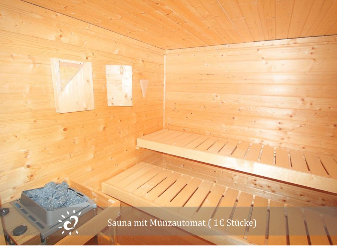 Holz für den Whirlpool ist bequem vor Ort erhältlich (5,00 € pro Sack). Die Sauna kann über einen Münzautomaten genutzt werden (1,00 € pro Münze).