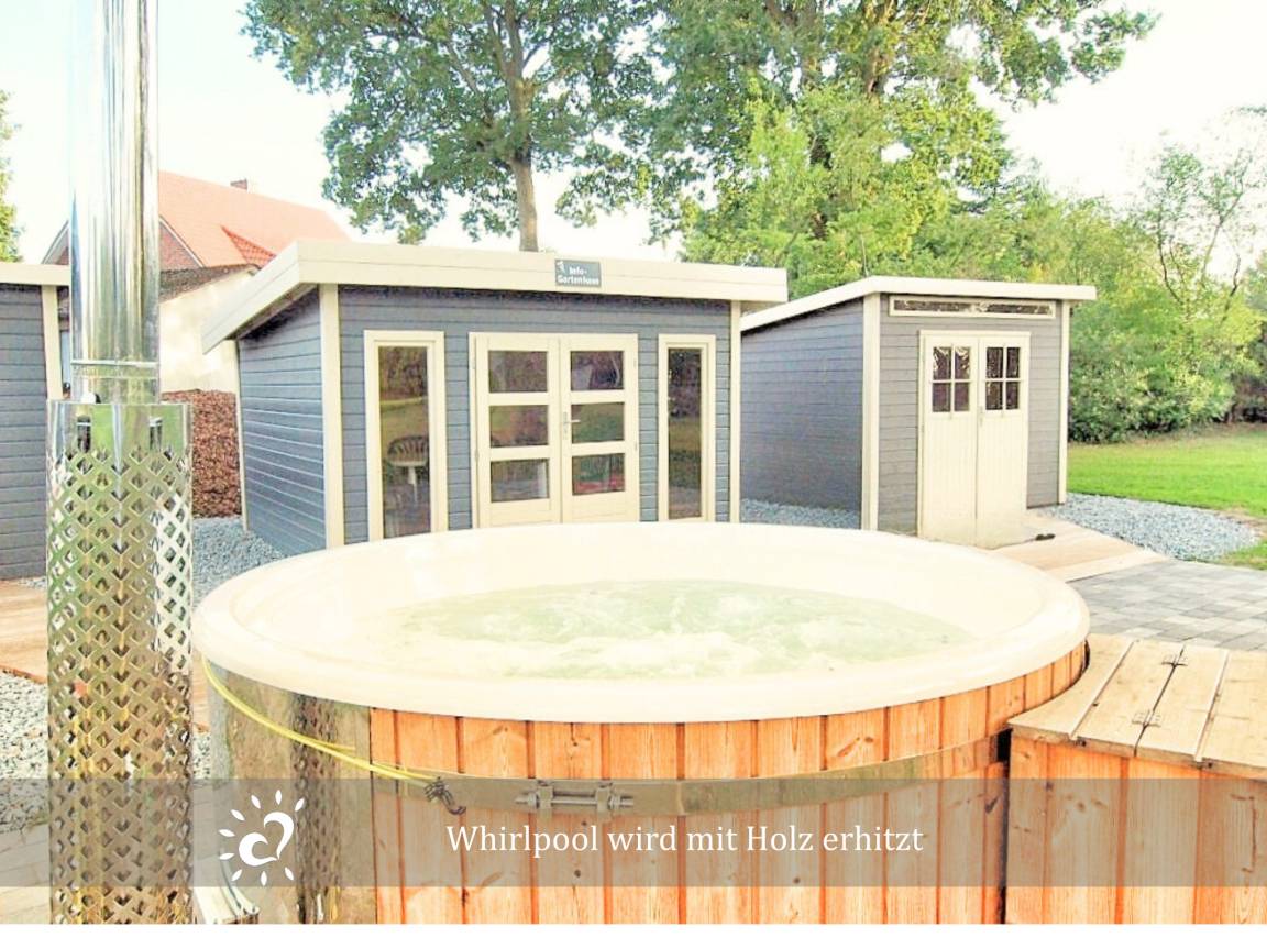 Ein besonderes Highlight ist der großzügige Garten mit holzbefeuertem Outdoor-Whirlpool und Sauna. Der liebevoll gestaltete Wellnessbereich wird von insgesamt drei Ferienwohnungen geteilt und lädt dazu ein, entspannte Stunden unter freiem Himmel zu verbringen.