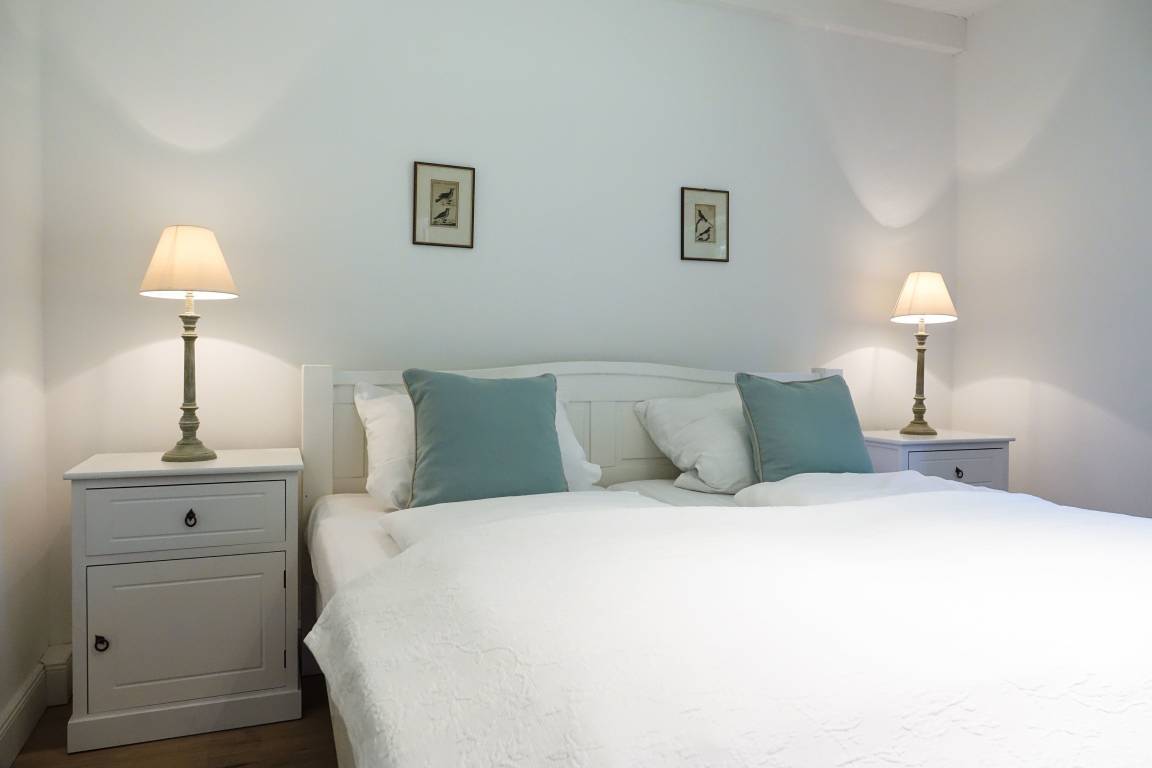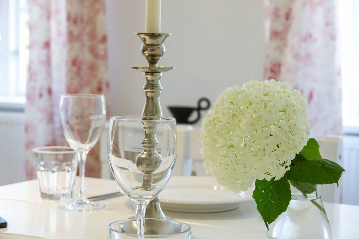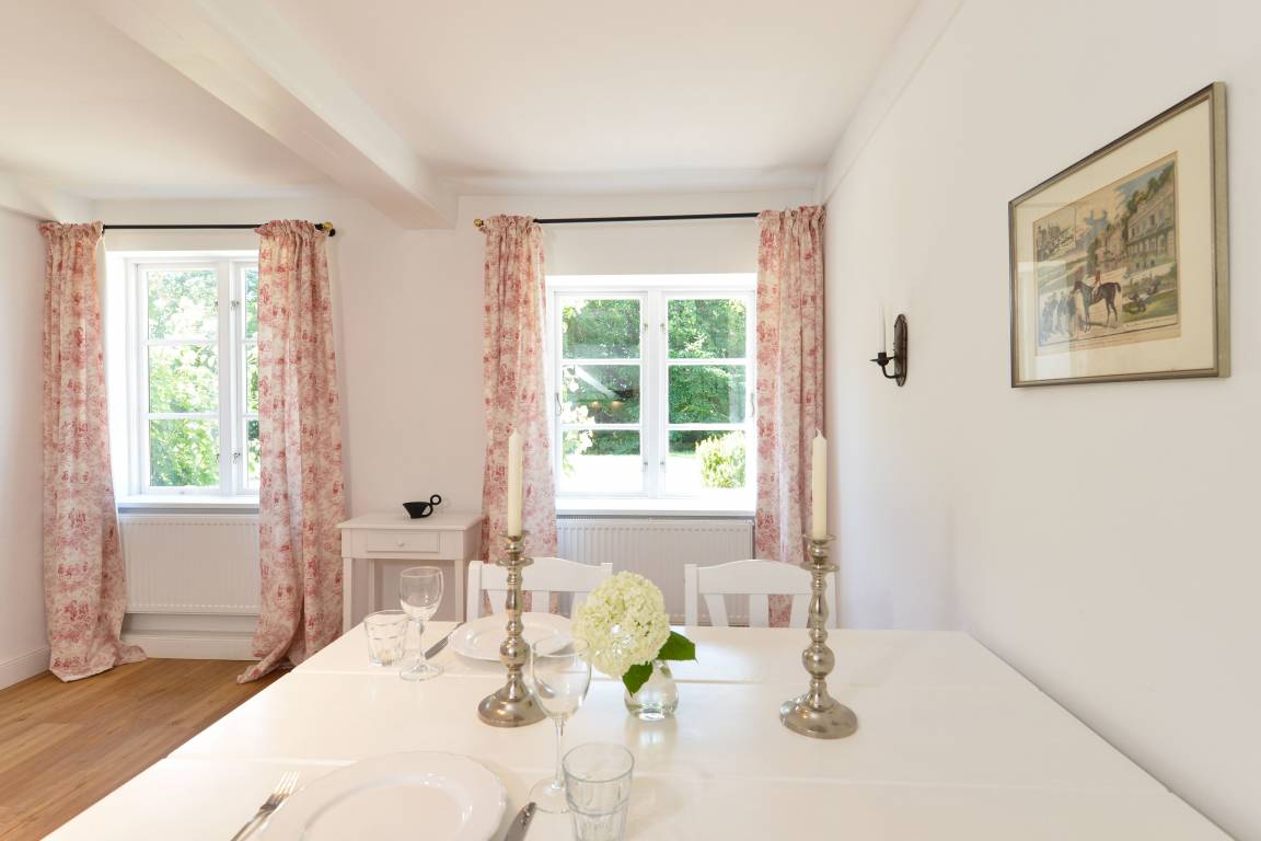 Rosen und Lavendel rahmen die Fenster dieses kleinen Häuschens im Sommer. Im Frühjahr dagegen breitet sich der Duft der Fliederhecke des Gartens über das gesamte großzügige Grundstück. Dieses kleine Fachwerkhäuschen, einst das Witwenhaus des Guts, liegt in der idyllischen Sackgasse am Schlossgraben. Nur vier Häuser mit großen, weitläufigen Gärten säumen diese Straße. So wird dieses Häuschen auch gerne als Ergänzung großen gegenübergelegenen Michels Huus hinzu gemietet um mit Freunden und Familie Zeit zu verbringen und dennoch Rückzug in diesem zauberhaften Haus zu finden. Die Lage des Schlossgraben besticht durch die ländliche Idylle, aber dennoch fußläufige Lage zum Dorf Gelting und die gute Erreichbarkeit der Strände der Geltinger Bucht in Wackerballig, Falshöft und Pottloch und des einzigartigen Naturschutzgebiets Geltinger Birk.