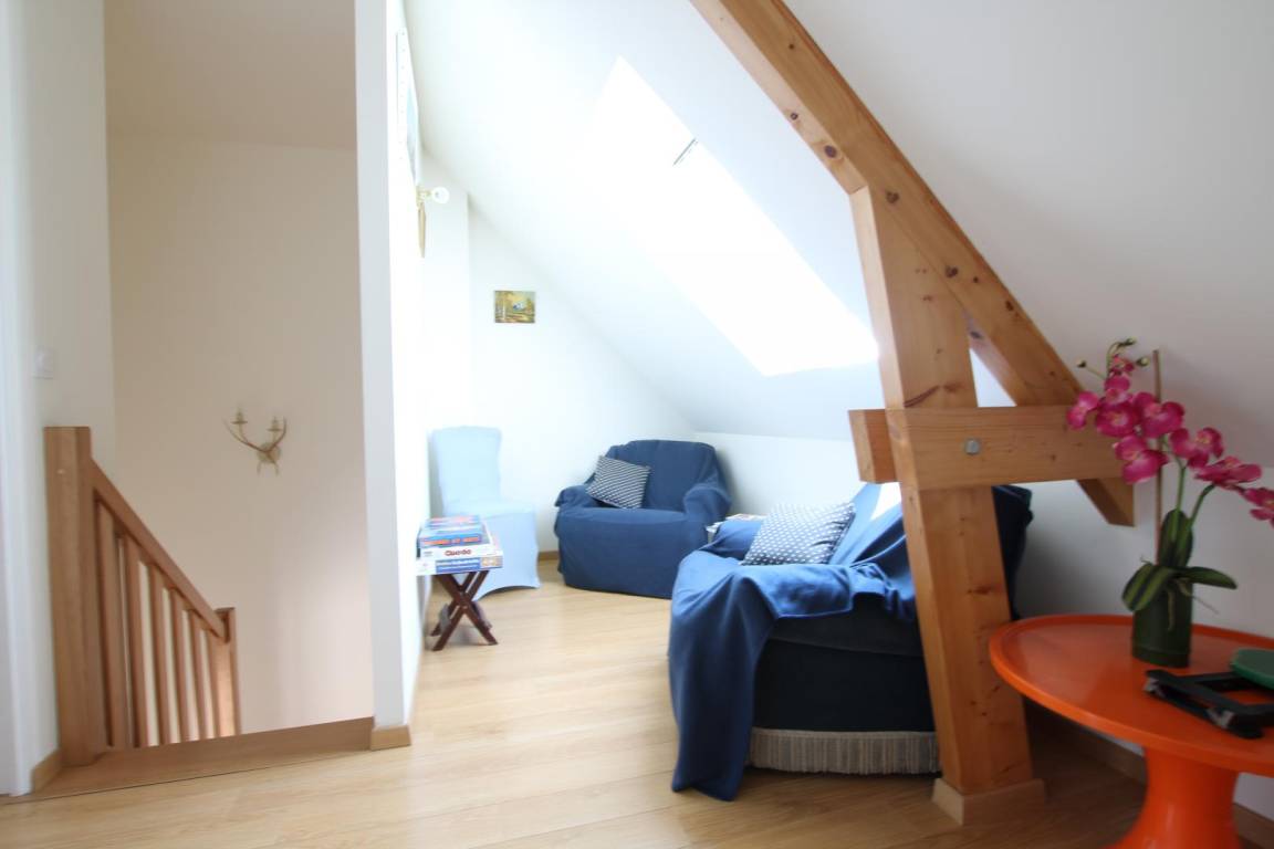 Architektenhaus neben dem Wohnhaus des Eigentümers. Erdgeschoss: Wohnzimmer mit offener Küche, Duschbad, WC. Obergeschoss: Schlafzimmer 1 (1 Doppelbett), Schlafzimmer 2 (1 Einzelbett und 1 Ausziehbett), WC. Fernseher, Waschmaschine, Geschirrspüler, Gefrierschrank. Kinderbett, Hochstuhl und Babybadewanne auf Anfrage. Gemeinsam genutztes, umzäuntes Grundstück. Zwei private Terrassen, eine davon windgeschützt nach Norden. Gartenmöbel. Grill. Wärme- und Schalldämmung. Luft-Wasser-Wärmepumpe inklusive. Bettwäsche und Handtücher können gemietet werden. Endreinigung optional.