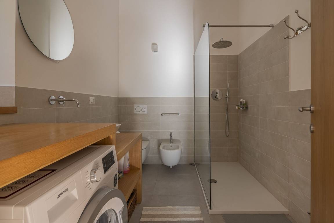 Badezimmer: Waschbecken, WC, Bidet, Dusche, Fön, Waschmaschine, WiFi Internet.