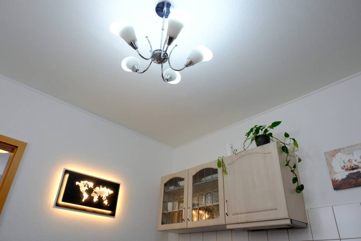 Die Küche mit Wohnbereich verfügt über alle notwendigen Kochutensilien z.B. Kühlschrank, Wasserkocher, Herdplatten, Töpfe, Teller, Tassen, Besteck usw. Diese sind in einer Einbauküche untergebracht. Es ist eine Grundausstattung an Öl, Salz, Zucker und diversen Gewürzen vorhanden. Außerdem können bis zu 4 Personen an den vorhandenen Tisch bequem das Essen vorbereiten und einnehmen.