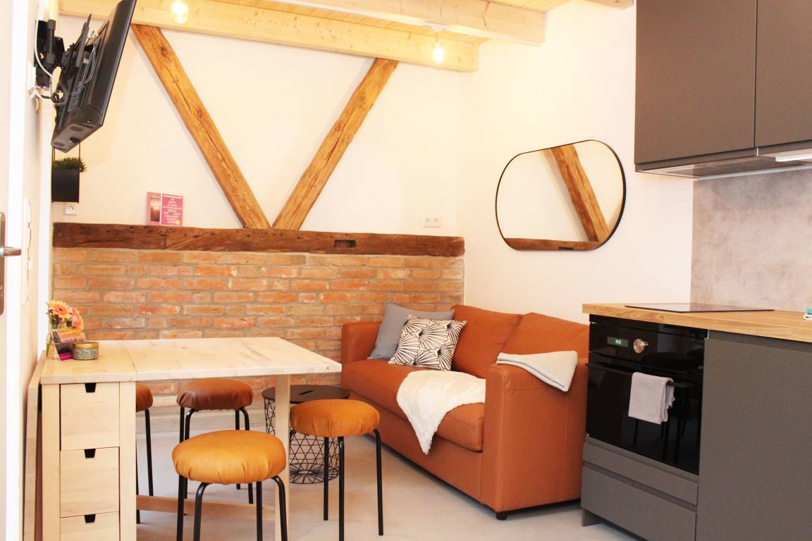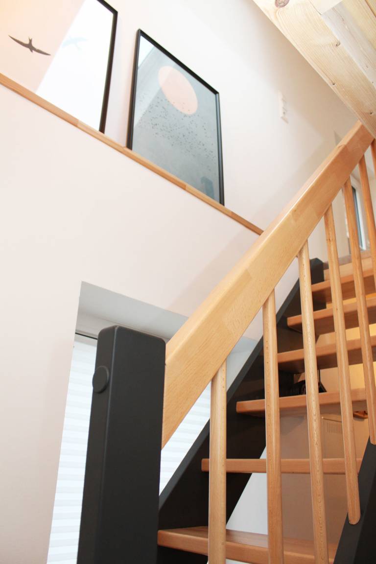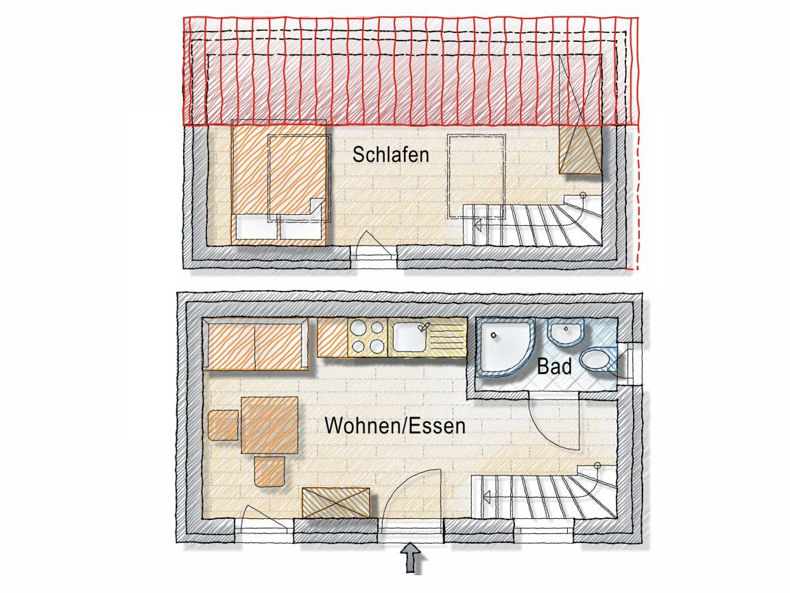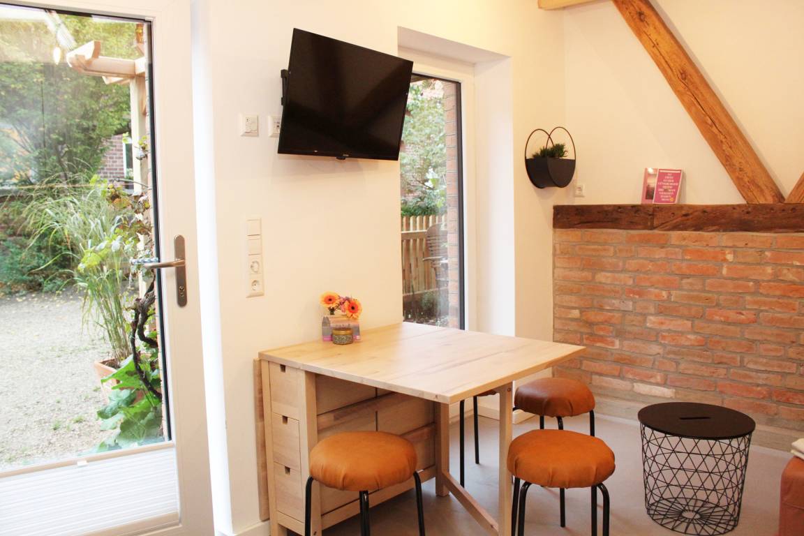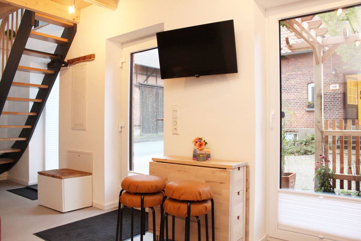 Im Erdgeschoss befindet sich der intelligent genutzte Wohnraum mit integrierter Küchenzeile. Neben dem gemütlichen (Schlaf)Sofa finden Sie dort einen Esstisch und den Fernseher. Genießen Sie den Blick aus den großen bodentiefen Fenstern auf den Hof. Das moderne Duschbad bietet jeden Komfort. Eine schöne Holztreppe führt in den oberen Schlafbereich mit Doppelbett unterm Dach.