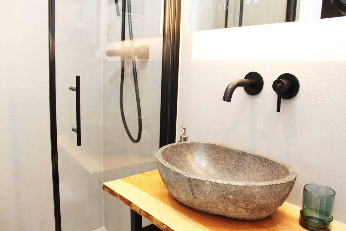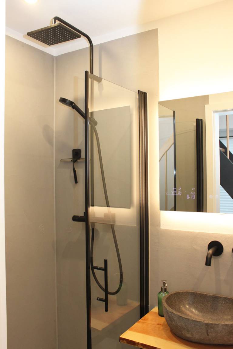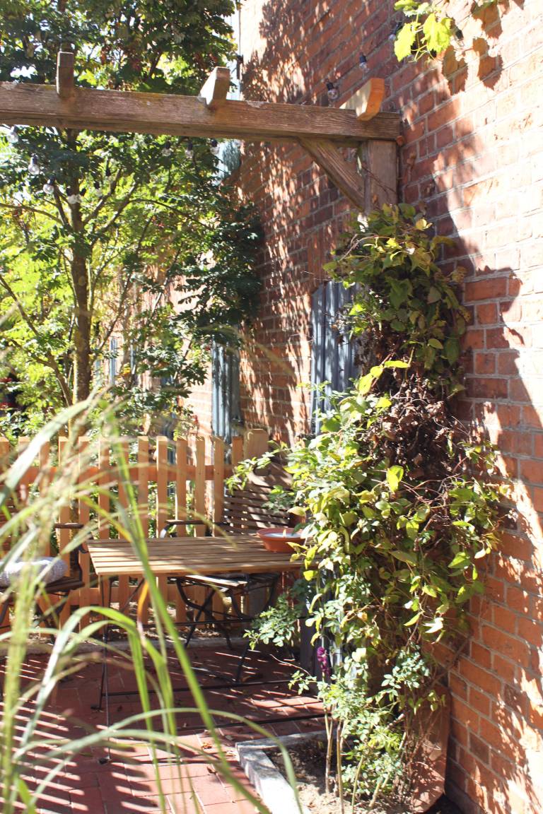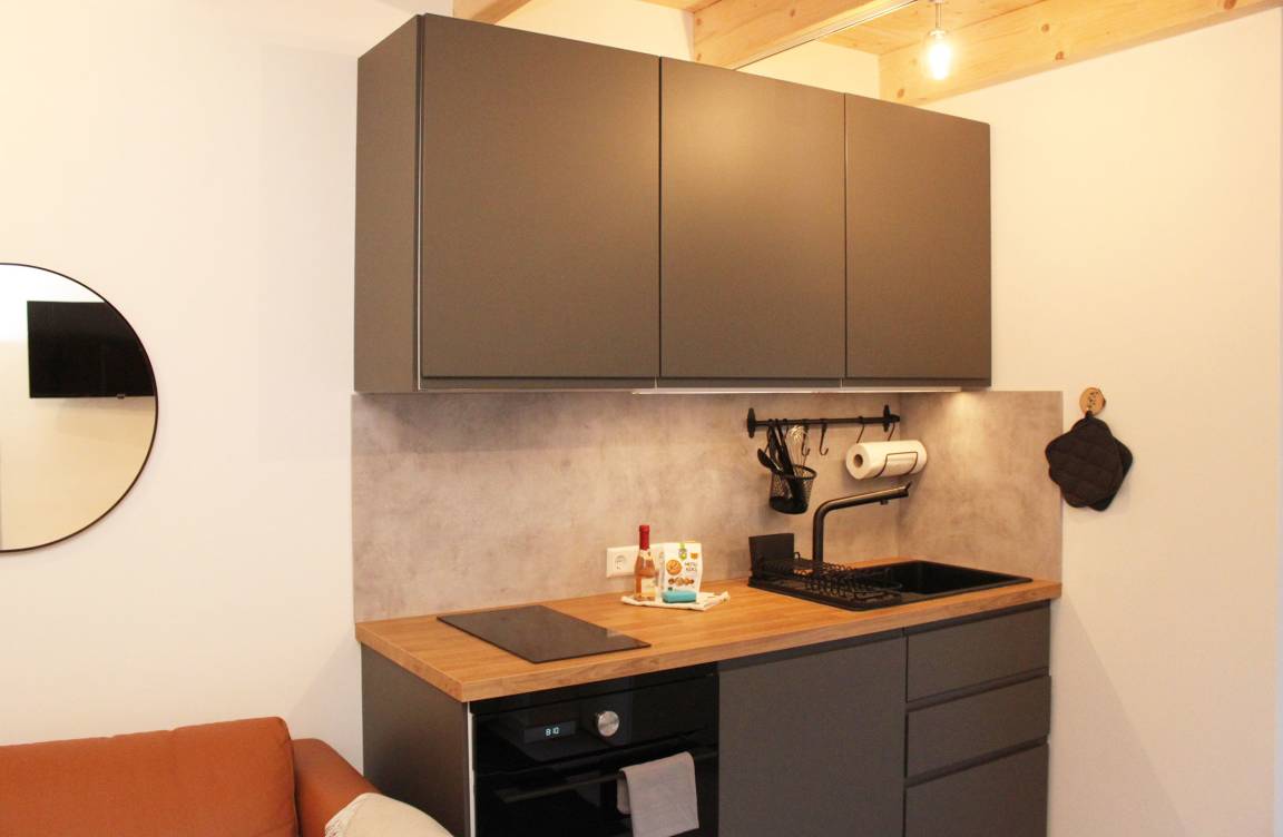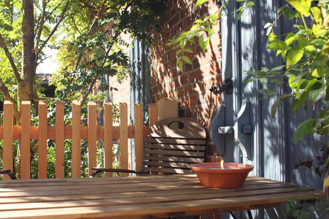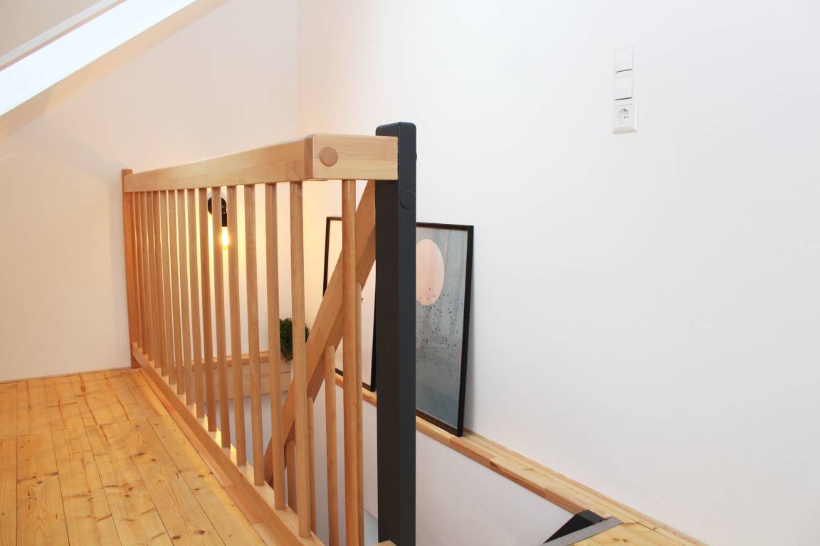 Im Erdgeschoss befindet sich der intelligent genutzte Wohnraum mit integrierter Küchenzeile. Neben dem gemütlichen (Schlaf)Sofa finden Sie dort einen Esstisch und den Fernseher. Genießen Sie den Blick aus den großen bodentiefen Fenstern auf den Hof. Das moderne Duschbad bietet jeden Komfort. Eine schöne Holztreppe führt in den oberen Schlafbereich mit Doppelbett unterm Dach.