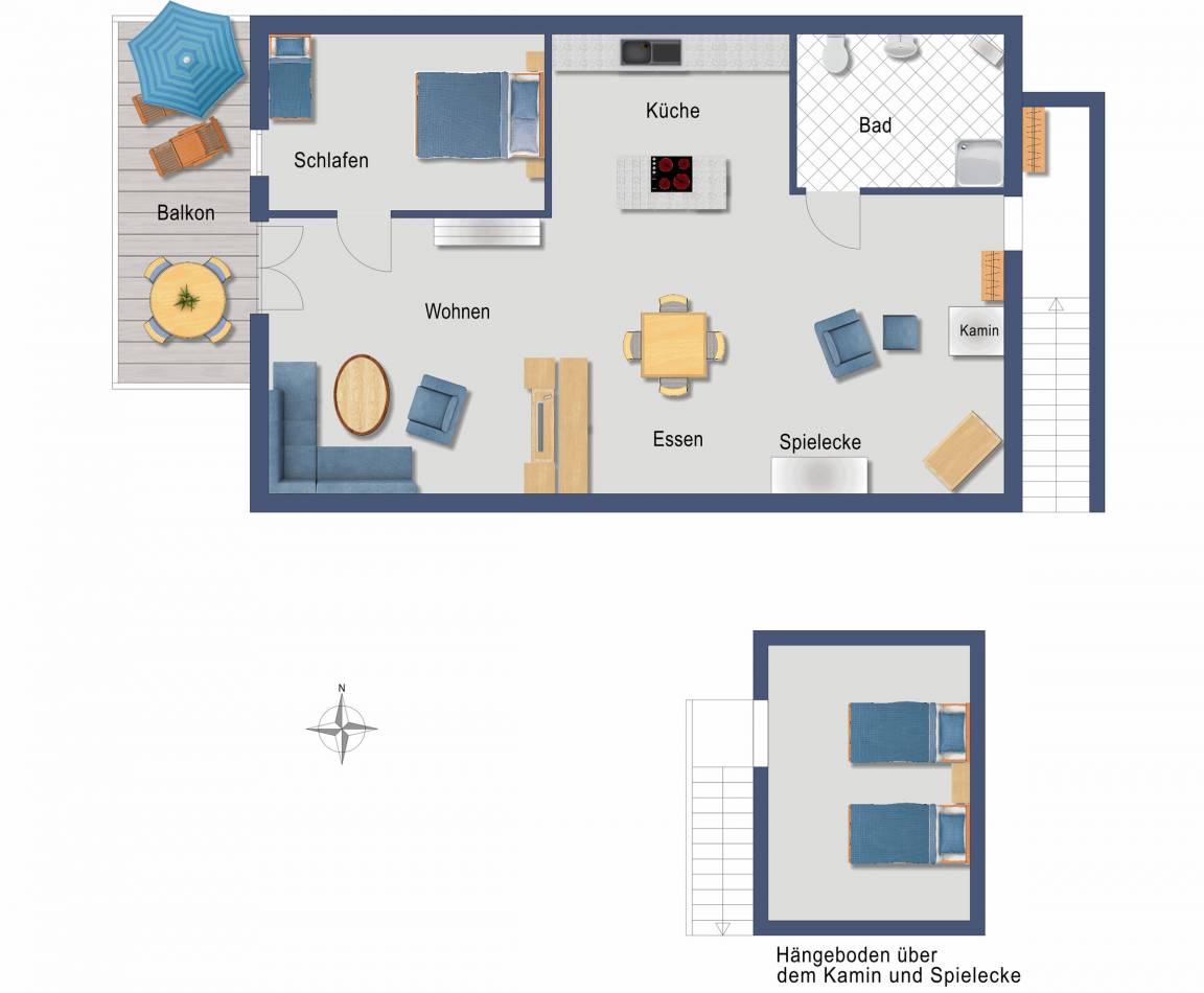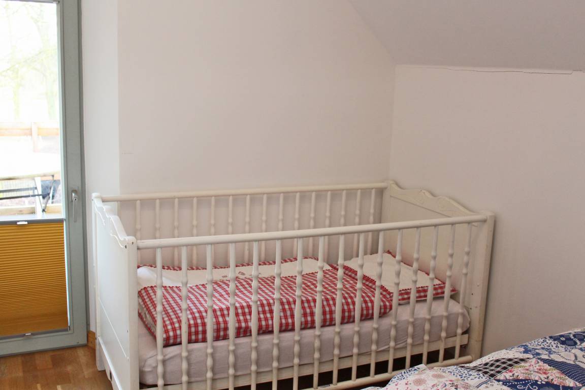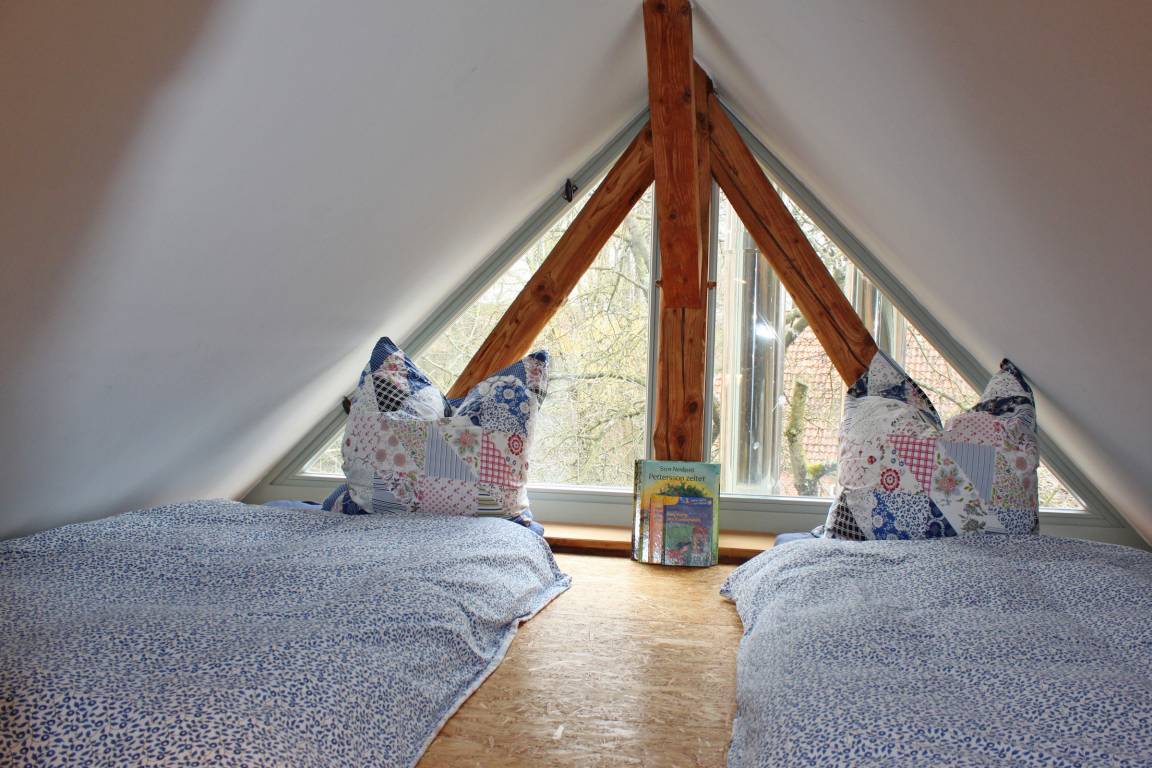 Im Küchenwohnraum gibt es eine Schlafcouch für zwei Personen. Im separaten Schlafzimmer ein Doppelbett, zusätzlich ein Kinderbett und einen Abenteuer-Hängeboden mit zwei Schlafplätzen.