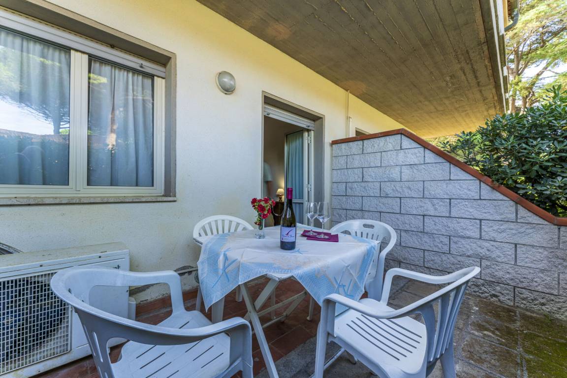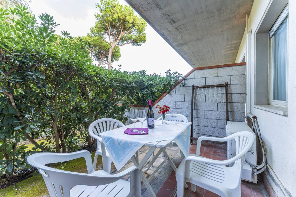 Wohnküche: gut ausgestattete Küche, Esstisch, Kühlschrank, Herd, Doppelbett, Doppel-Schlafsofa, WiFi Internet, Klimaanlage, TV, Ausgang auf den Garten, Ausgang auf die Terrasse.