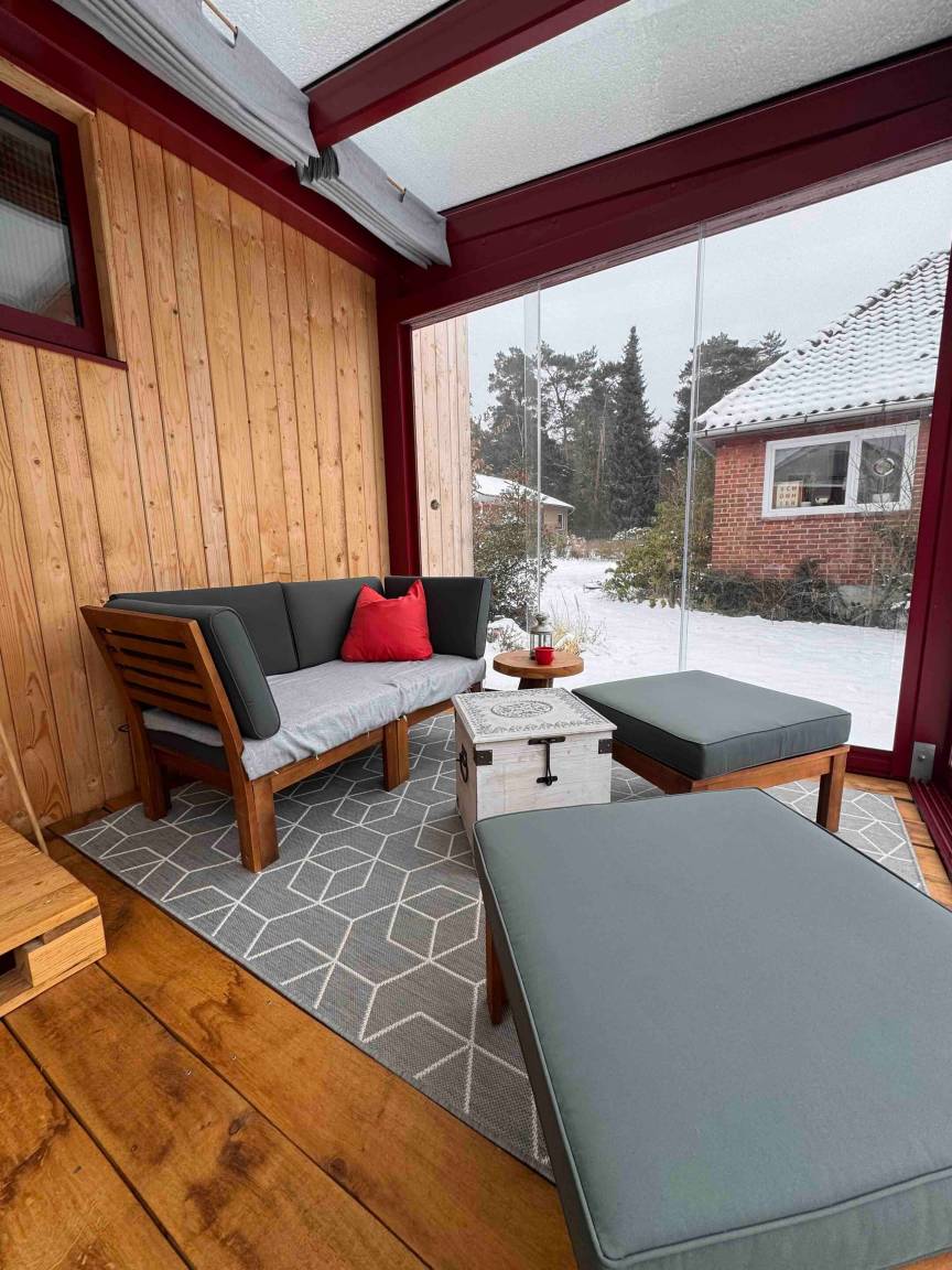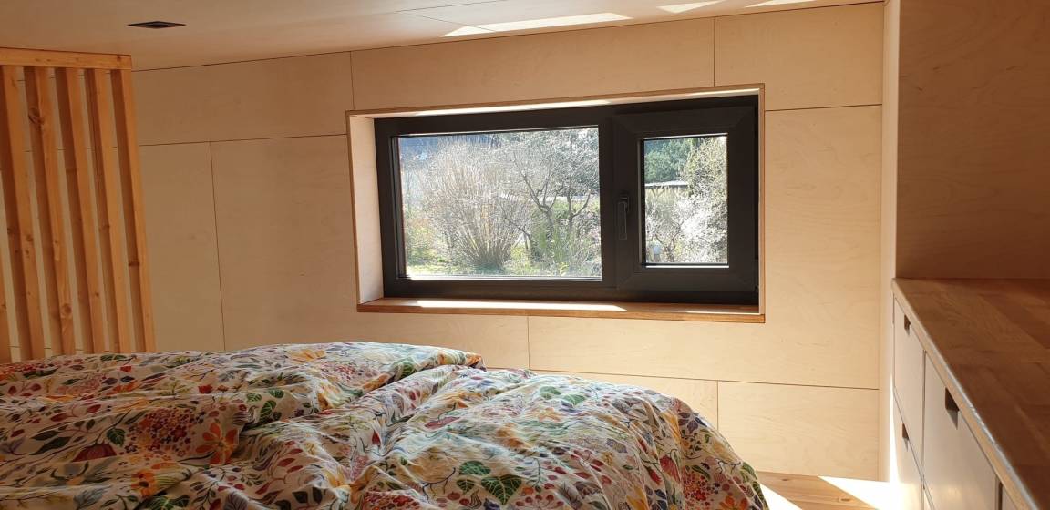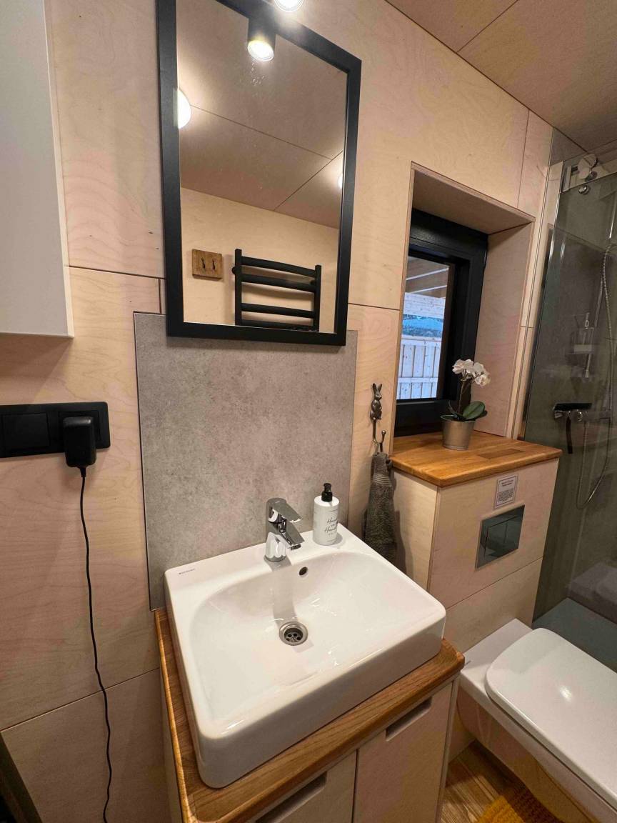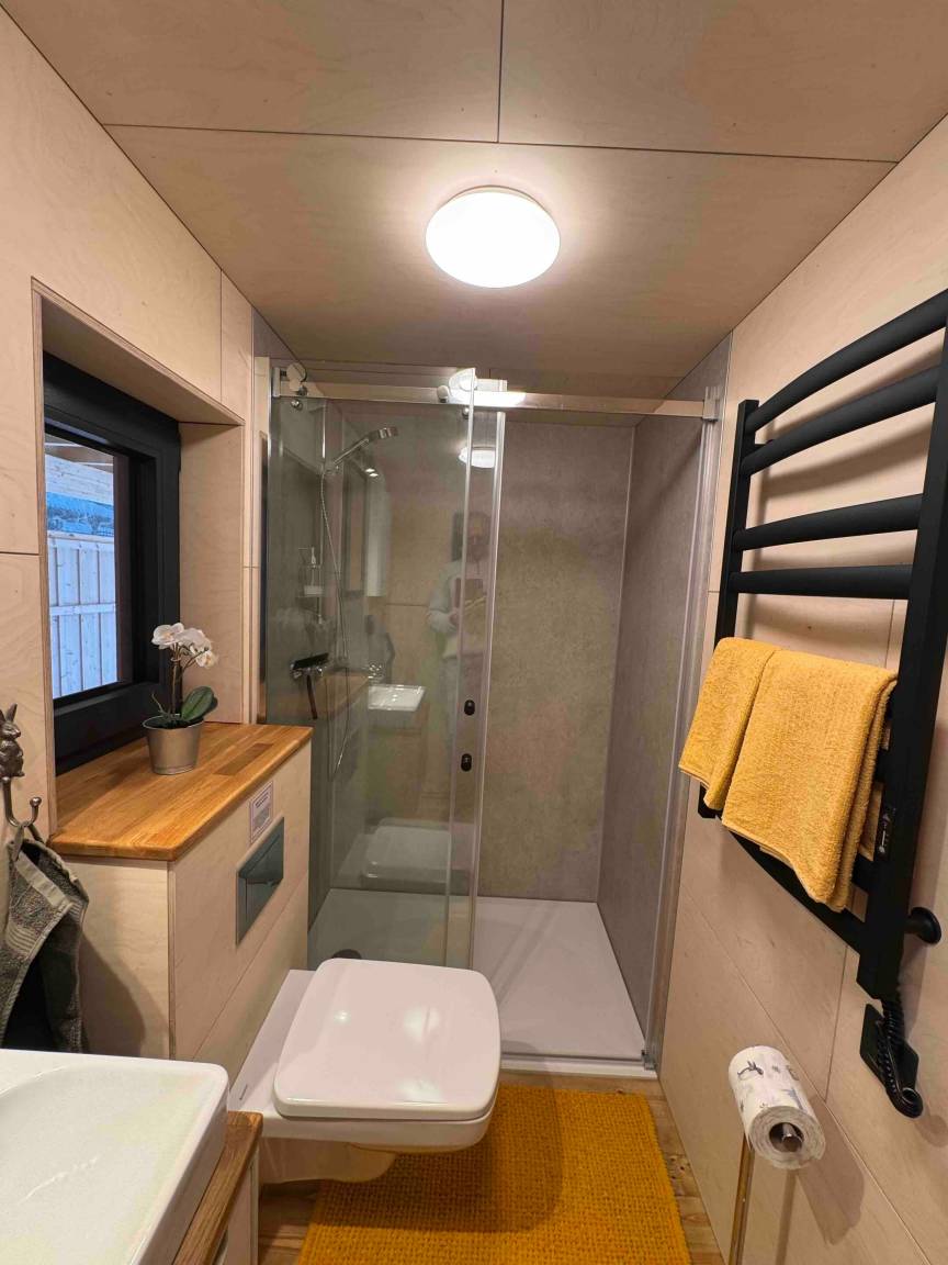 Stilvolles Tiny House "Frida" mit Wintergarten und Kamin.