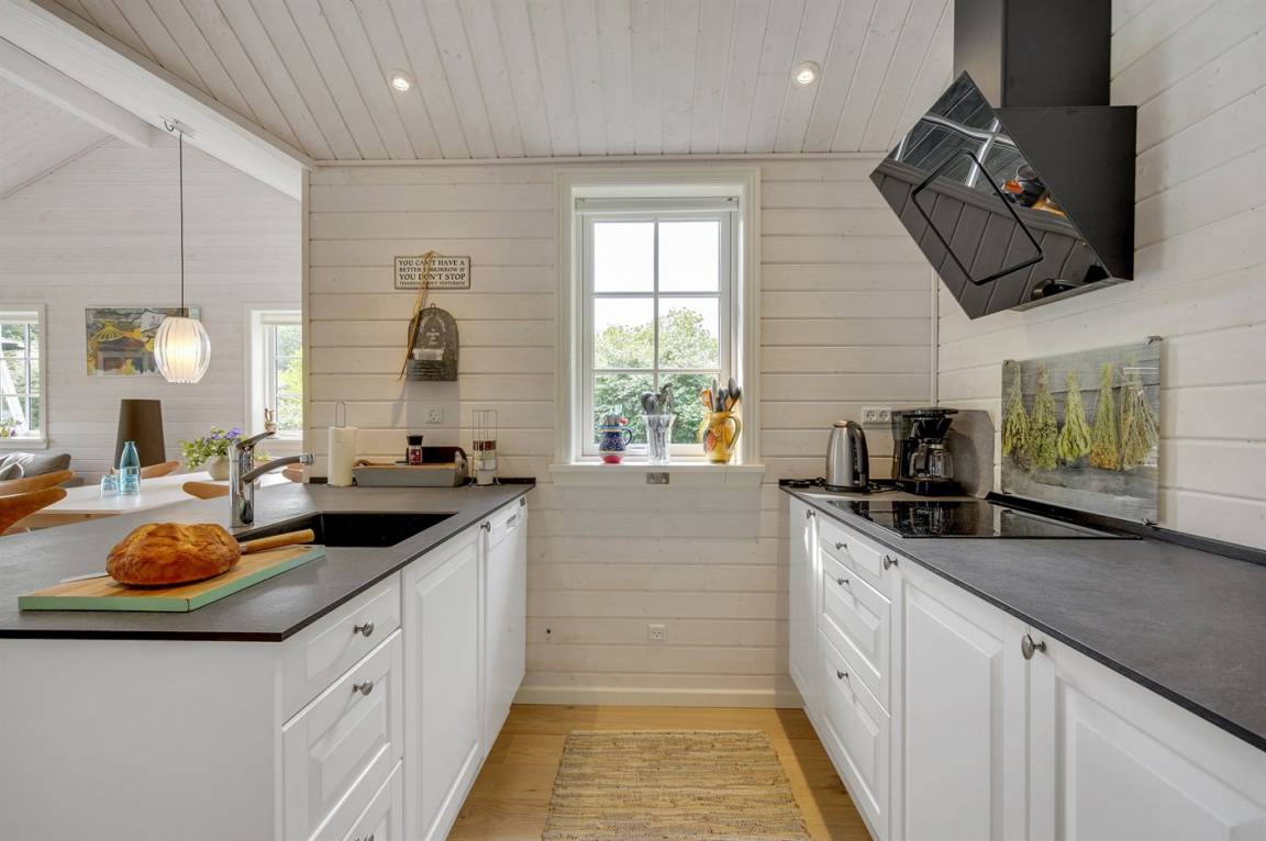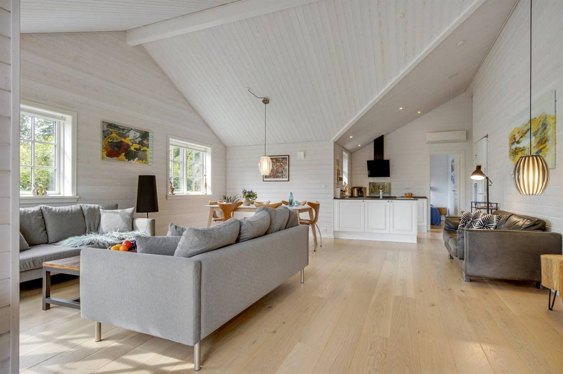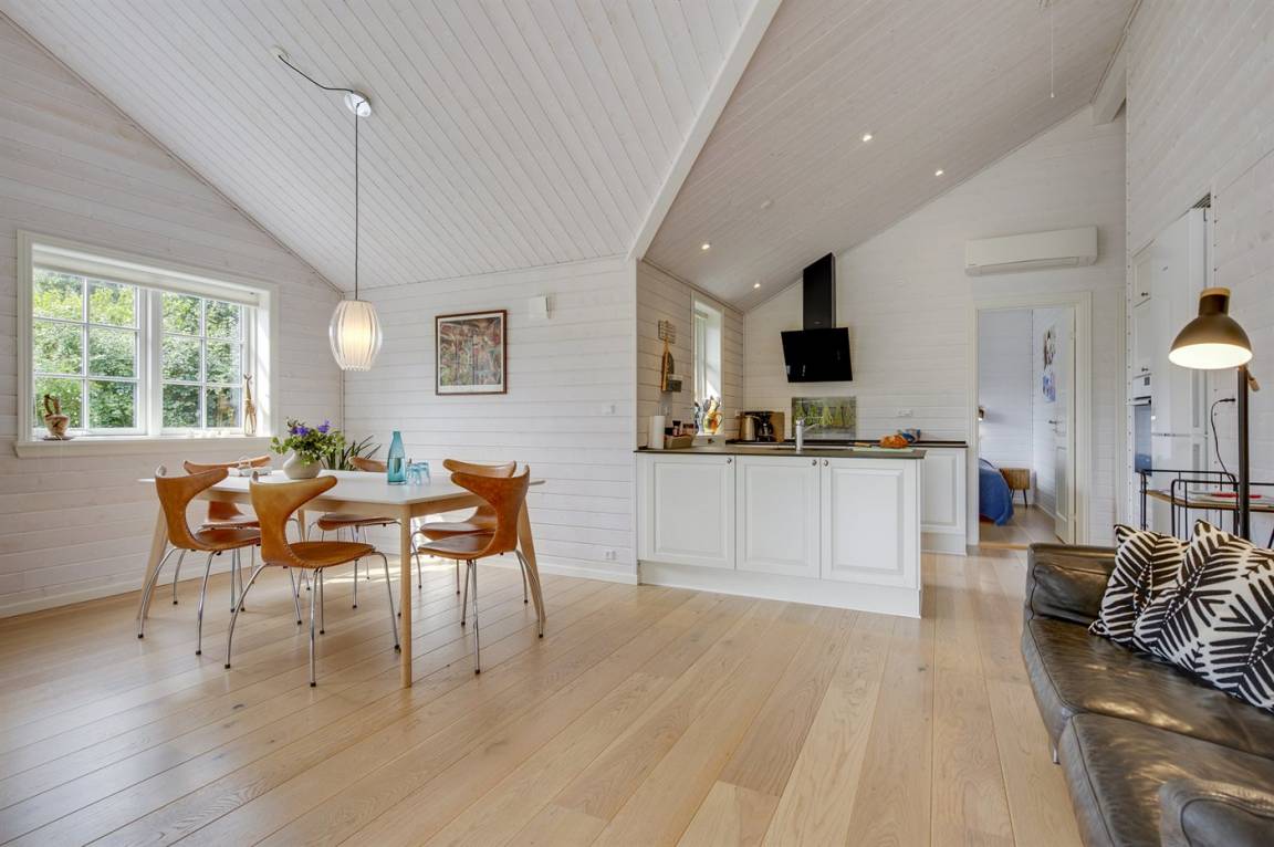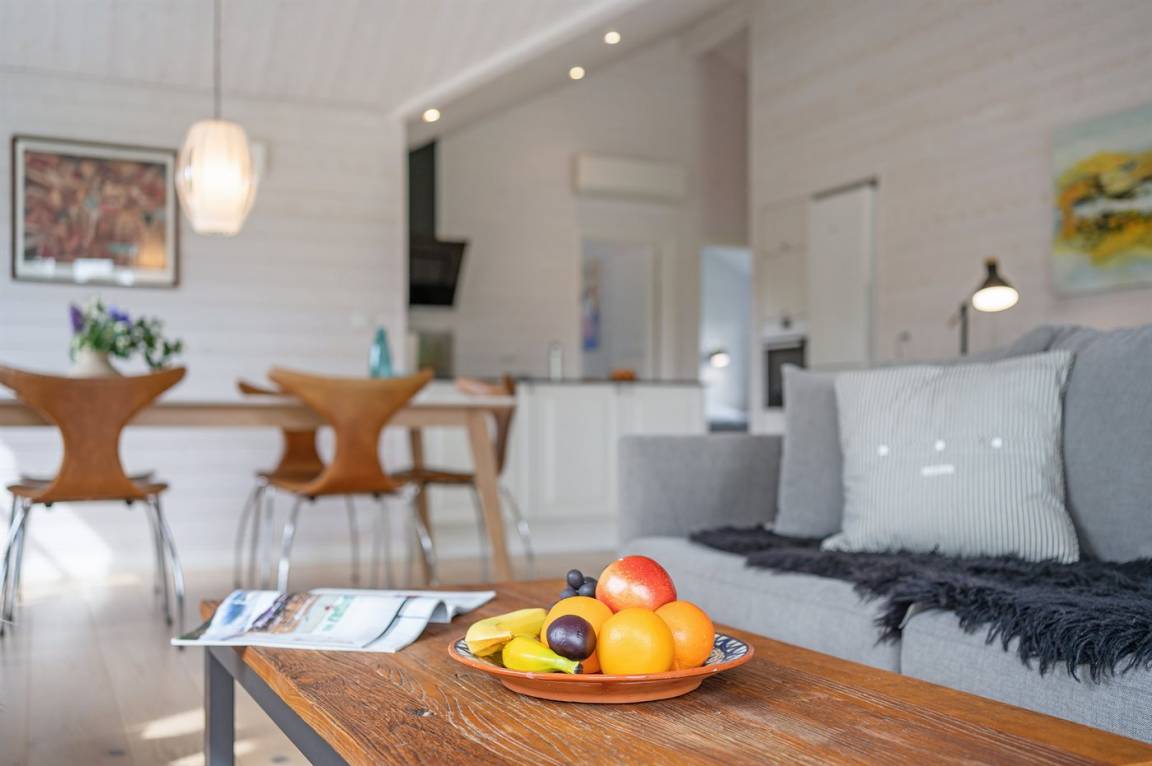 Das Haus ist stilsicher und geschmackvoll eingerichtet. Neben den hellen Materialien, die beim Bau des Hauses verwendet wurden, sorgen die großen Fensterfronten für viel Licht. Der natürliche Mittelpunkt des Hauses ist die offene Küche, die an Essbereich und Wohnzimmer angrenzt. Der Raum hat wie alle anderen im Haus eine hohe Decke, die für ein großzügiges Raumgefühl sorgt.