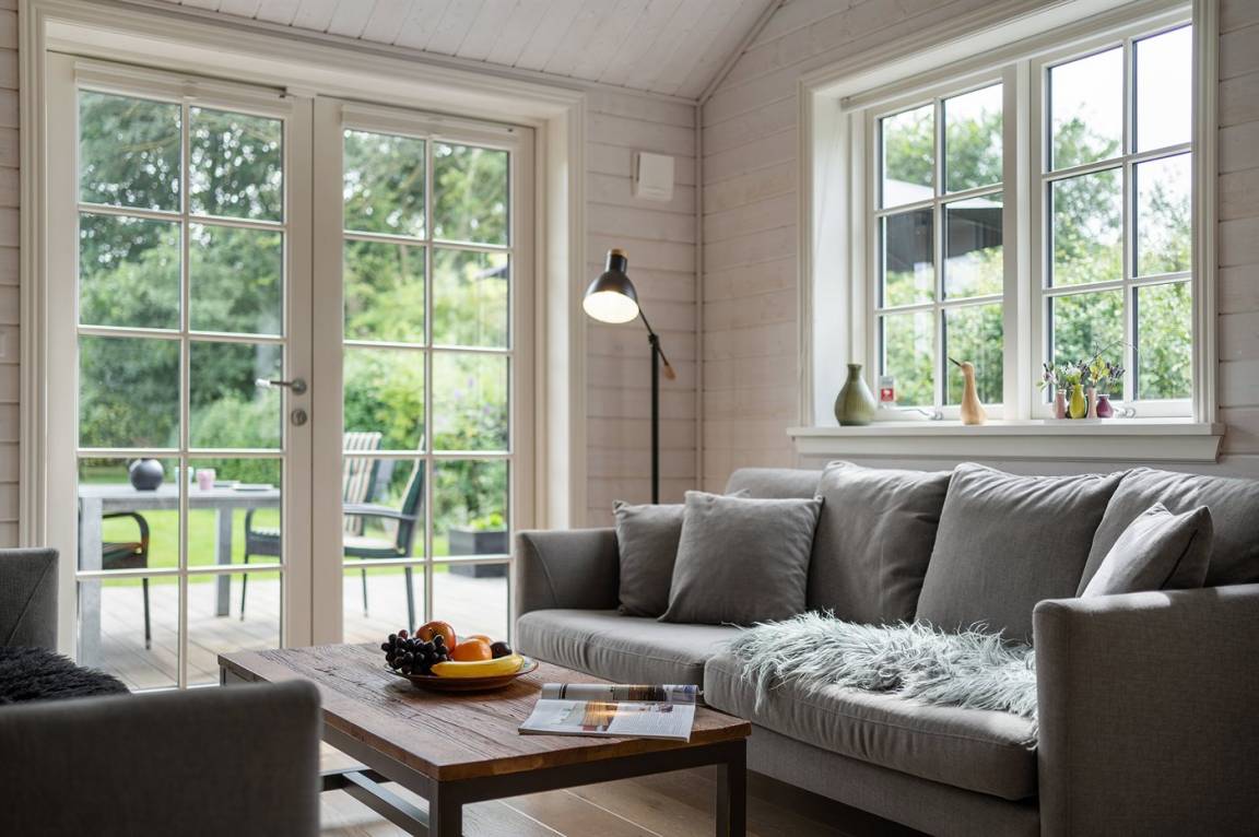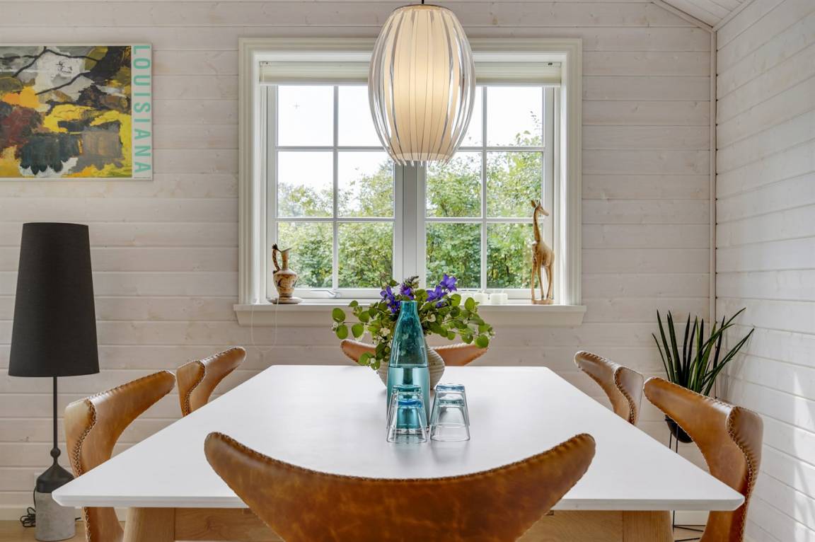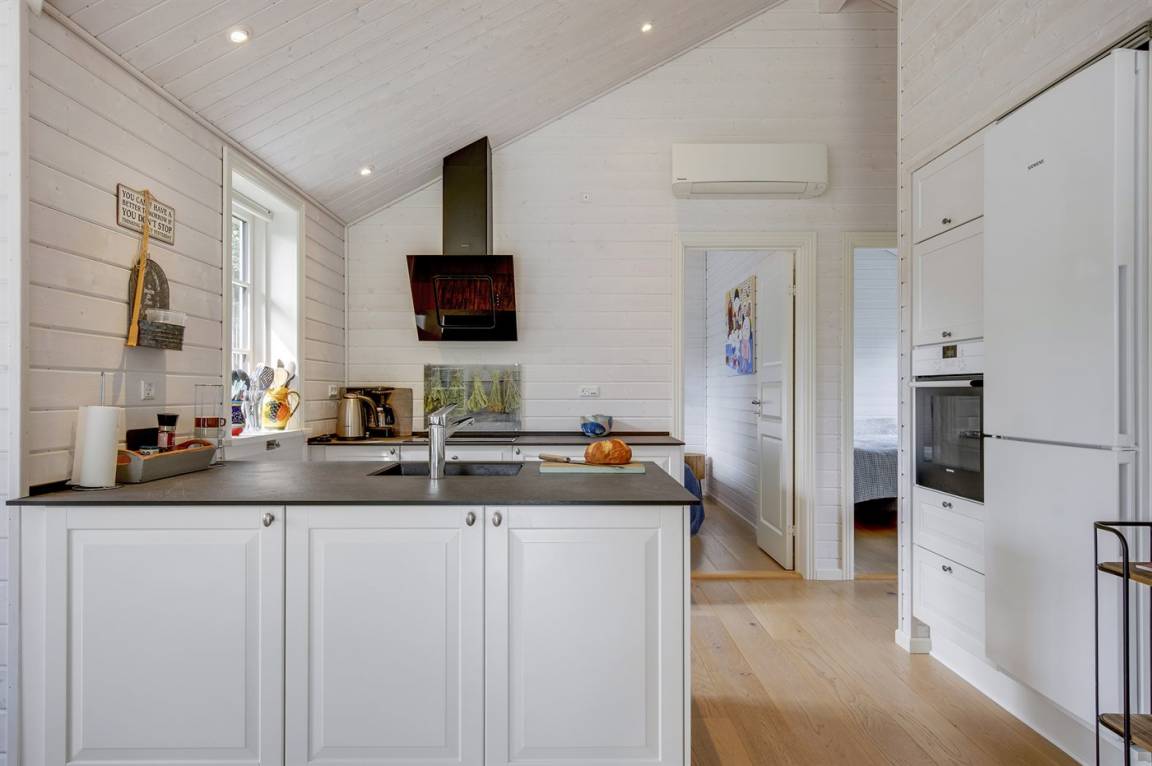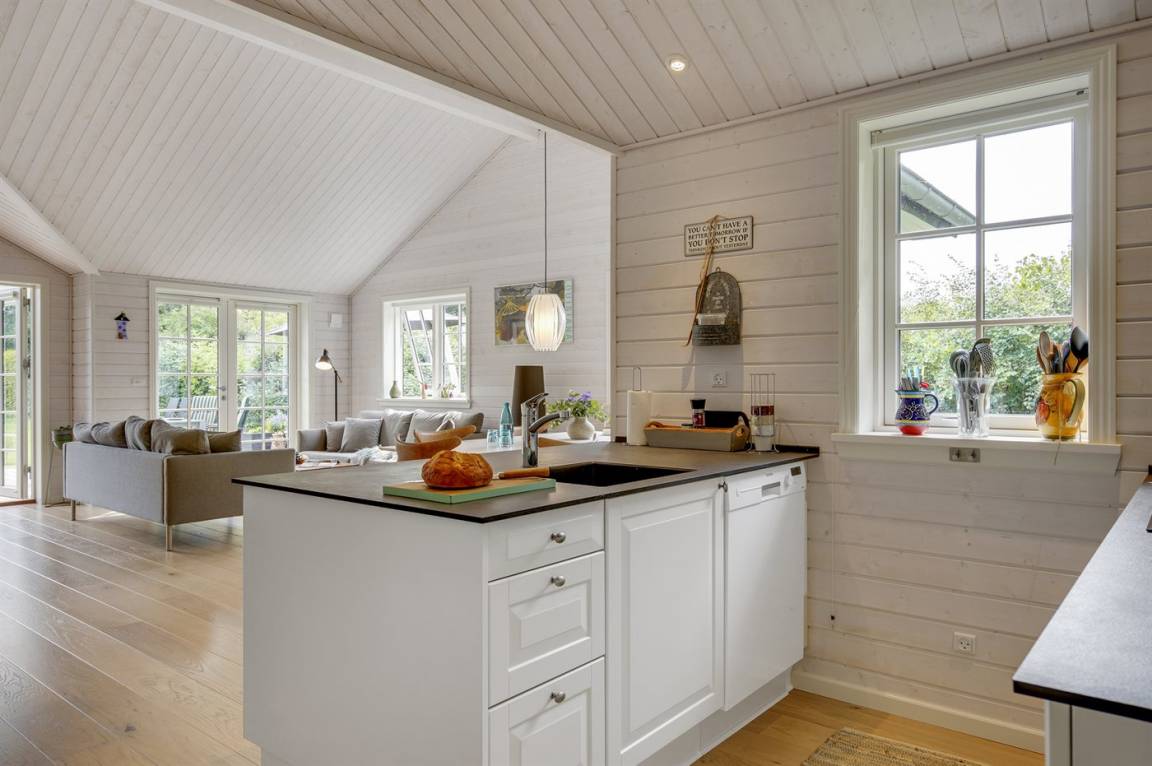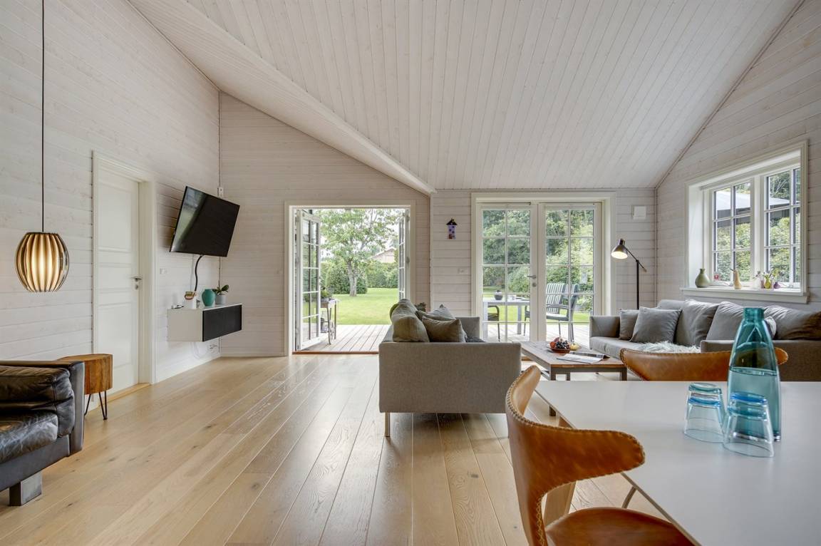 Das Haus ist stilsicher und geschmackvoll eingerichtet. Neben den hellen Materialien, die beim Bau des Hauses verwendet wurden, sorgen die großen Fensterfronten für viel Licht. Der natürliche Mittelpunkt des Hauses ist die offene Küche, die an Essbereich und Wohnzimmer angrenzt. Der Raum hat wie alle anderen im Haus eine hohe Decke, die für ein großzügiges Raumgefühl sorgt.