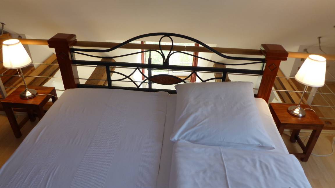Küche, Ess- und Wohnzimmer mit Panorama-Kaminofen, Schlafzimmer, Tageslichtbad mit Dreiecksbadewanne, Dusche, Bidet, WC, Treppe zur offenen Galerie mit Doppelbett oder 2 Einzelbetten, eigener Freisitz mit Gartenmöbeln und Grillmöglichkeit, gemütliches Wohnen unter wunderschönen freigelegten Holzbalken mit Panorama- und Wasserblick
