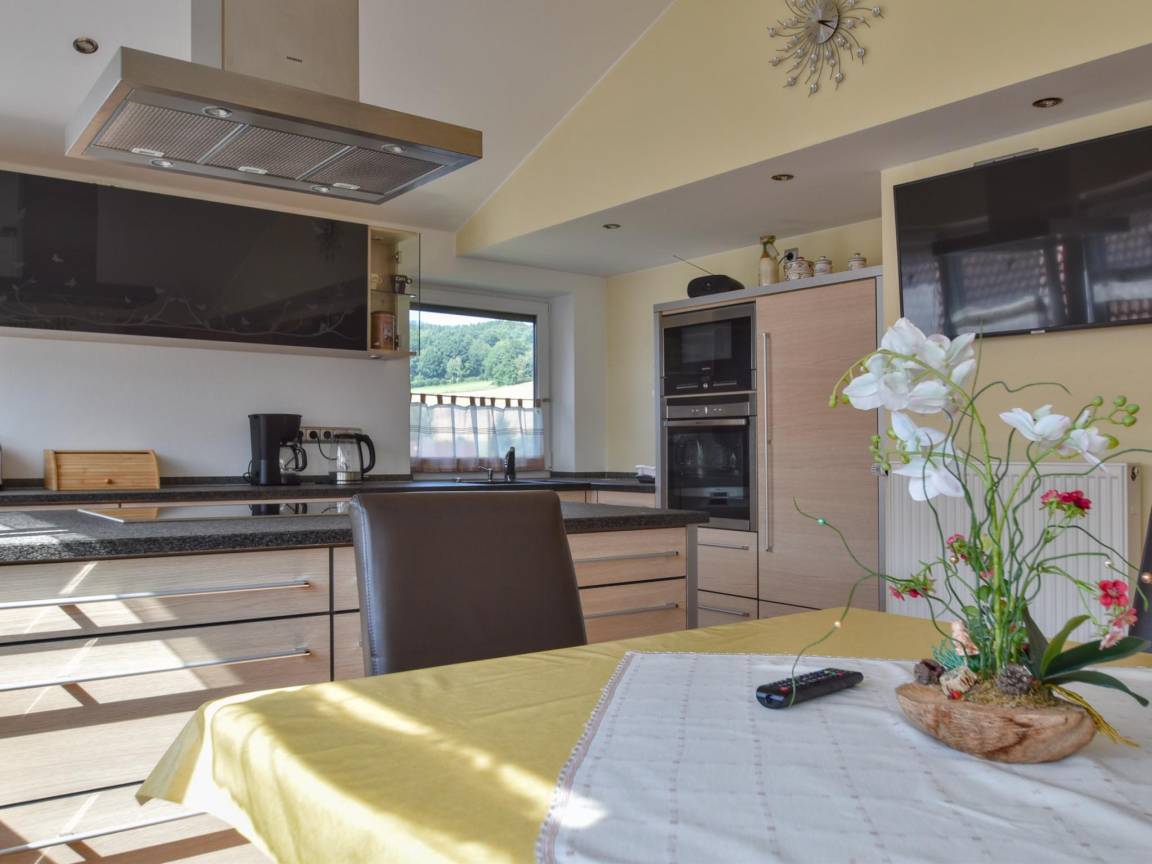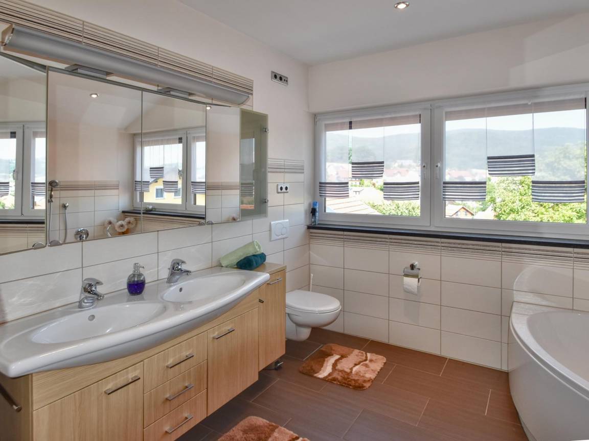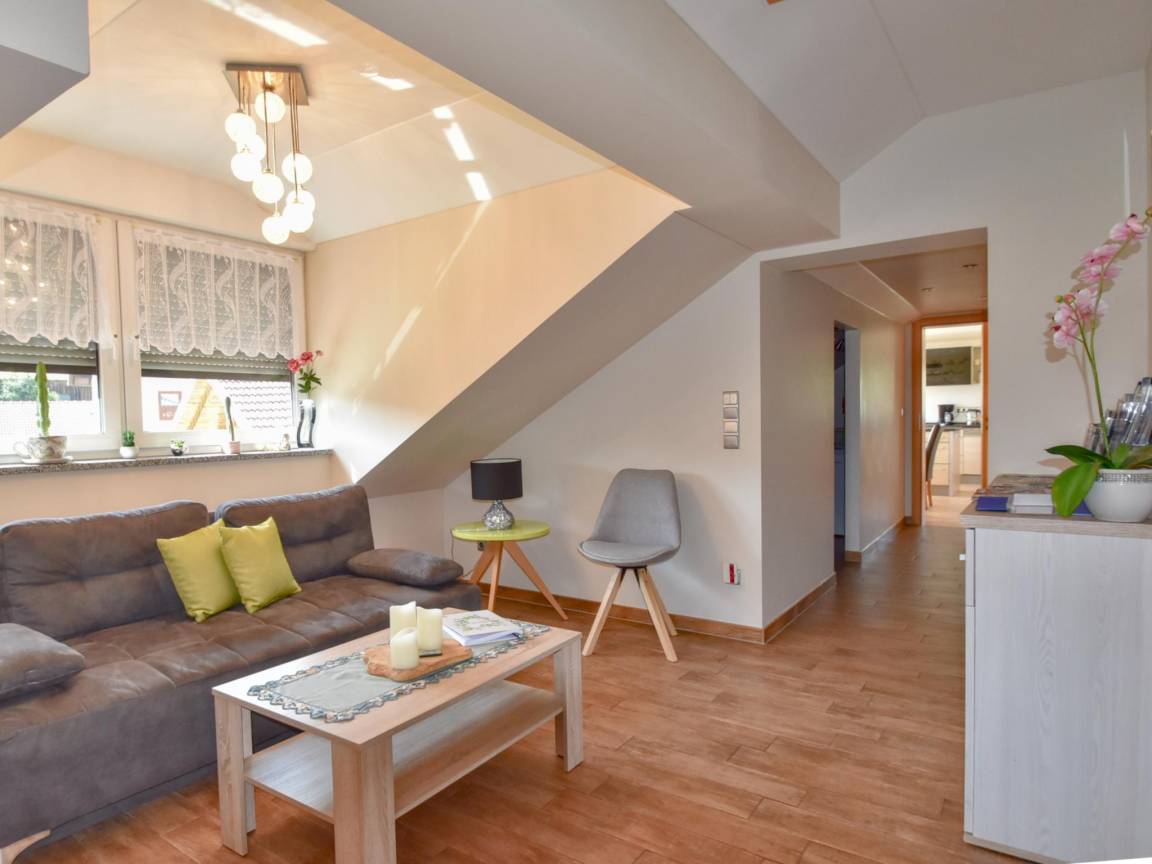 Hausbeschreibung : Moderne Ferienwohnung mit großen Fensterfronten, die viel Tageslicht hereinlassen lassen und eine freundliche, offene Atmosphäre schaffen. Im großzügigen Wohnzimmer finden Sie Platz zum Zusammensitzen und der angrenzende offene Leseraum dient als ruhiger Rückzugsort zum Schmökern und Abschalten. Highlight ist die elegante Eckbadewanne im hellen Bad. Ein Balkon mit schöner Aussicht sowie der große Garten mit Spielgeräten für Kinder machen die Wohnung ideal für Familien und Naturliebhaber