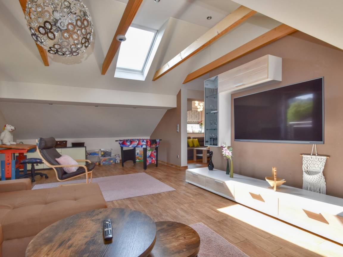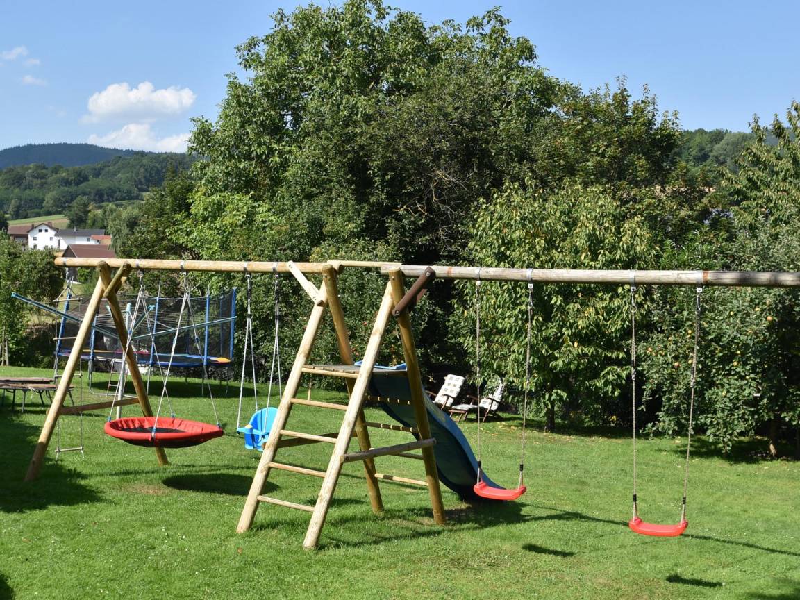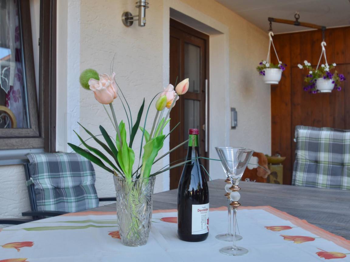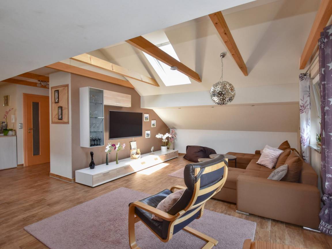 Hausbeschreibung : Moderne Ferienwohnung mit großen Fensterfronten, die viel Tageslicht hereinlassen lassen und eine freundliche, offene Atmosphäre schaffen. Im großzügigen Wohnzimmer finden Sie Platz zum Zusammensitzen und der angrenzende offene Leseraum dient als ruhiger Rückzugsort zum Schmökern und Abschalten. Highlight ist die elegante Eckbadewanne im hellen Bad. Ein Balkon mit schöner Aussicht sowie der große Garten mit Spielgeräten für Kinder machen die Wohnung ideal für Familien und Naturliebhaber