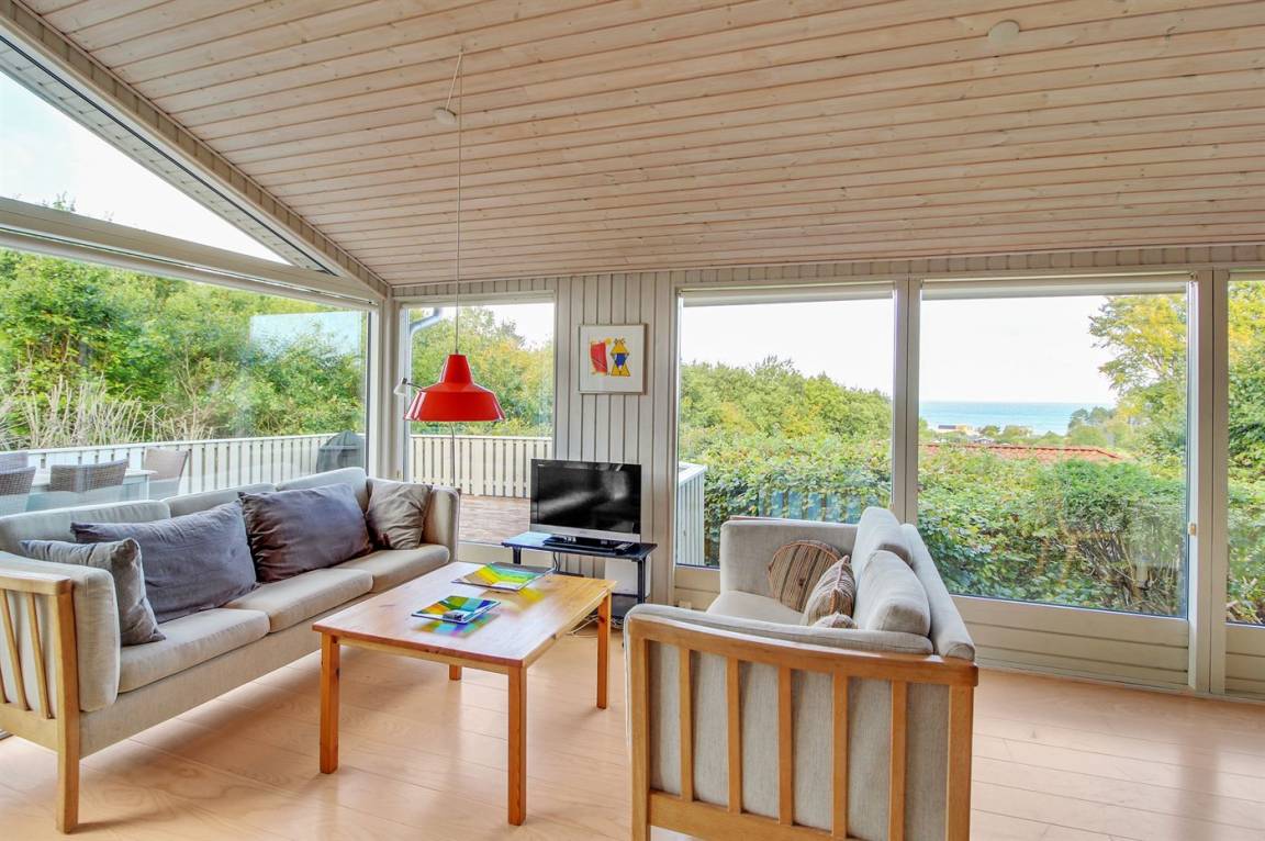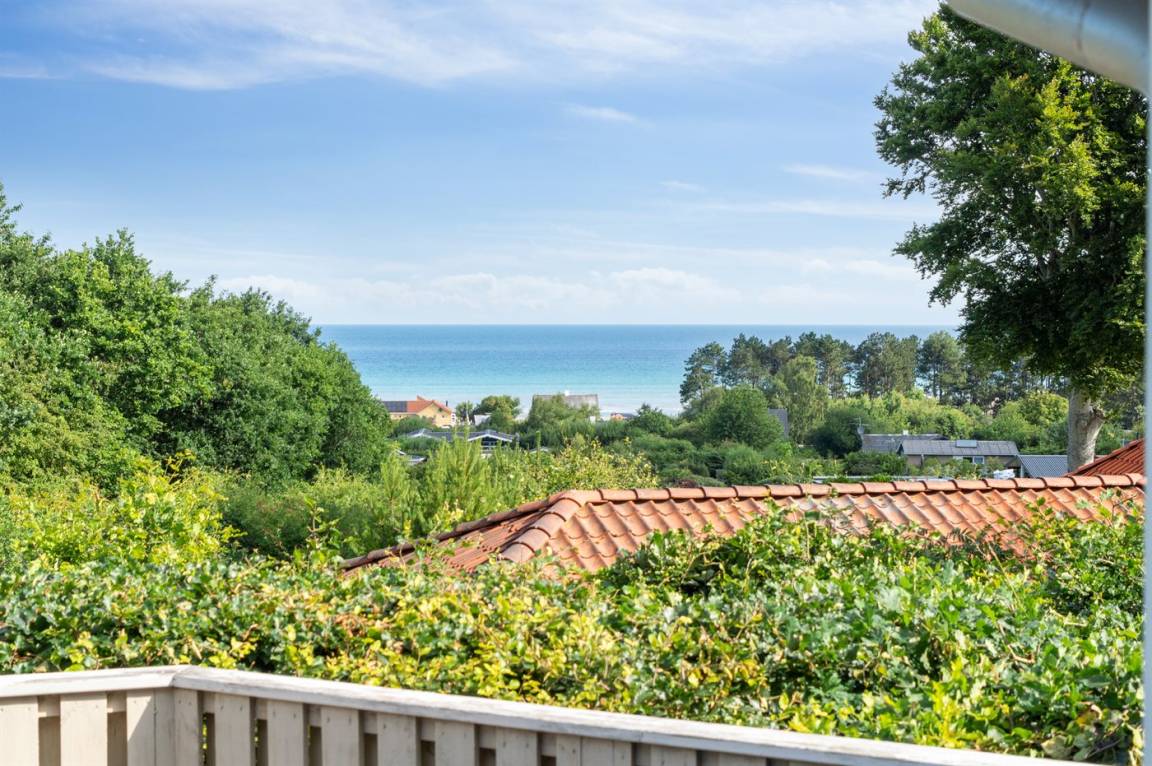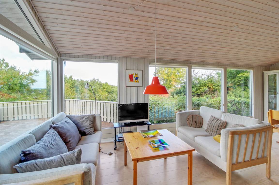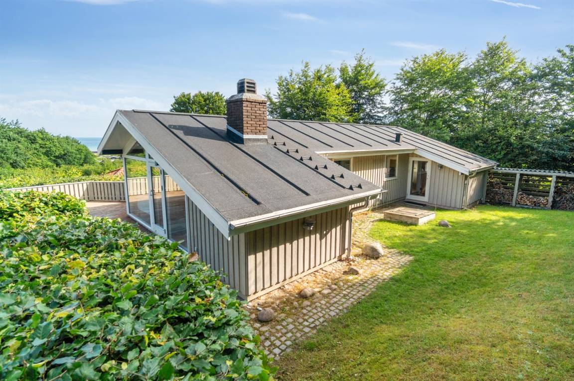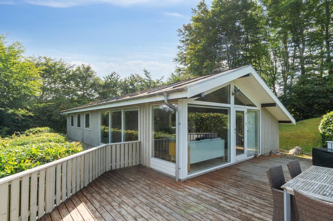 Auf einem leicht hügeligen Grundstück mit Meerblick – sowohl vom Haus als auch vom Grundstück aus, liegt dieses gepflegte Ferienhaus. Das Haus hat ein großes, hell eingerichtetes Wohnzimmer. Zum Haus gehören eine westlich ausgerichtete Holzterrasse mit direktem Zugang vom Wohnzimmer sowie eine östlich ausgerichtete Holzterrasse.