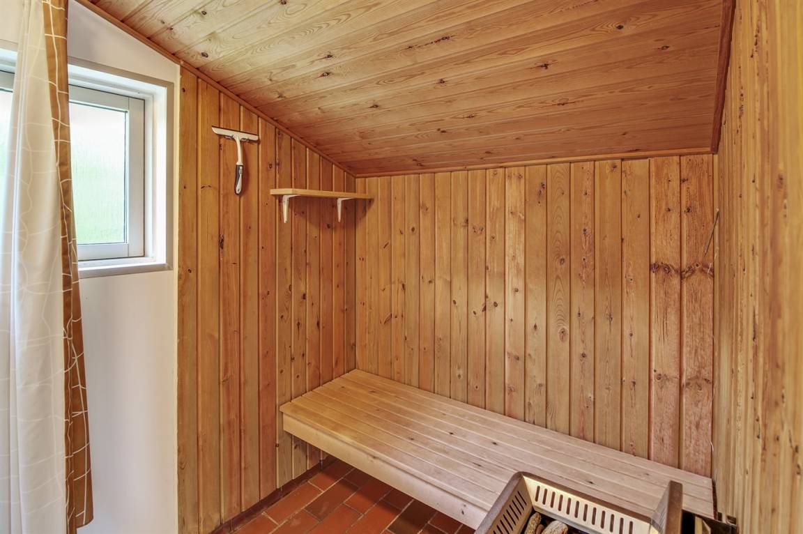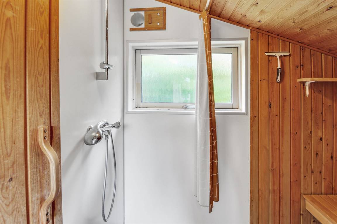 Das Badezimmer hat eine Duschnische und eine Toilette. In der Sauna und im Eingangsbereich gibt es Fußbodenheizung.
