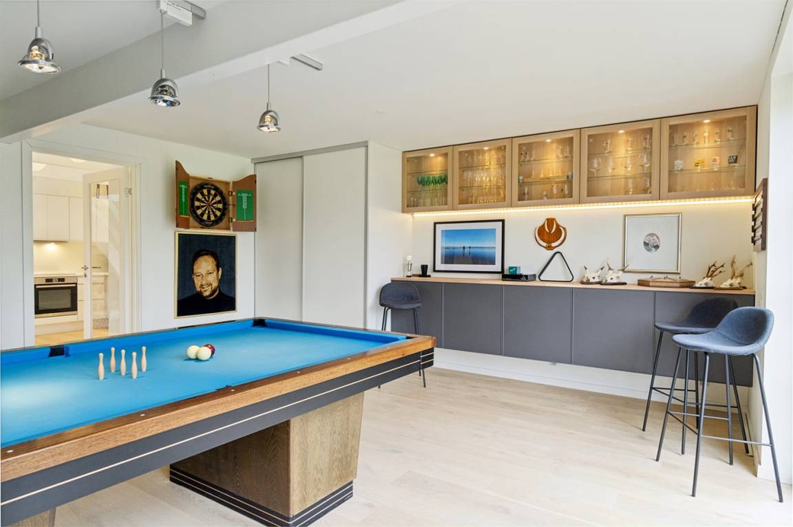 Das eine Haus hat eine Wohnfläche von 248 m² mit 8 Schlafplätzen und das andere Haus hat eine Wohnfläche von 160 m² mit 4 Schlafplätzen, also insgesamt 12 Schlafplätze. Beide Häuser treten nett und einladend hervor mit hohen Decken sowie einer hellen und modernen Einrichtung. Beide Häuser sind mit all dem eingerichtet, was man sich für einen gelungenen Urlaub nur wünschen kann. Hier kann man den Urlaub zusammen verbringen, sich jedoch auch je nach Bedürfnis zurückziehen. Das Anwesen besticht außerdem mit einem schönen Aktivitätsraum, wo Billard und Darts zur Verfügung stehen und wo alle vergnügliche Stunden verbringen können.