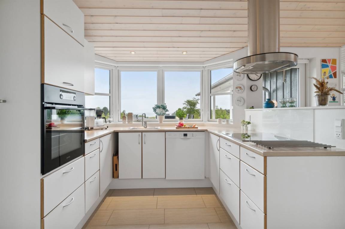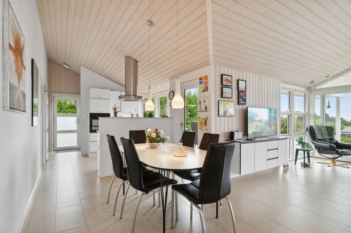 Das Innere des Hauses tritt hell und modern hervor mit einer guten Raumaufteilung, die das Haus besonders gut für die Familie mit Kindern geeignet macht. Der Mittelpunkt des Hauses ist die große, schöne Küche mit Essbereich, die mit dem Wohnzimmer kombiniert ist, wobei die großen Fenster den schönen Ausblick wirklich in den Vordergrund stellen. Selbst von der Küche aus hat man einen schönen Ausblick.
