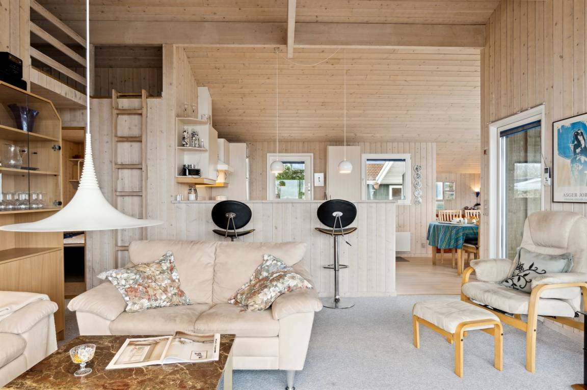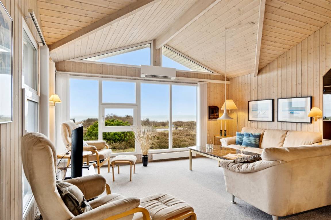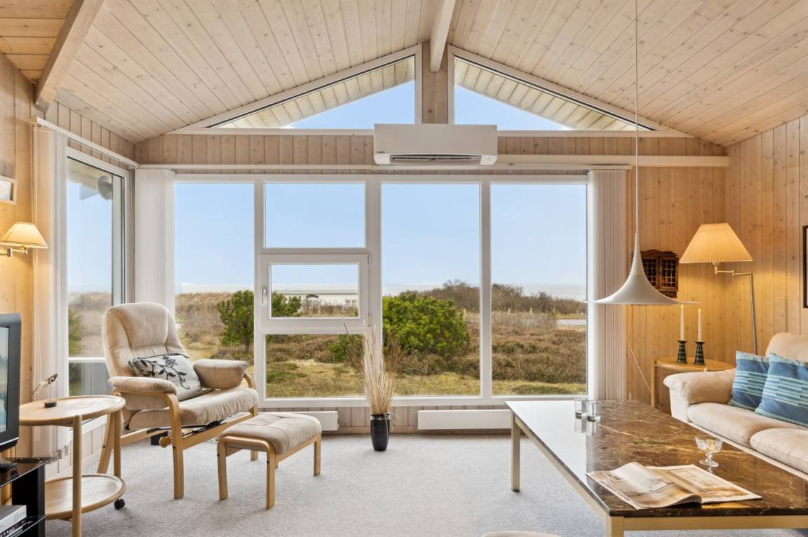 Der Mittelpunkt des Hauses ist das große Wohnzimmer, in dem die großen Fenster für einen wirklich guten Lichteinfall sorgen und von wo aus du die schöne Aussicht genießen kannst. Vom Wohnzimmer hast du außerdem direkten Zugang zur herrlichen Terrasse.