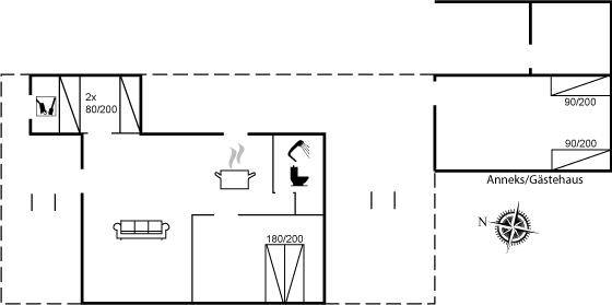 DraußenDie Ferienunterkunft liegt auf einem 1260 m² großen Gartengrundstück. Die Entfernung zum Meer beträgt 200 m. Die nächste Einkaufsmöglichkeit liegt 1500 m entfernt. Es steht ein offenes Terrassenareal zur Verfügung. Außerdem gibt es überdachte Terrasse. Trampolin. Fußballtor. Außendusche. Es steht ein Grill zur Verfügung. Es steht ein Carport zur Verfügung. Parkplatz auf dem Grundstück.